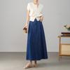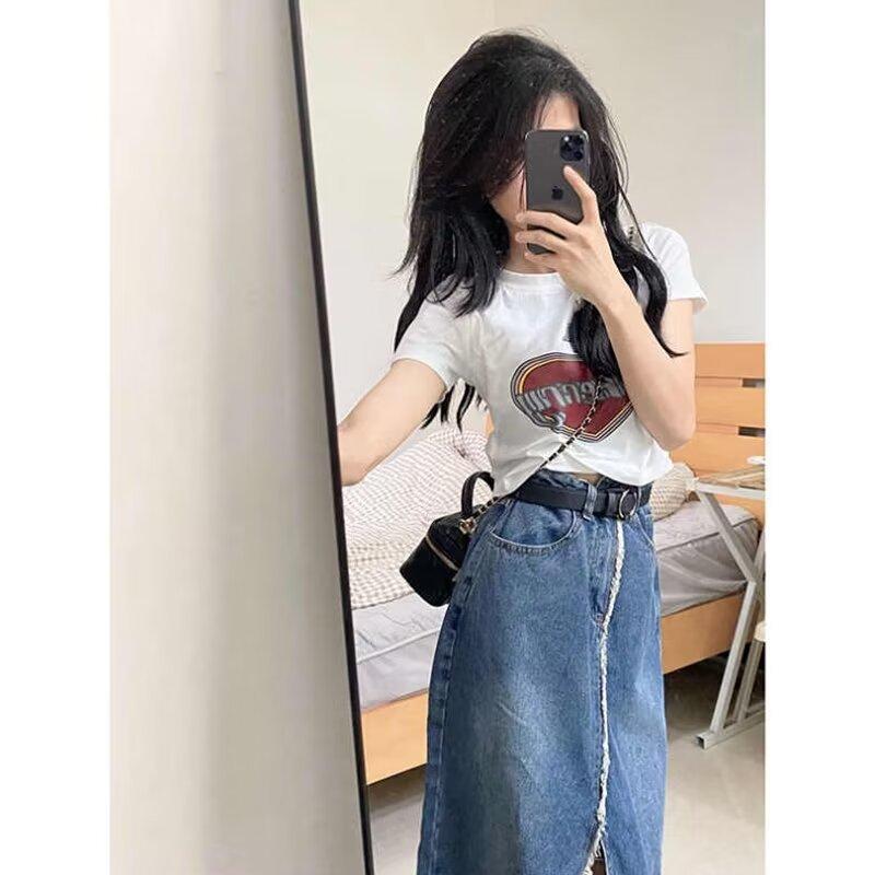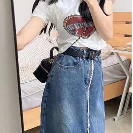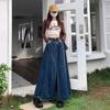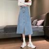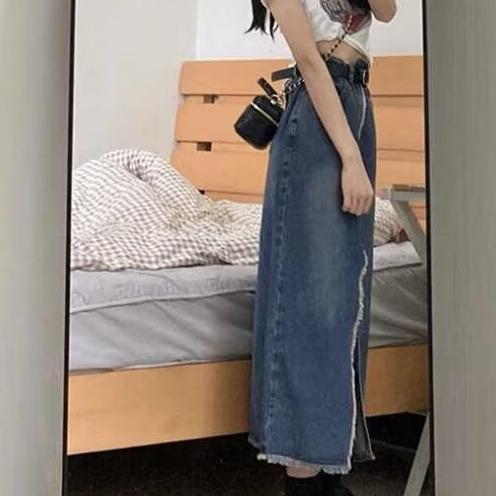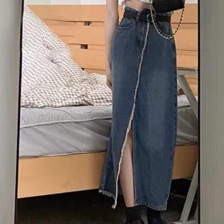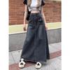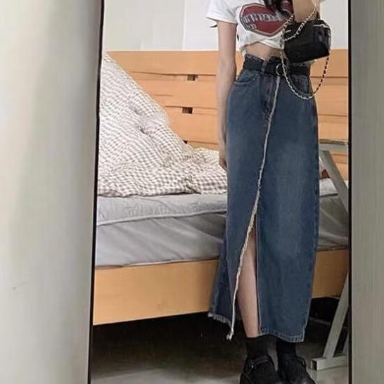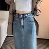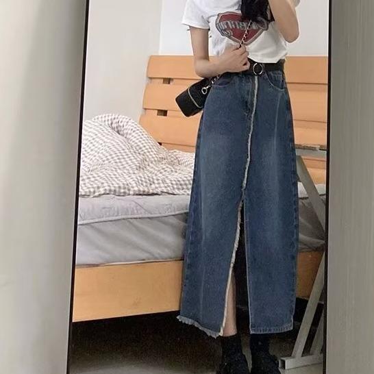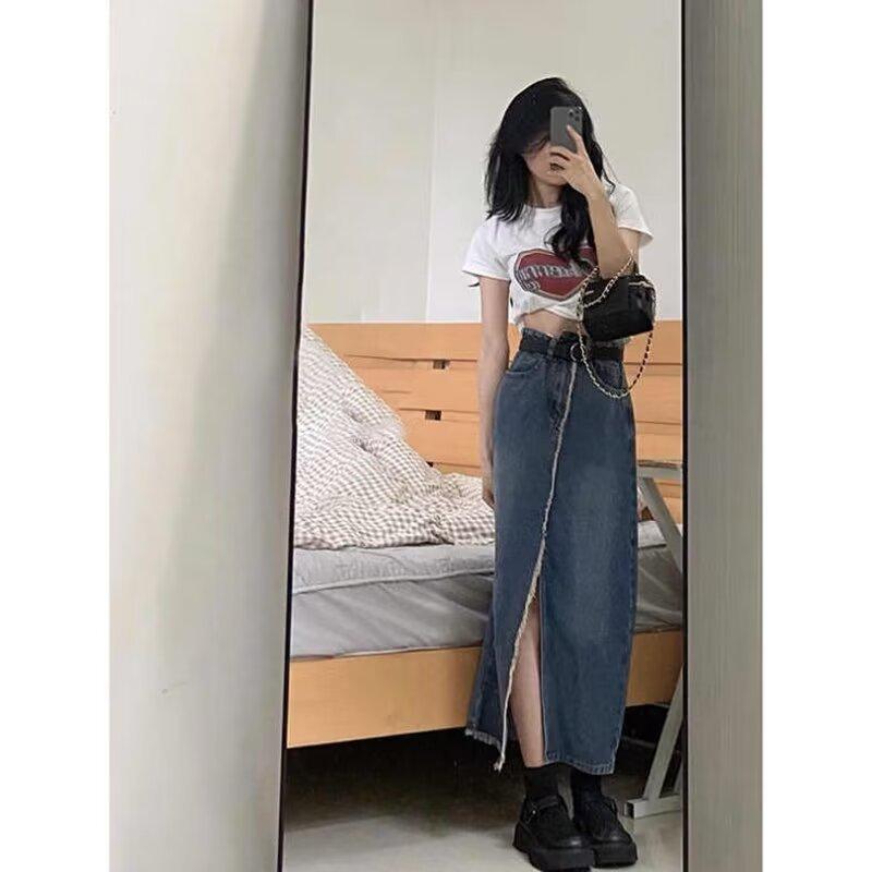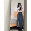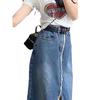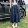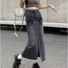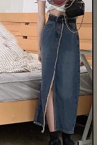 Falda Holgada de Verano Diseño Nicho Falda A-Line Midi Borde Crudo Cintura Alta Abertura Falda de Mezclilla para Mujer
