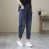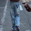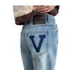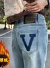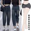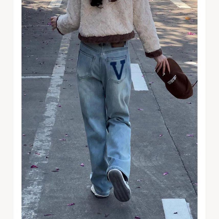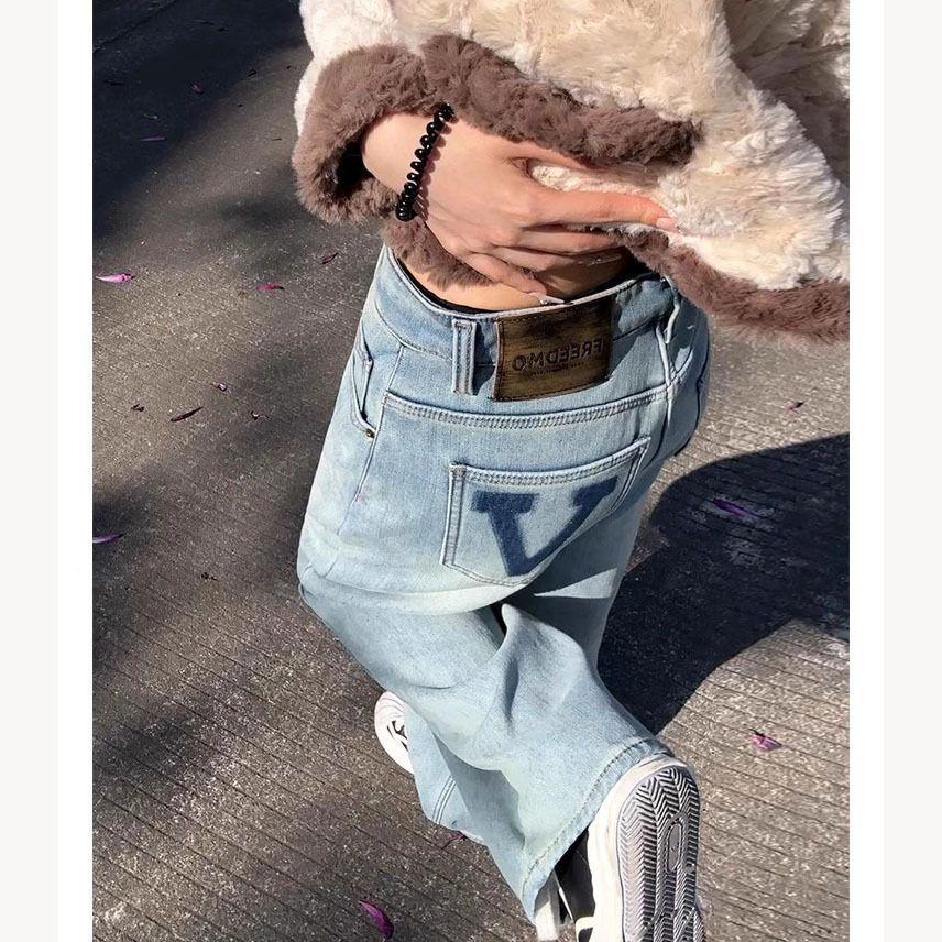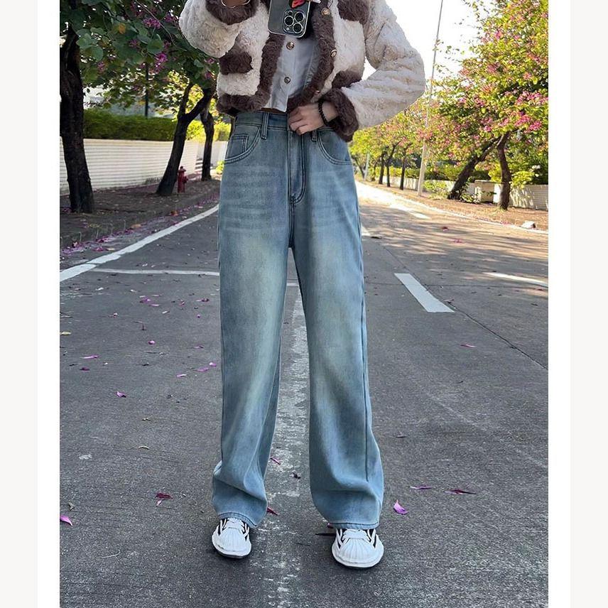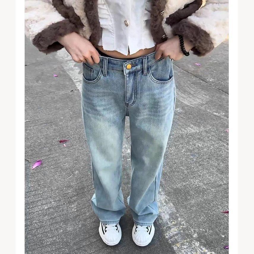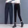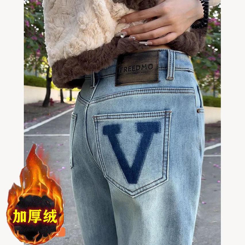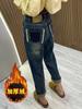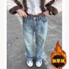 Jeans de Mujer Gruesos con Forro Polar Estampados de Moda con Bloques de Color Invierno Nuevo Cintura Alta Sueltos Adelgazantes Hasta el Piso Pantalones de Color Claro