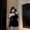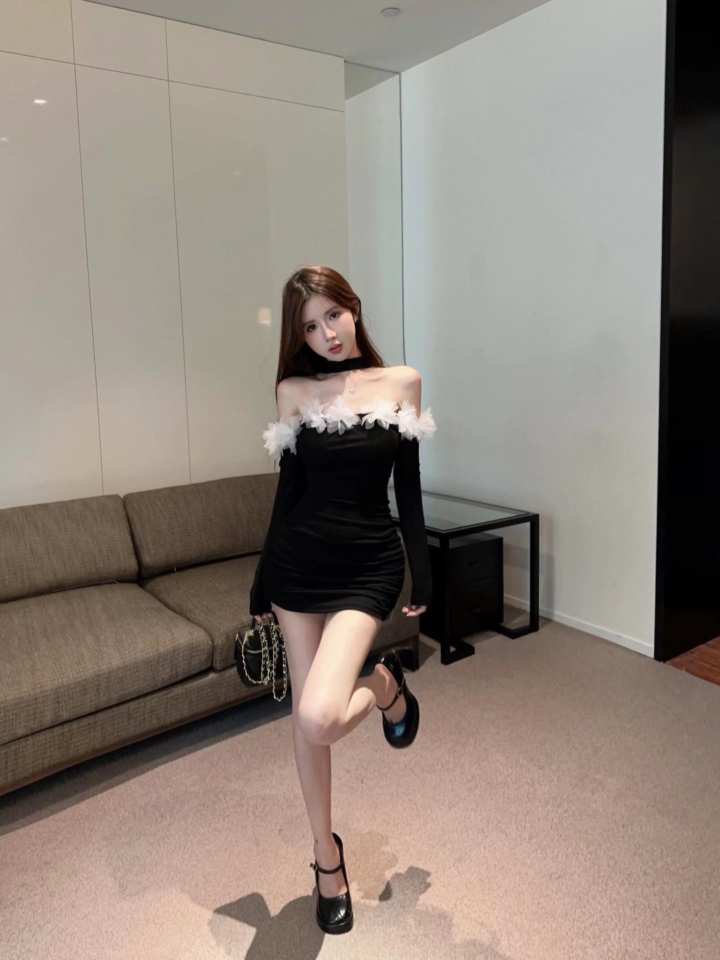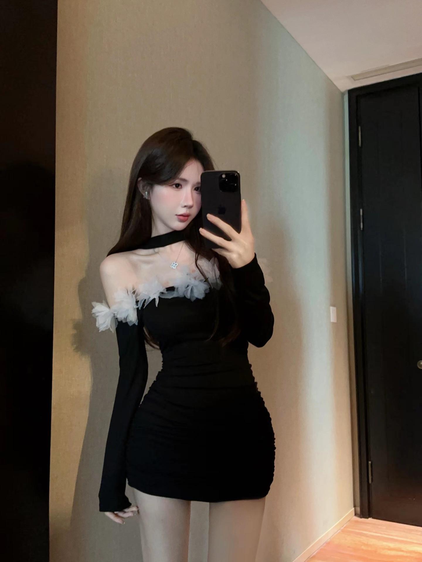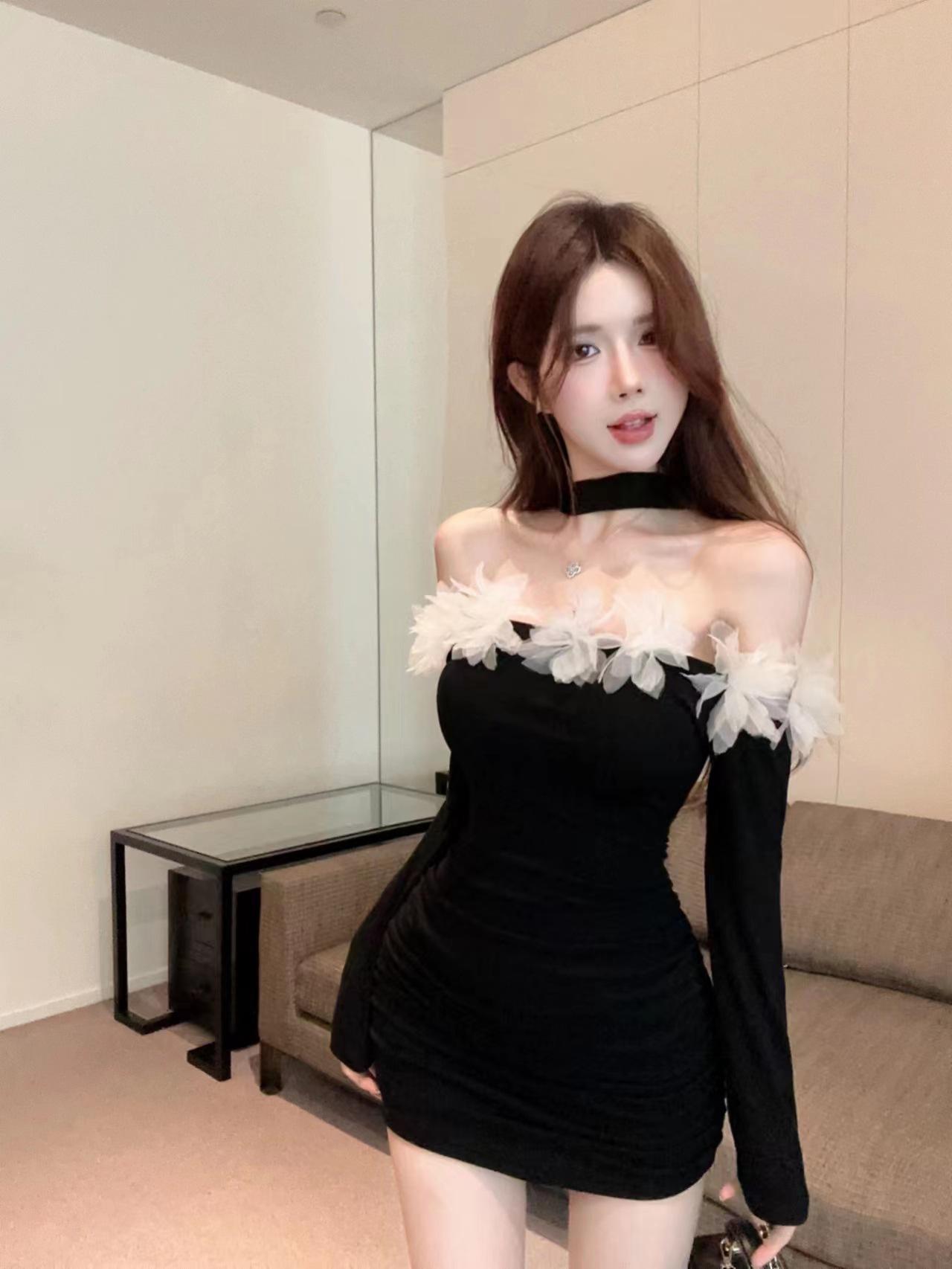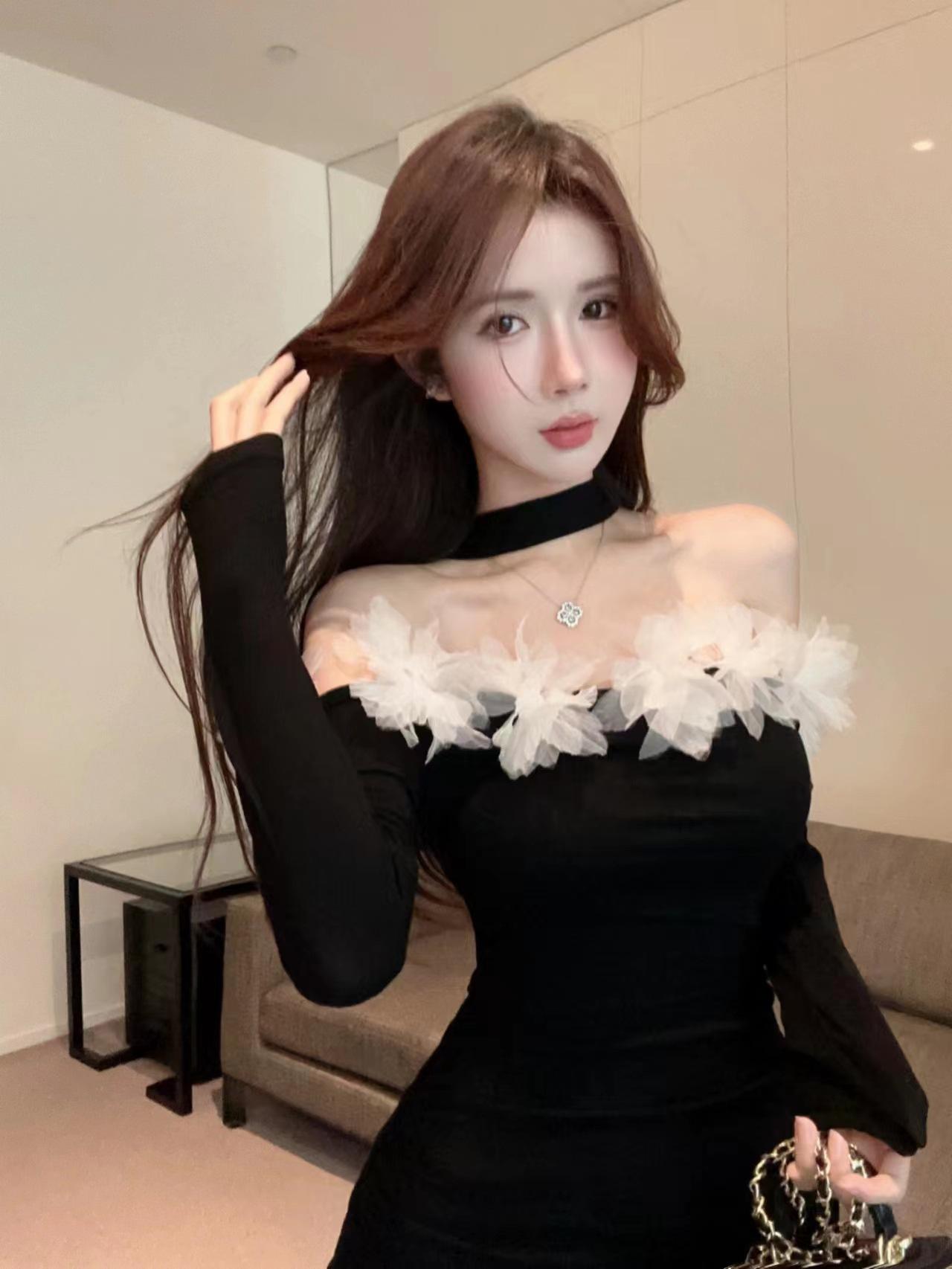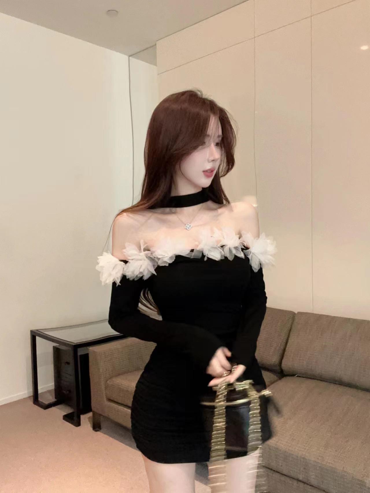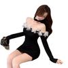 Vestido sexy de manga larga con cuello de un solo personaje y diseño de flores tridimensionales, sensación de ajuste ceñido, adelgazante, puro deseo, falda de cadera de moda.