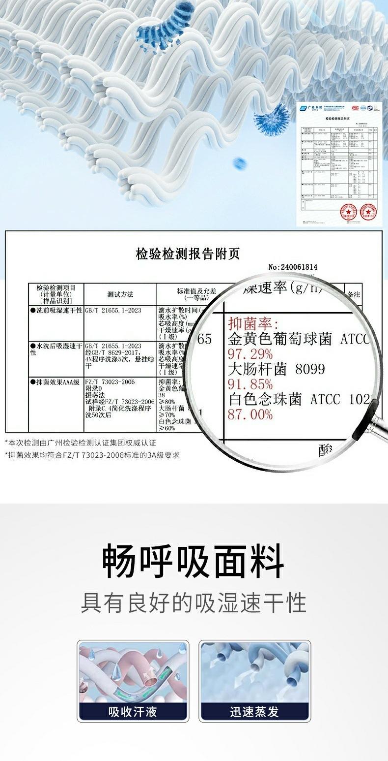 Descripción del Producto | Tejido absorbente de humedad, transpirable y antibacteriano, tejido transpirable, con buena absorción de humedad y propiedades de secado rápido. | ||