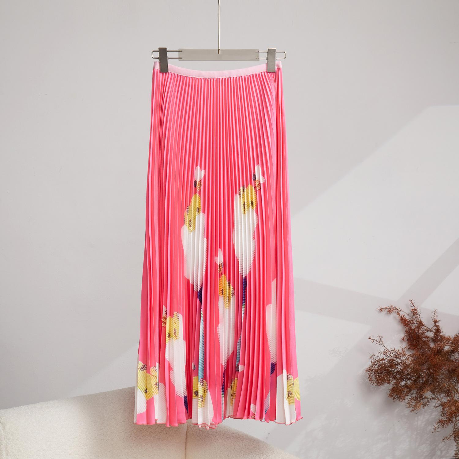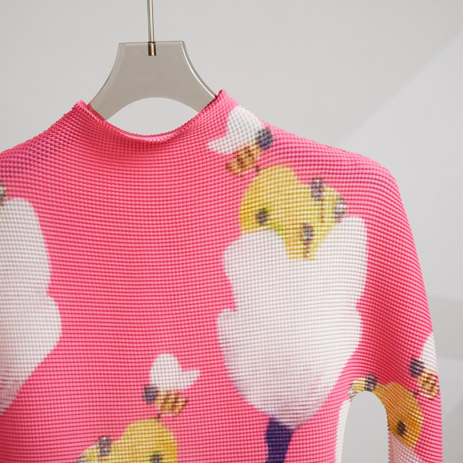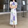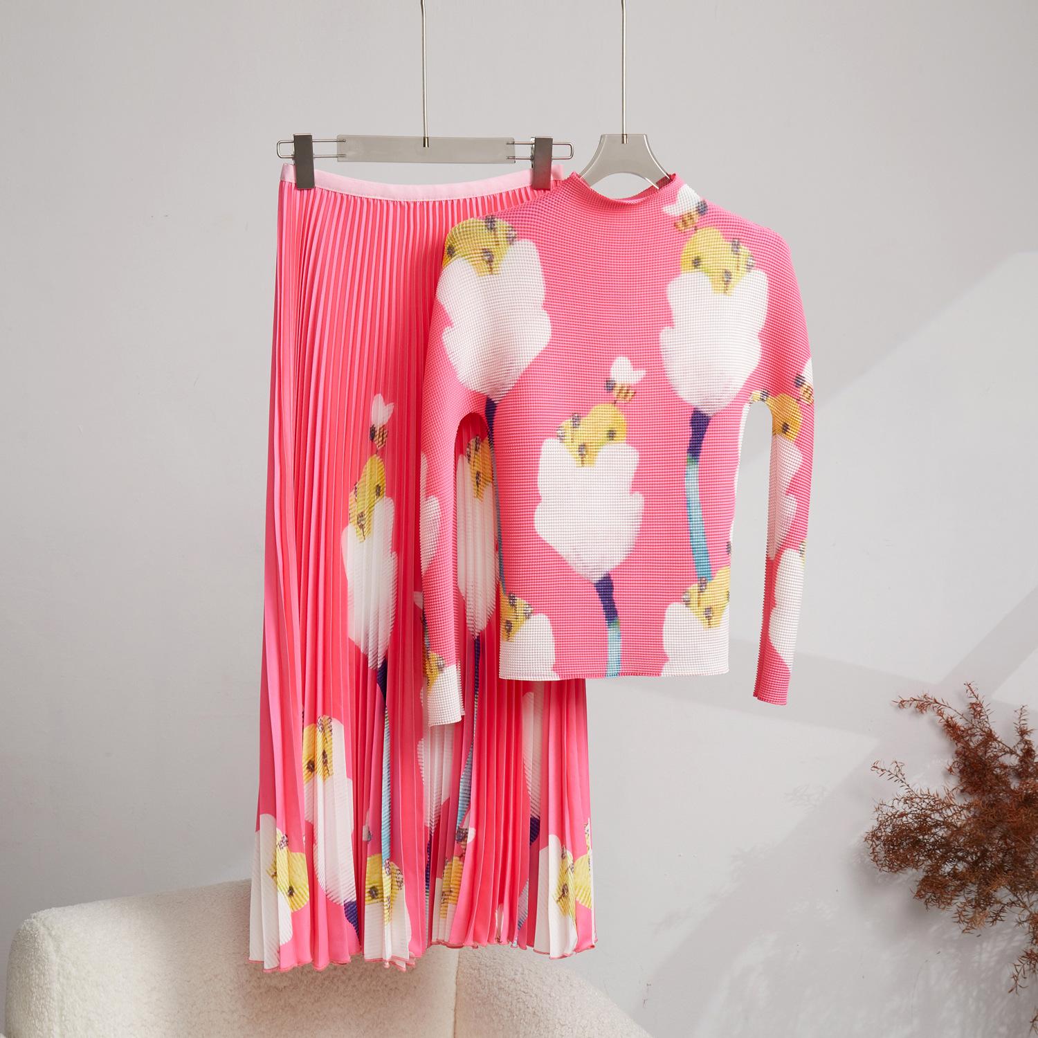 Ropa de gran venta de Xiaohongshu, traje plisado de moda para mujer, top ajustado estampado, falda plisada de manga larga, traje de dos piezas |