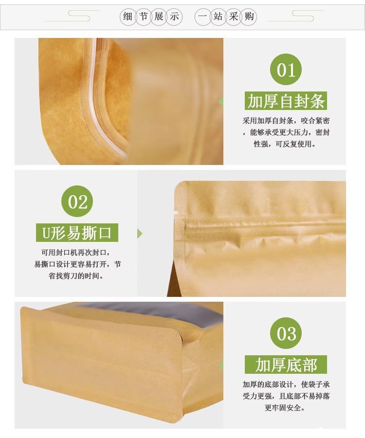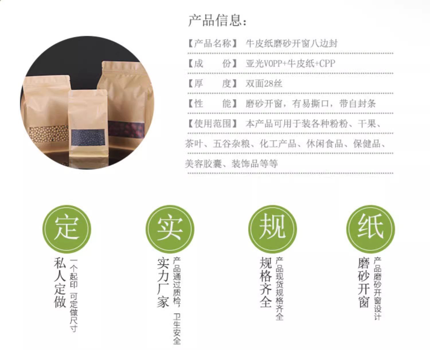 Bolsa de regalo con ventana esmerilada, bolsa de papel kraft sellada por ocho lados, bolsa sellada para té y comida, bolsa de plástico autoportante, bolsa de embalaje