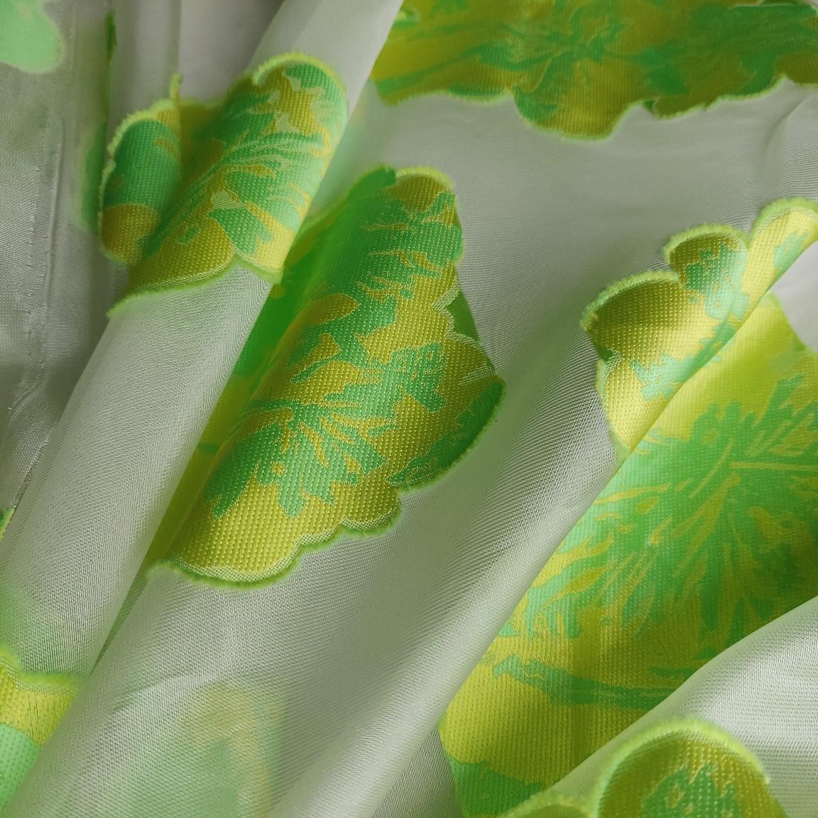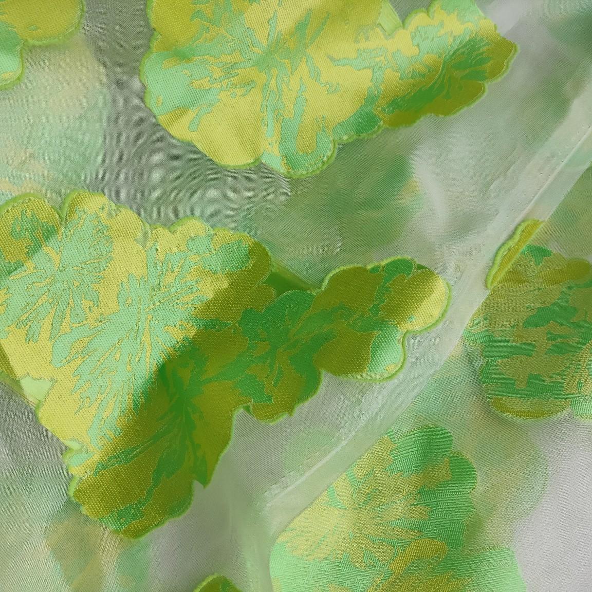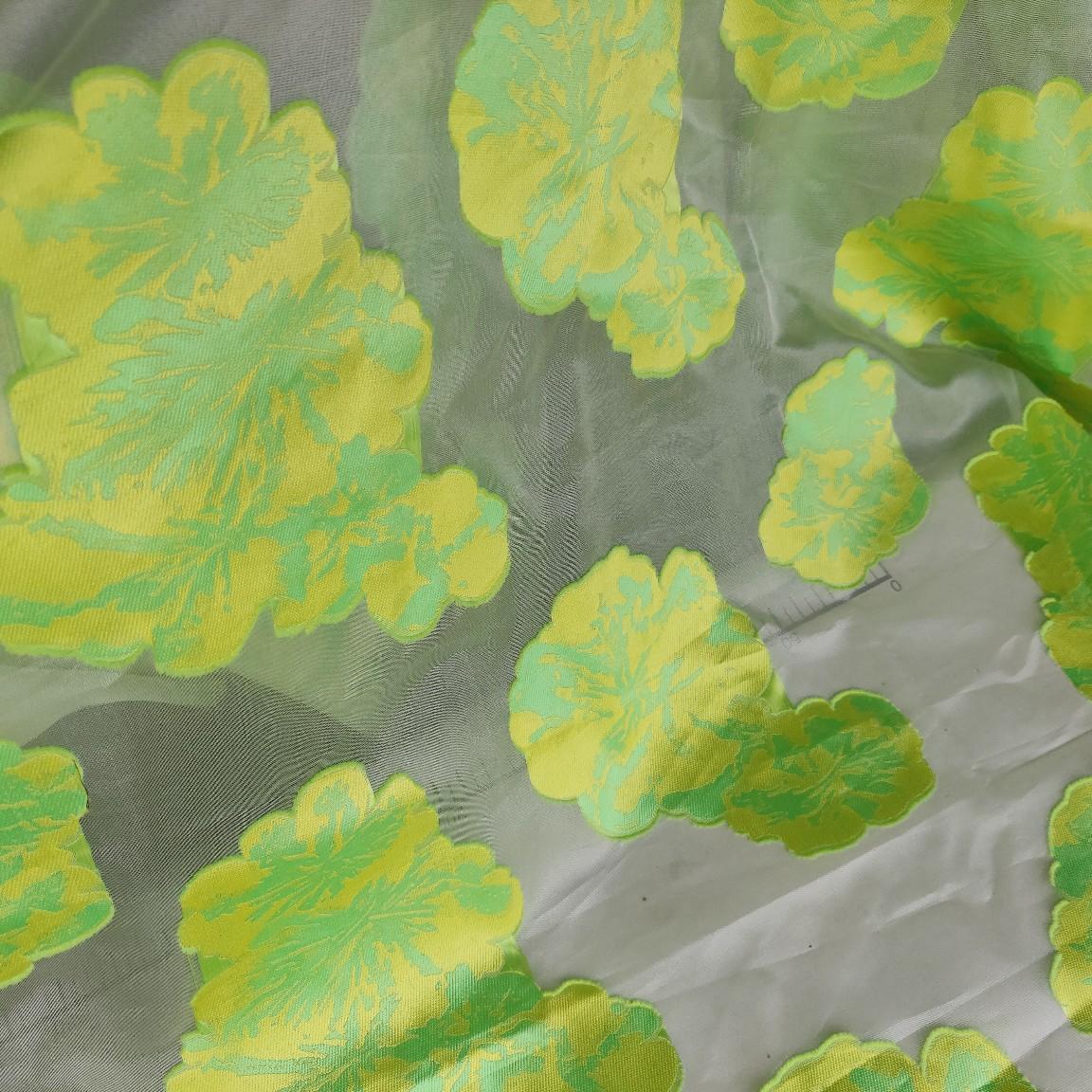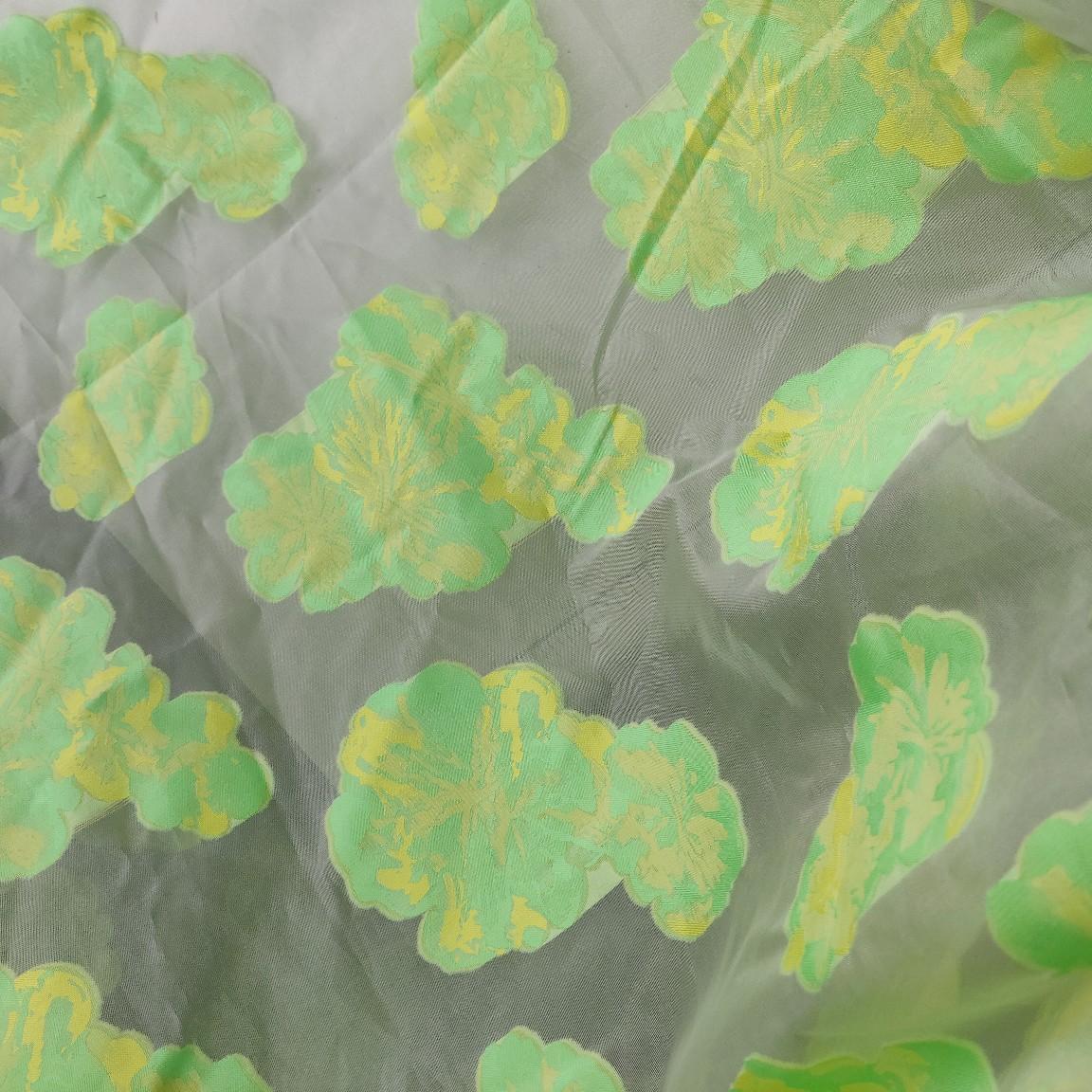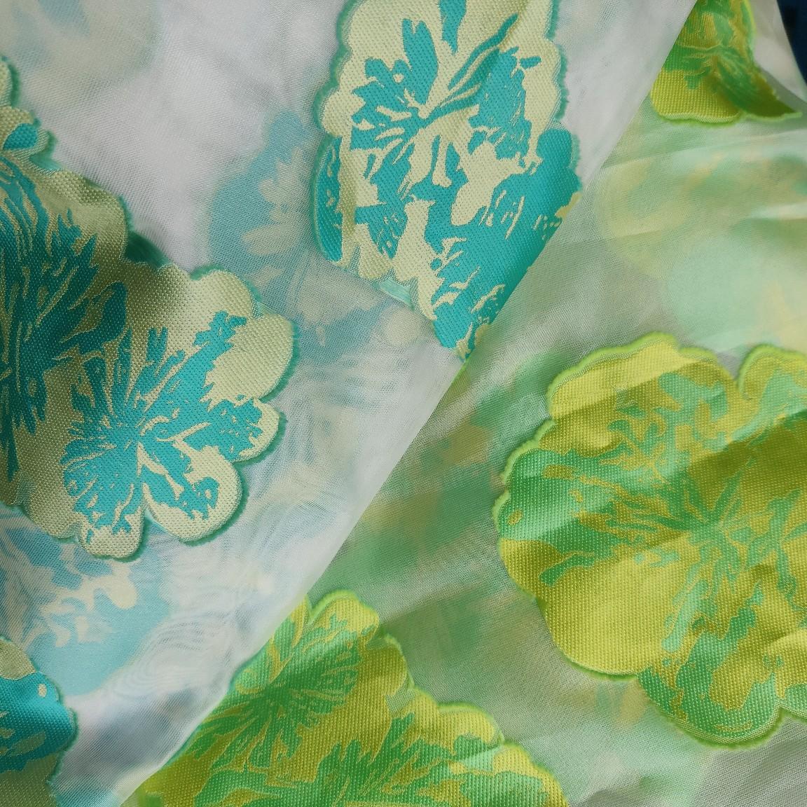 Tela jacquard de organza con flores de camelia cortadas en contraste de color verde para vestido, tela decorativa