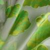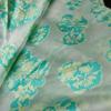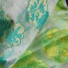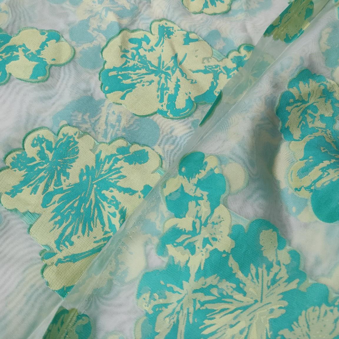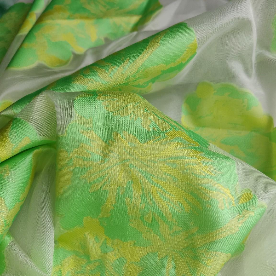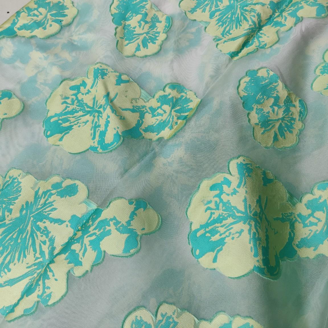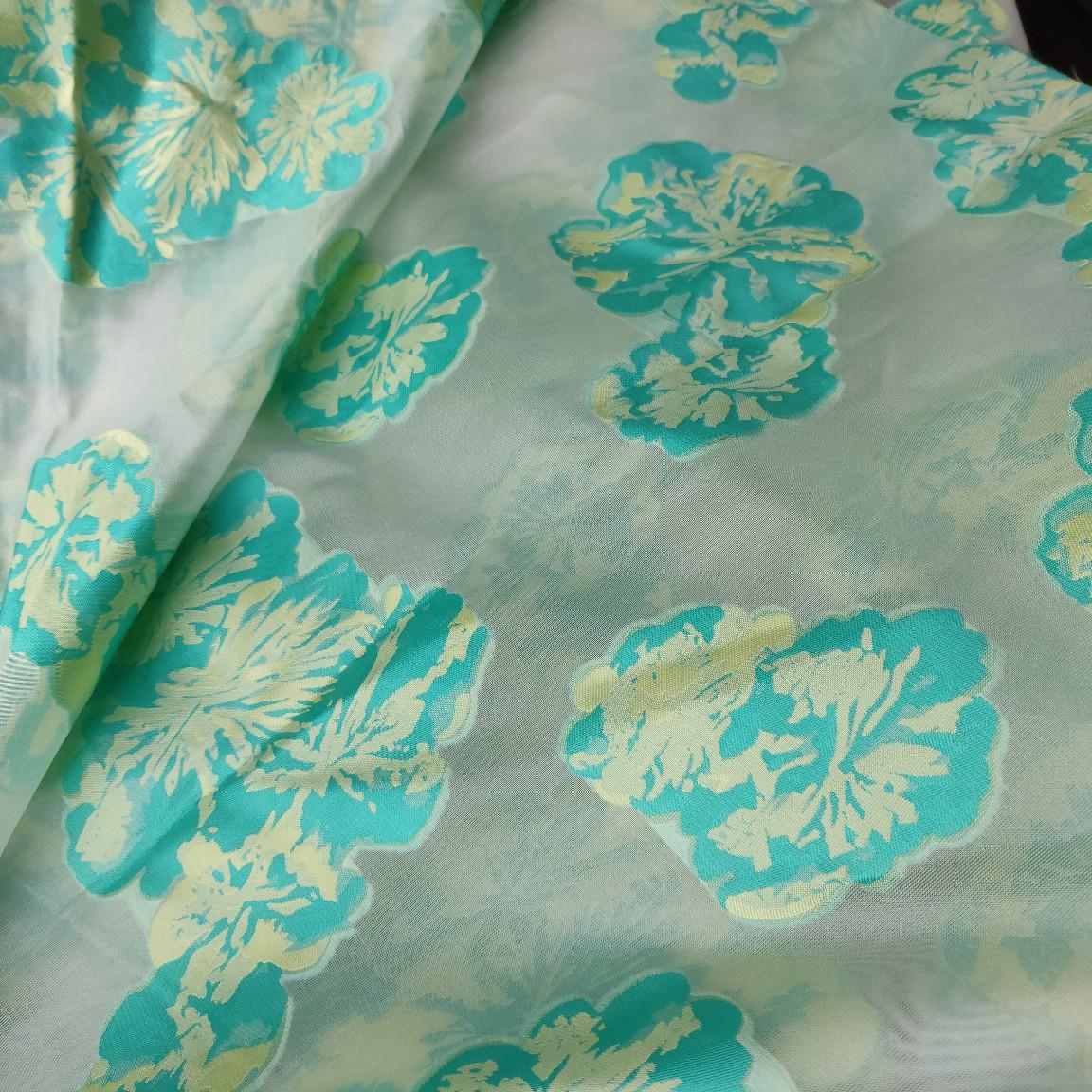 Tela jacquard de organza con flores de camelia cortadas en contraste de color verde para vestido, tela decorativa