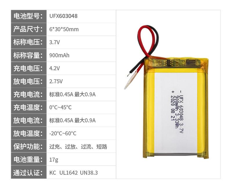 Batería de polímero de litio UFX603048 de 3,7 V y 900 mAh para lámpara LED de belleza, batería con certificación KC.