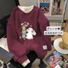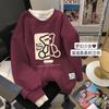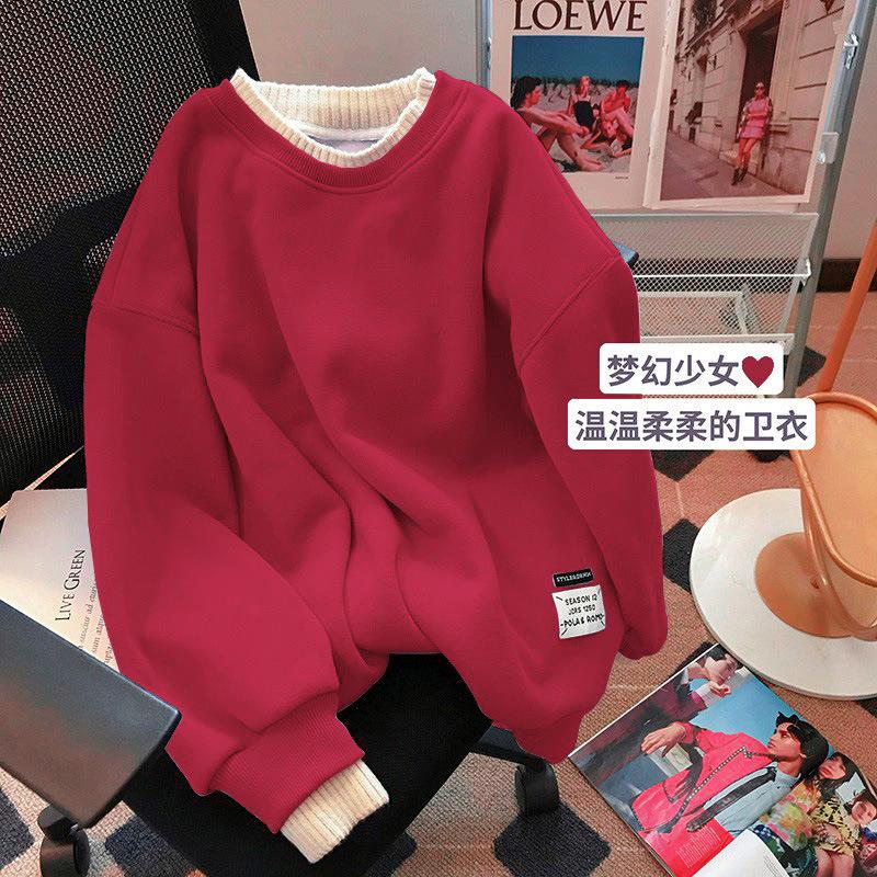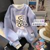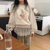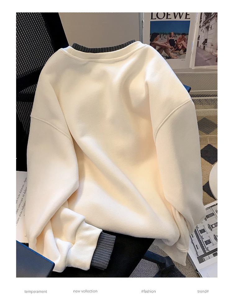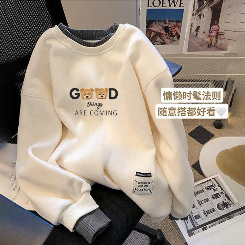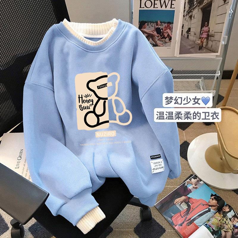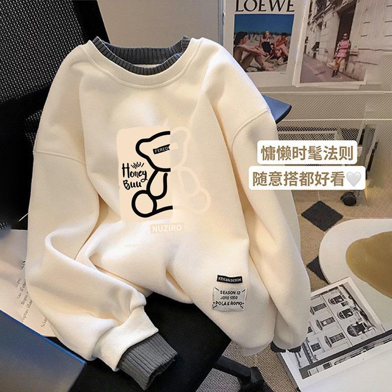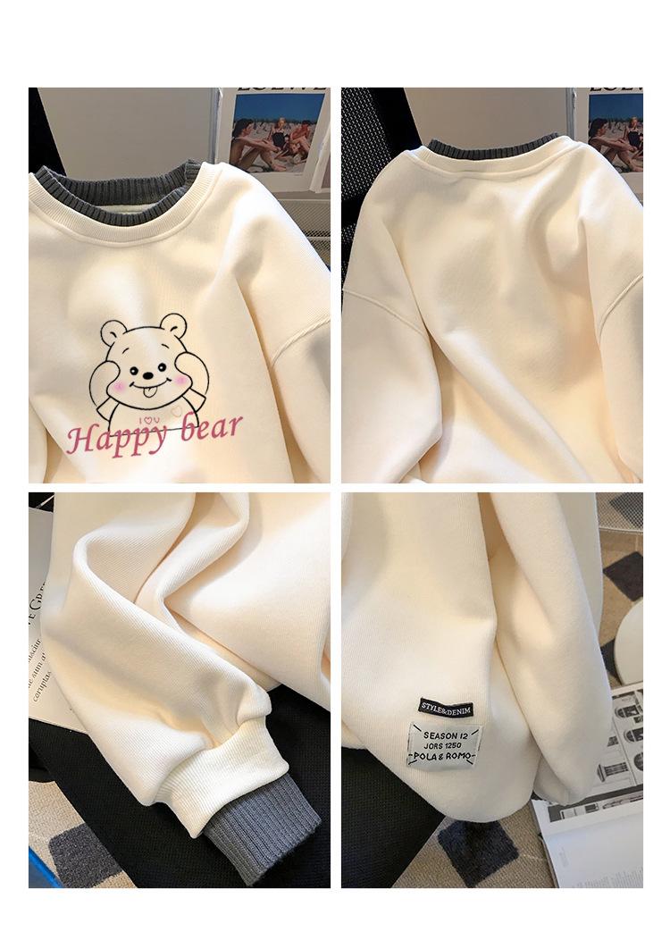 Suéter de otoño e invierno para mujer con forro polar, nuevo top holgado de dos piezas falsas con cuello redondo, lindo oso, suéter grueso, ropa de mujer