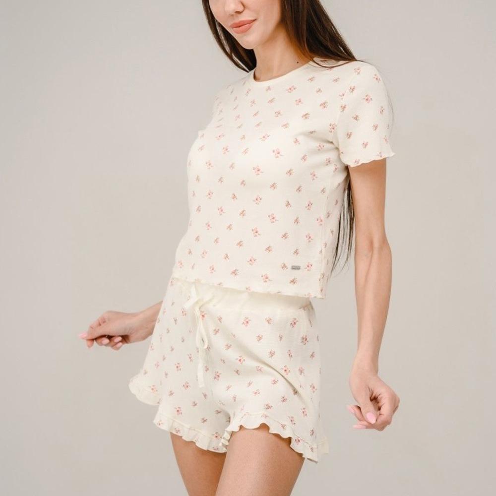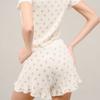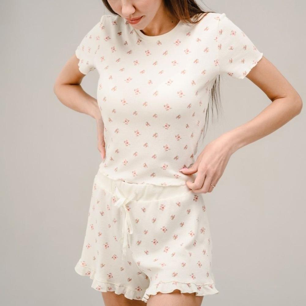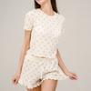 Pijama 100 % algodón para mujer, personalizado transfronterizo, de estilo europeo y americano, con estampado de manga corta y pantalones cortos con volantes, conjunto informal de dos piezas para el hogar.