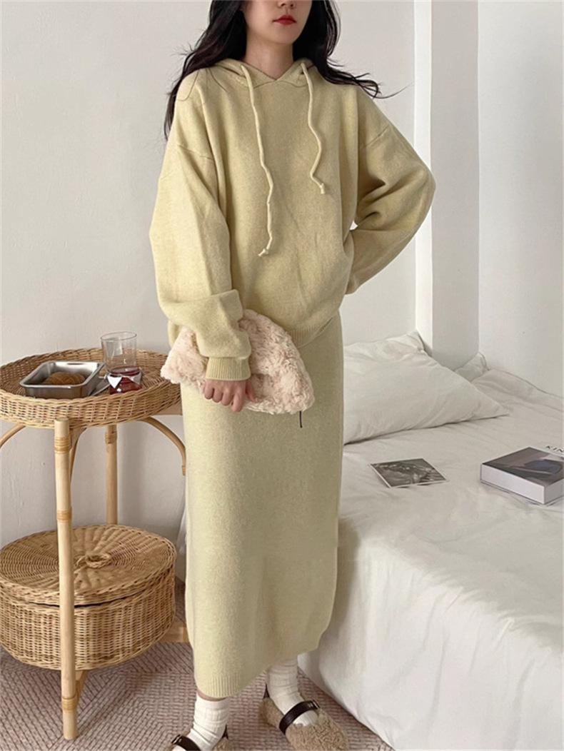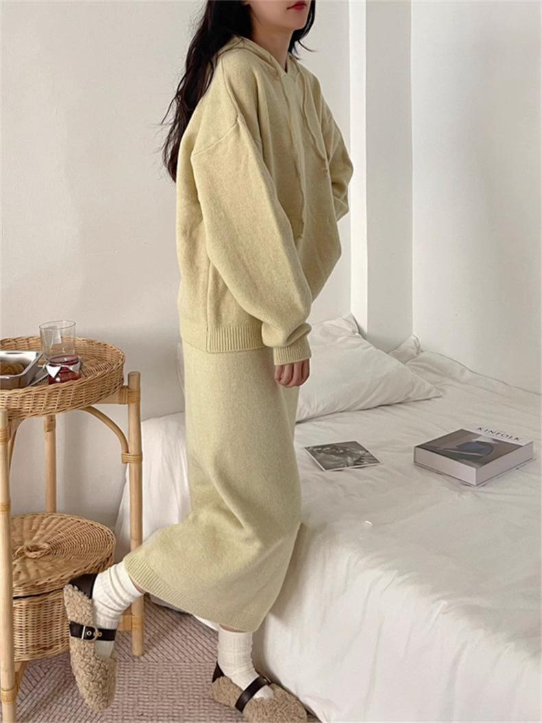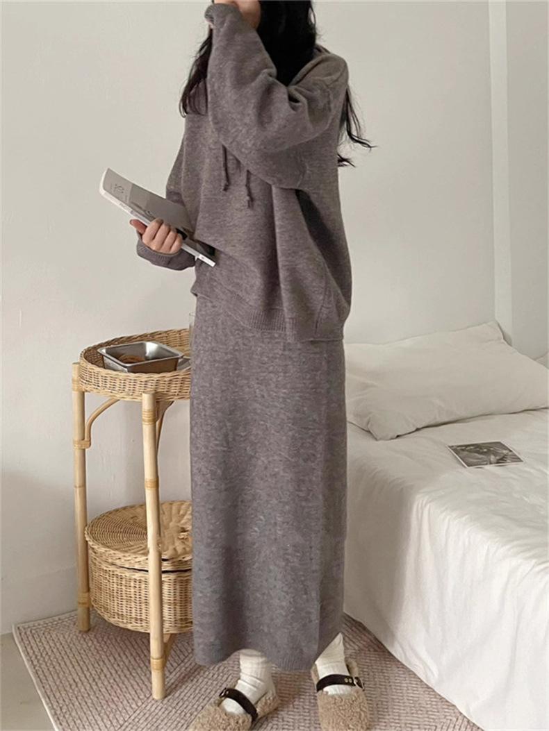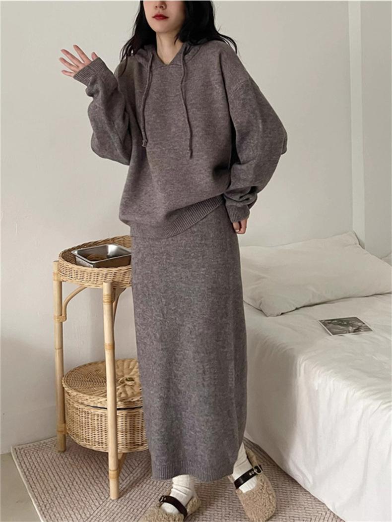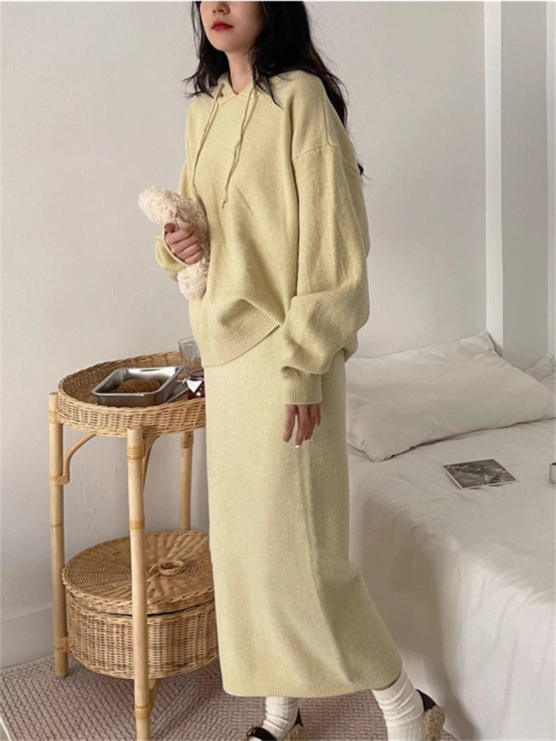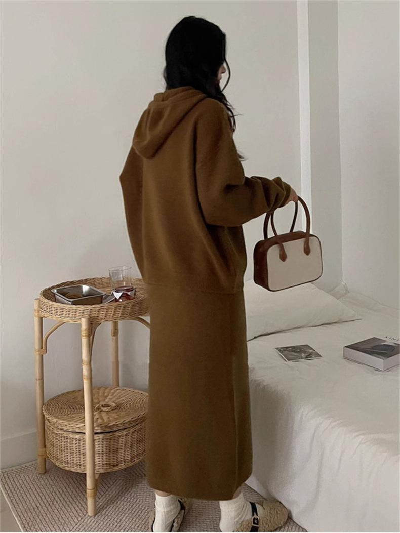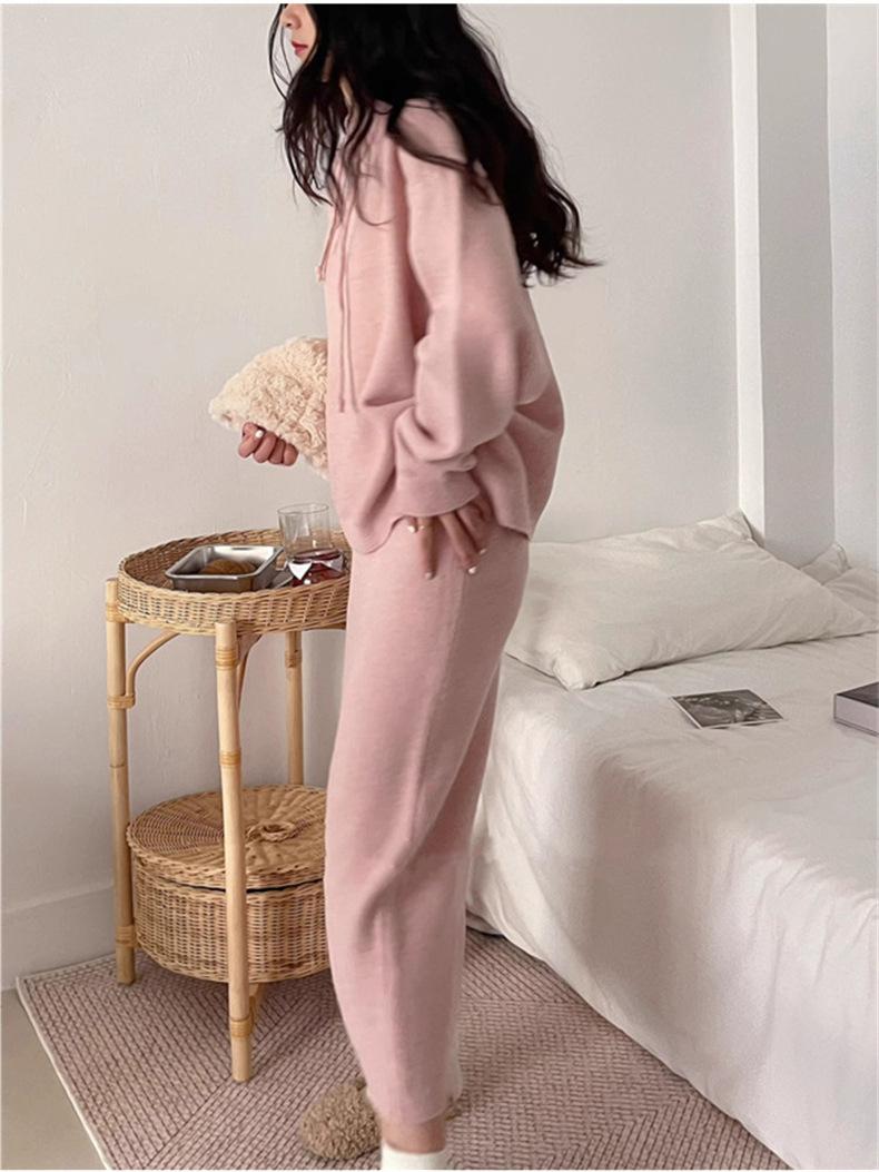 Conjunto de Dos Piezas de Punto con Capucha de Color Puro Estilo Coreano 2024 Otoño e Invierno Nuevo Conjunto de Punto Estilo Holgado Relajado