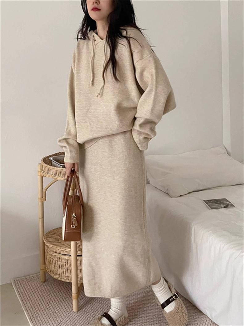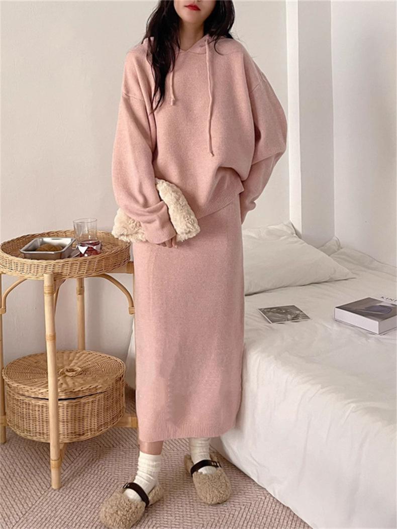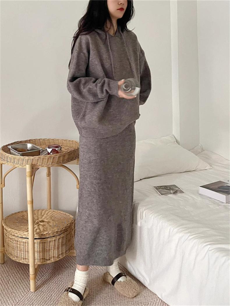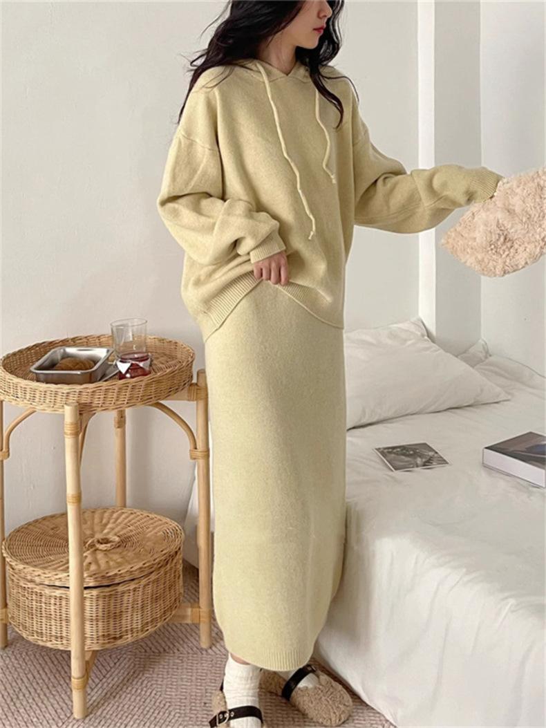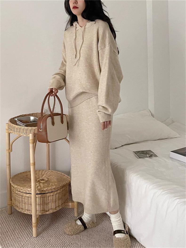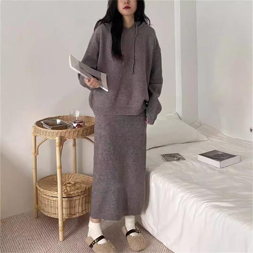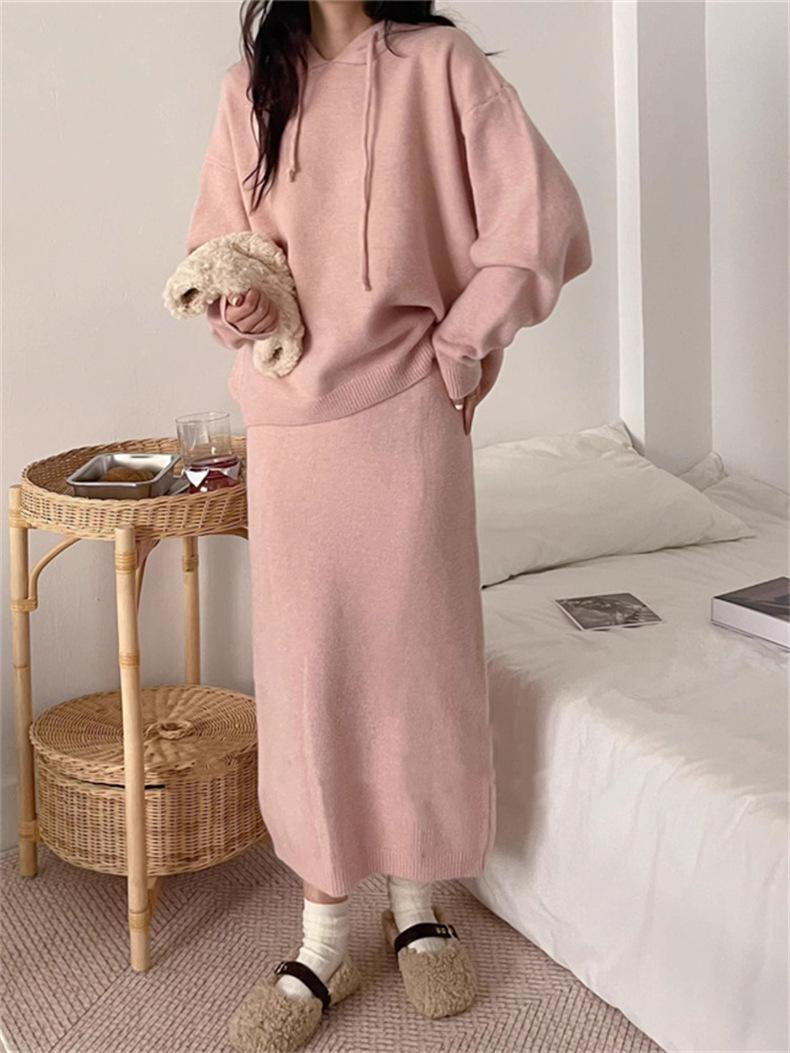 Conjunto de Dos Piezas de Punto con Capucha de Color Puro Estilo Coreano 2024 Otoño e Invierno Nuevo Conjunto de Punto Estilo Holgado Relajado