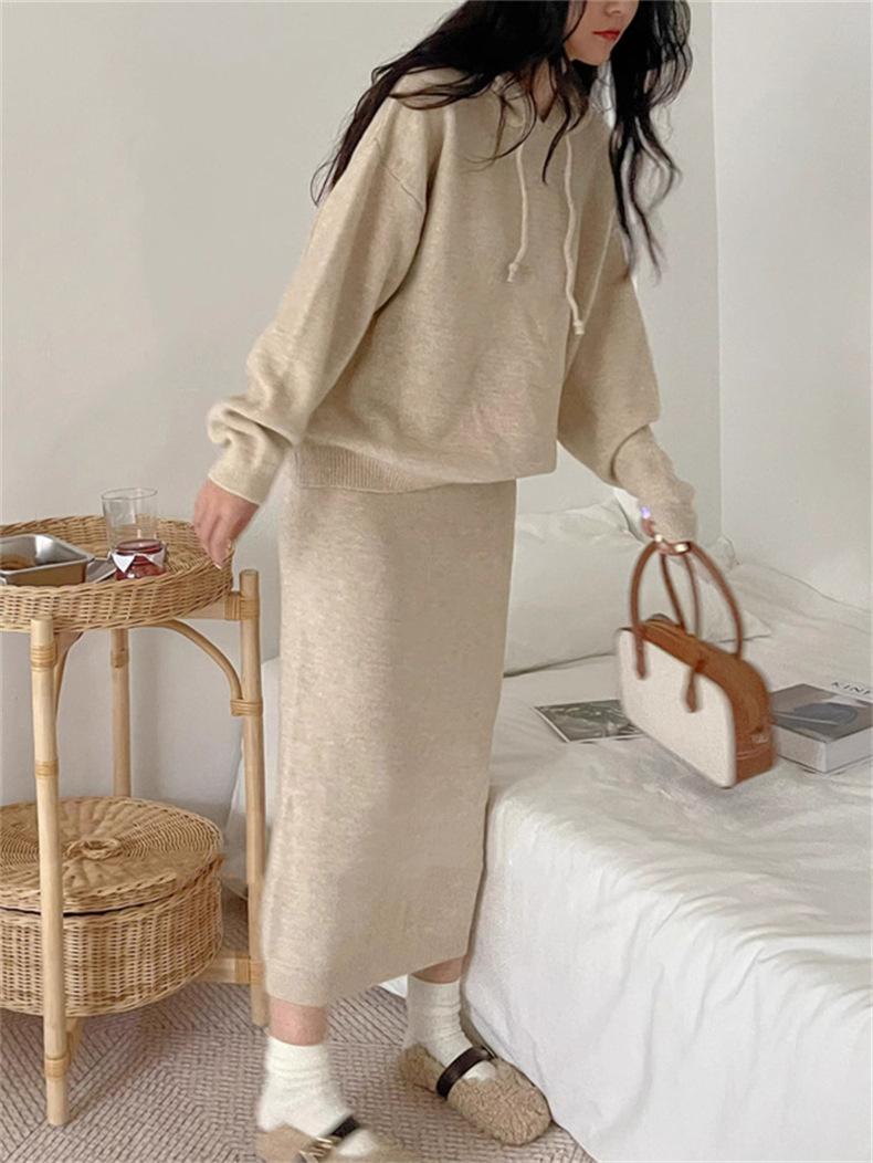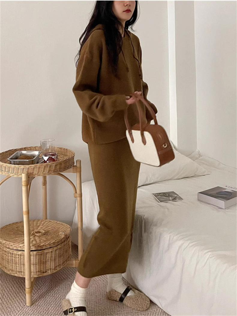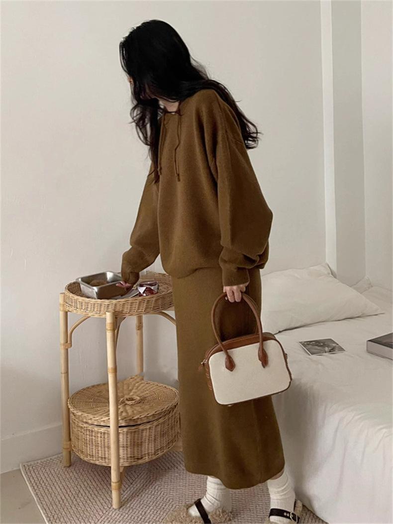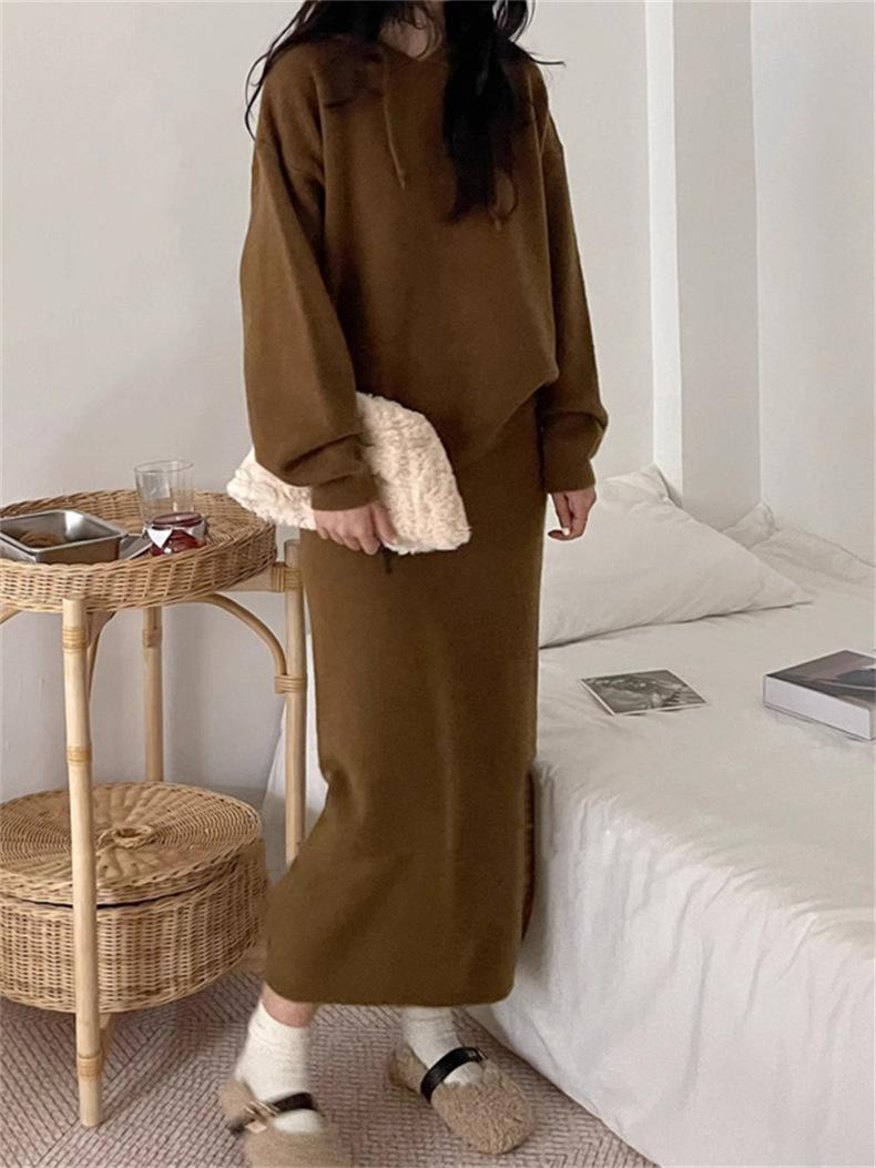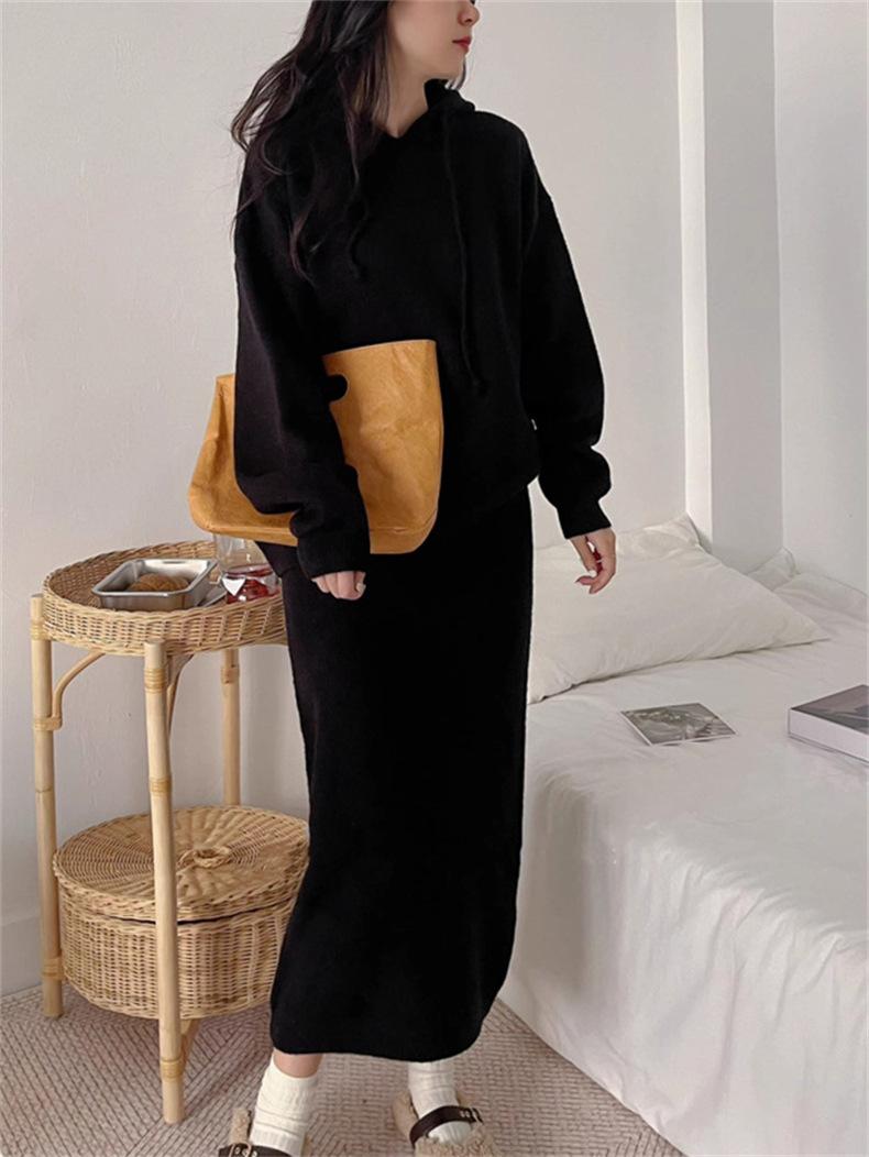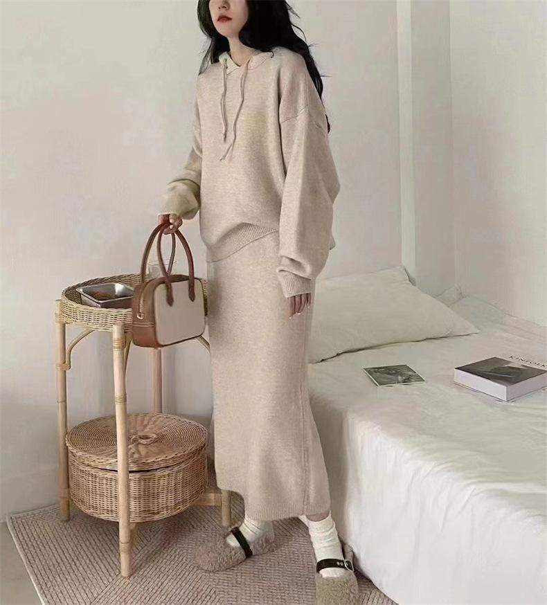 Conjunto de Dos Piezas de Punto con Capucha de Color Puro Estilo Coreano 2024 Otoño e Invierno Nuevo Conjunto de Punto Estilo Holgado Relajado