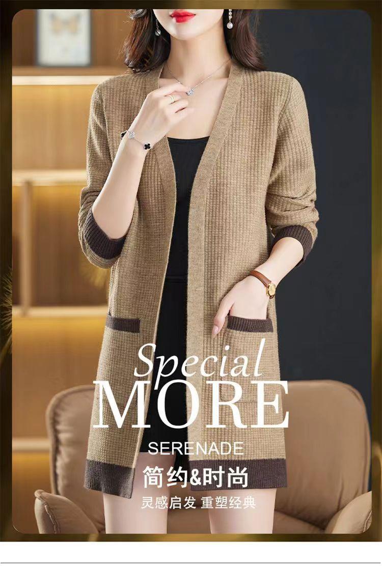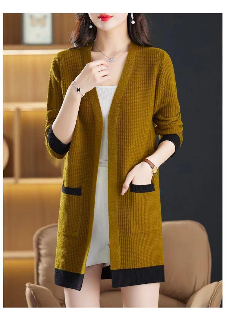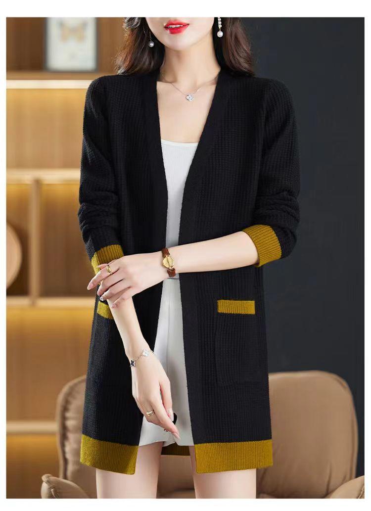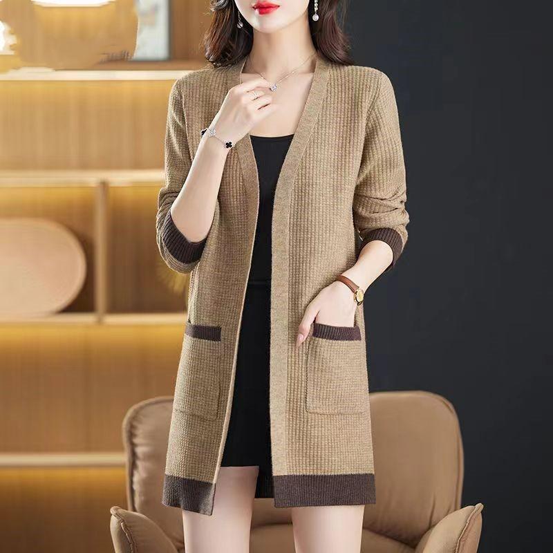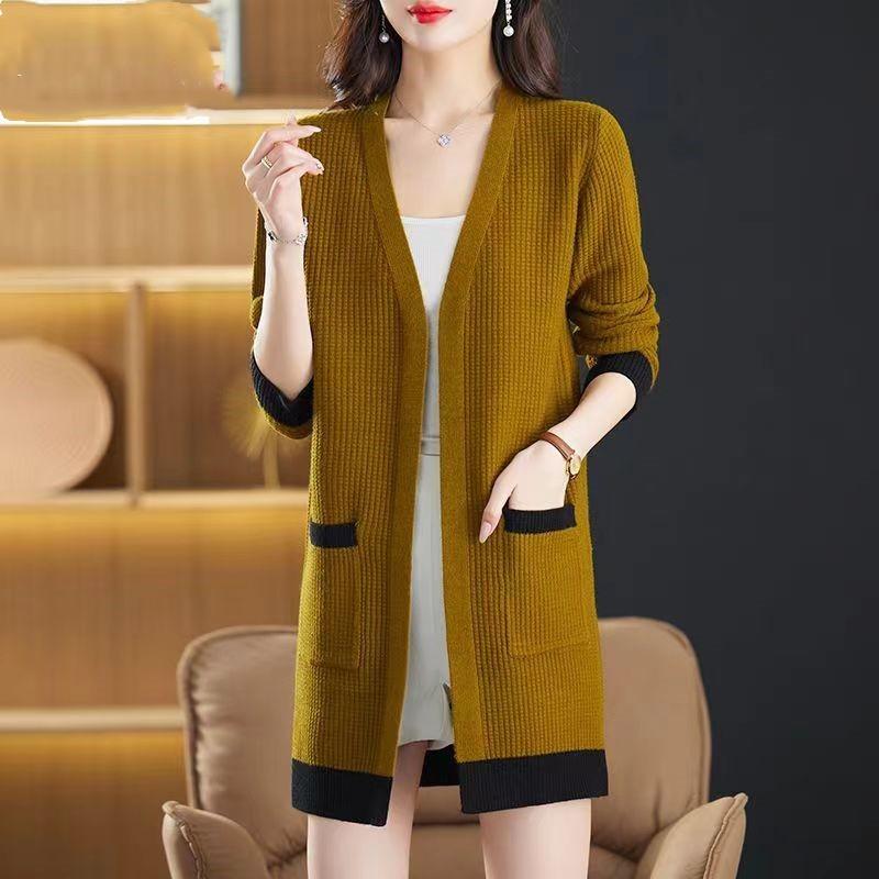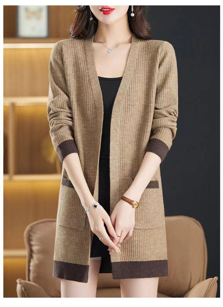 2025 Nuevo Suéter de Punto para Mujer de Largo Medio con Cuello en V Otoño e Invierno Nuevo Estilo Slim Moderno Cárdigan Chal