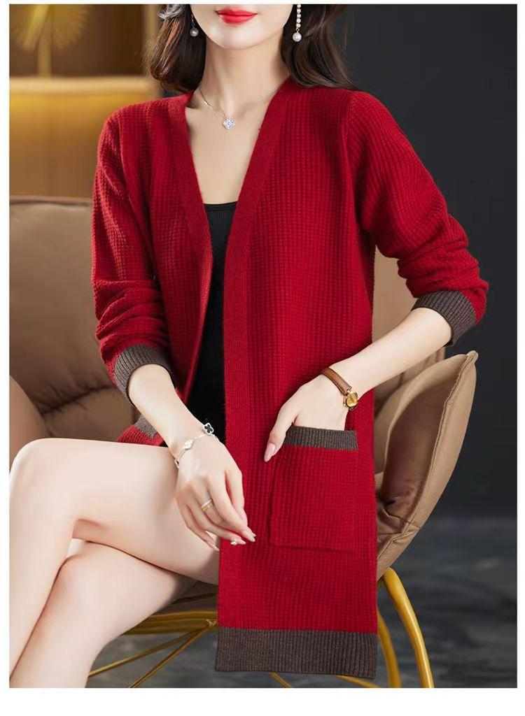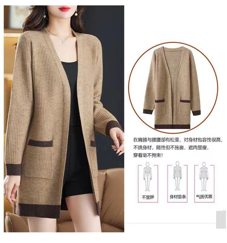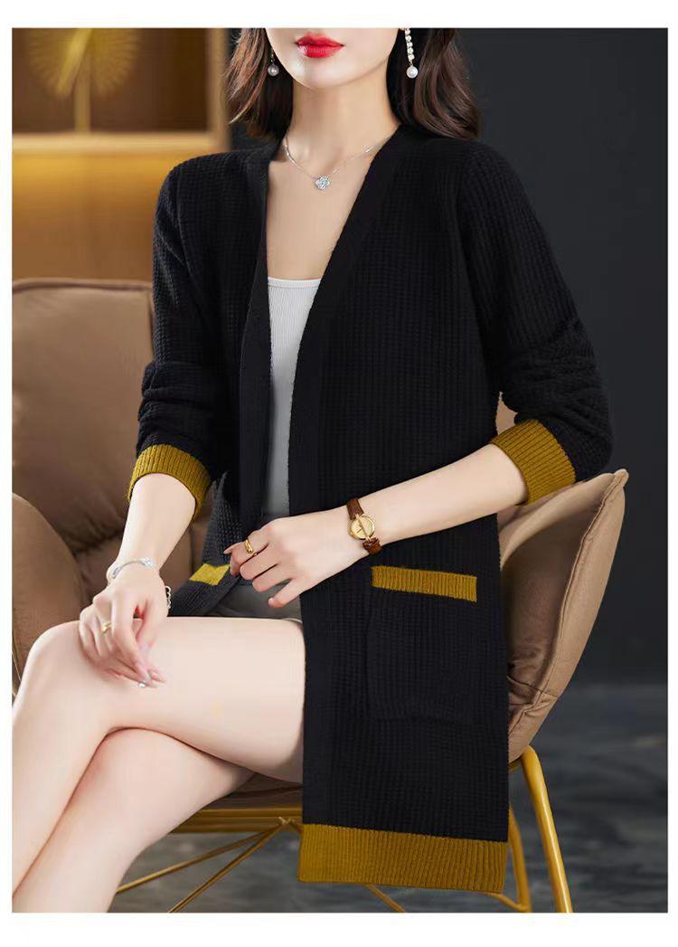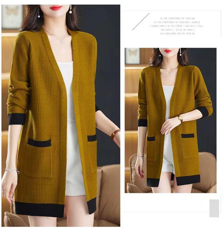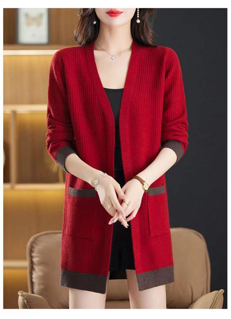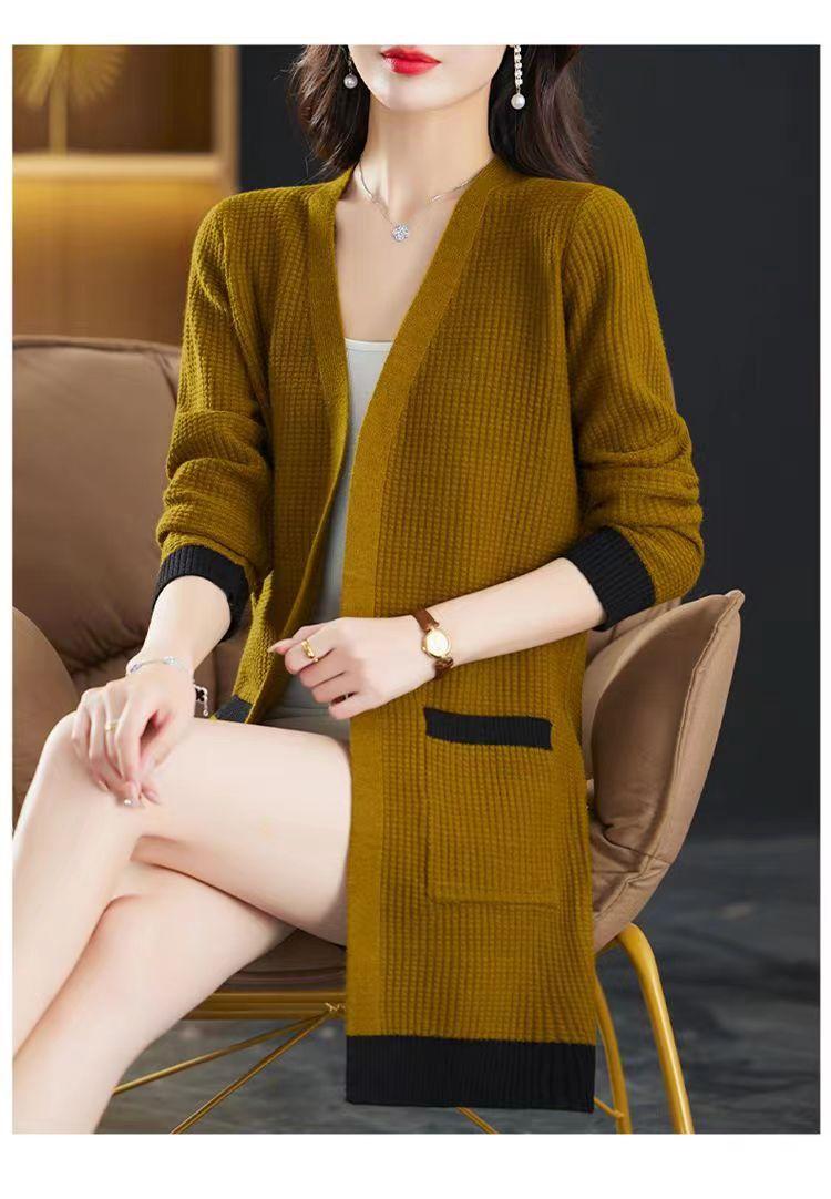 2025 Nuevo Suéter de Punto para Mujer de Largo Medio con Cuello en V Otoño e Invierno Nuevo Estilo Slim Moderno Cárdigan Chal