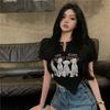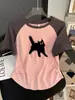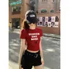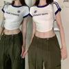 Camiseta de manga corta estilo americano con contraste de color retro, diseño de verano para mujer, hombros descubiertos, ajustada y sexy.