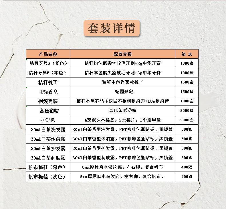 Straw dental appliance Type A, Straw tooth Type B, Straw banana comb, 15g round soap, Shaving Set, Shower cap,...
