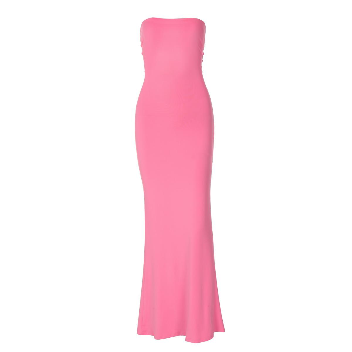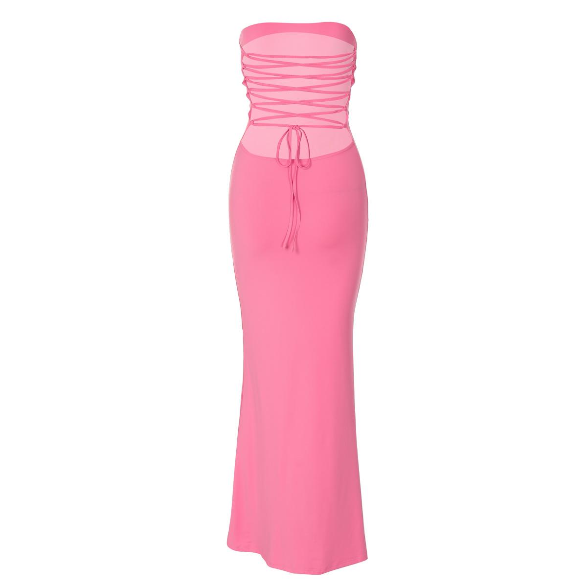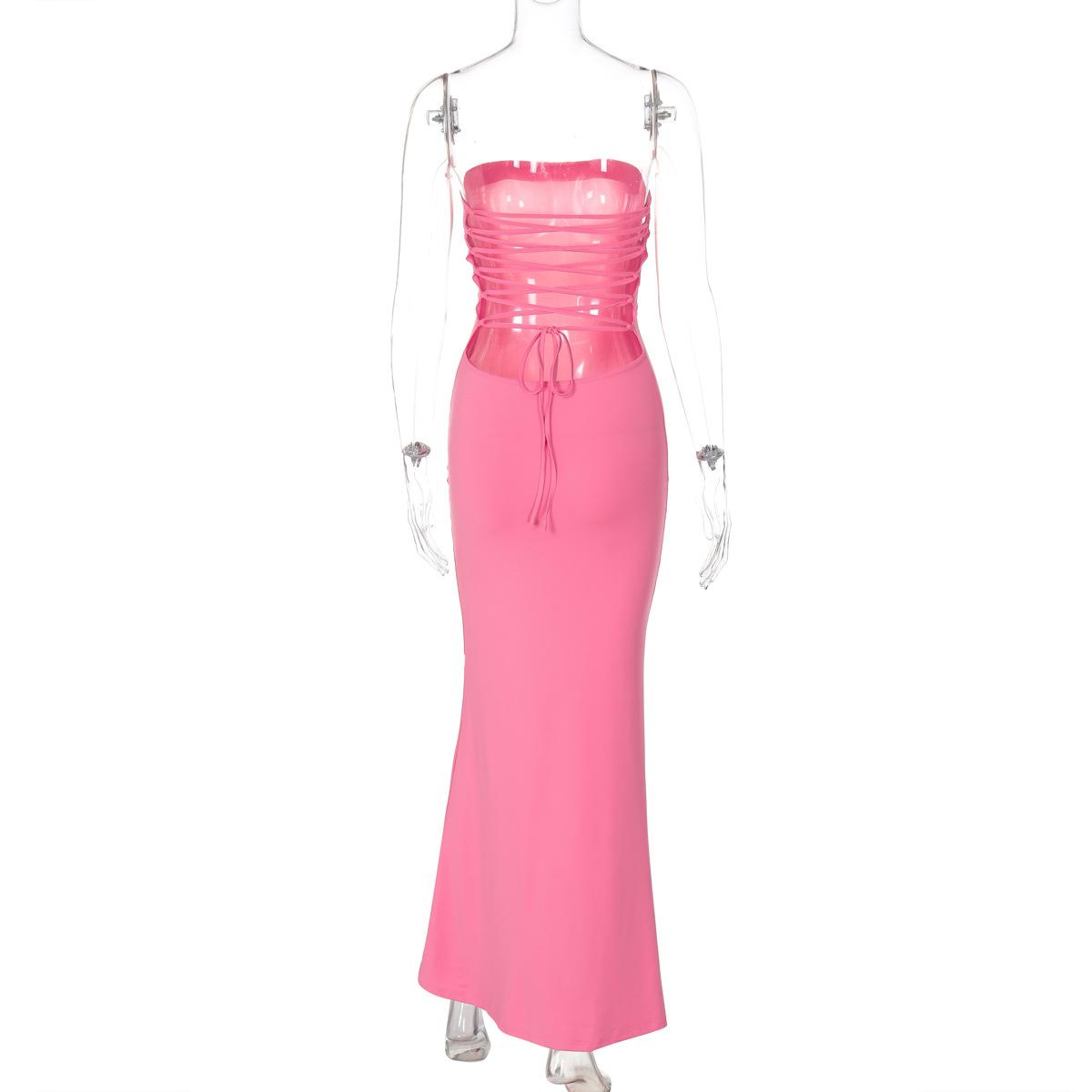 Ropa de mujer europea y americana, primavera 2025, nueva, sexy, estilo puro deseo, top de tubo, vestido de empalme de malla con cuello de una línea |