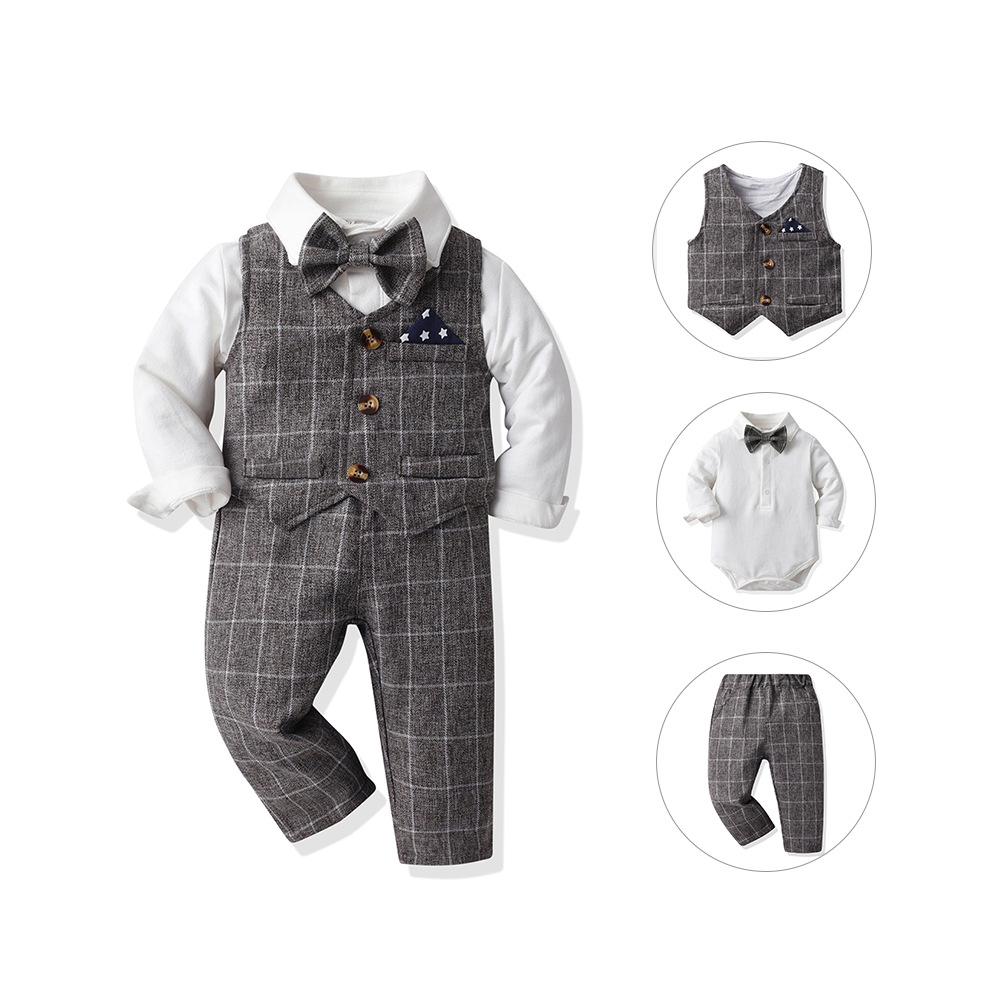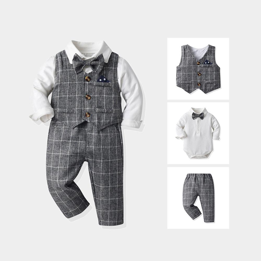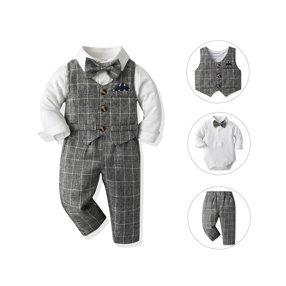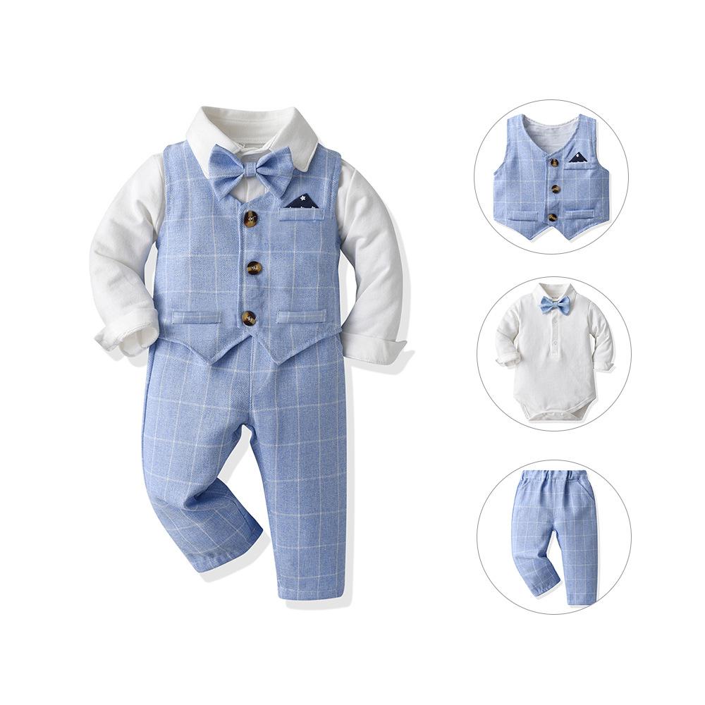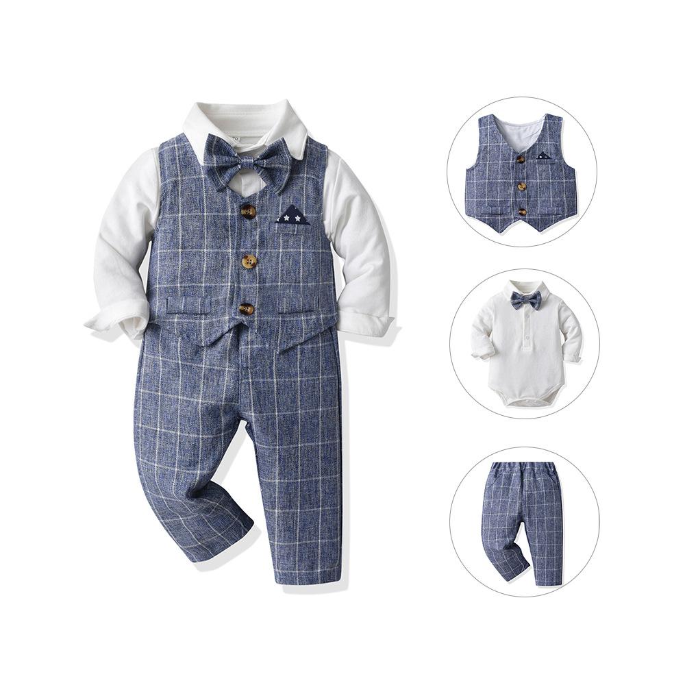 Ropa infantil de comercio exterior chaleco de cuadros retro caballero mameluco de manga larga de una pieza pantalones de bebé conjunto de tres piezas Venta al por mayor