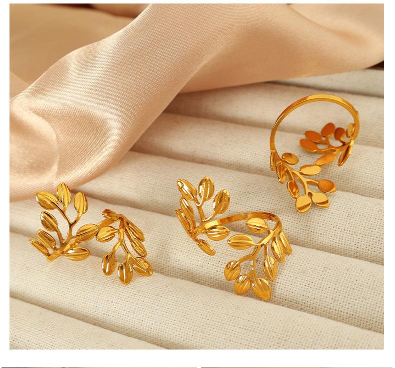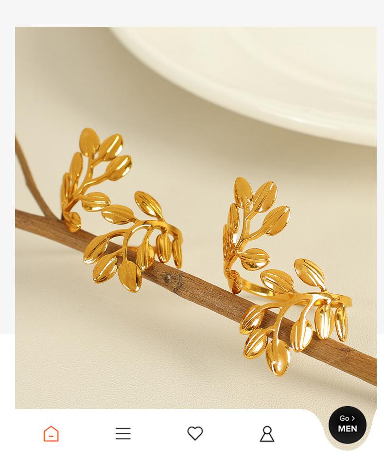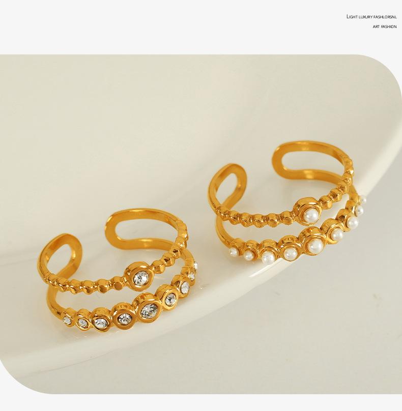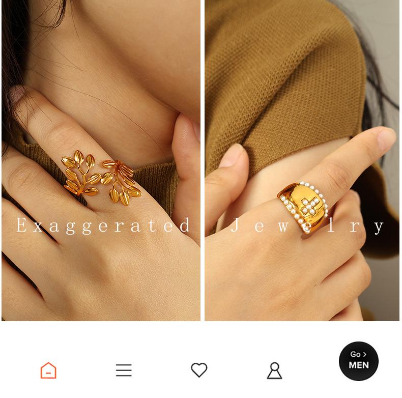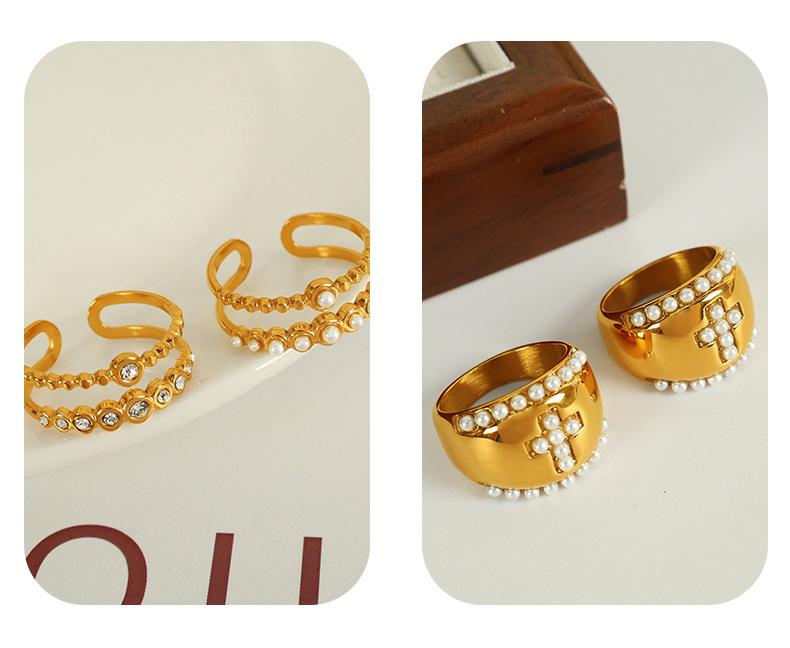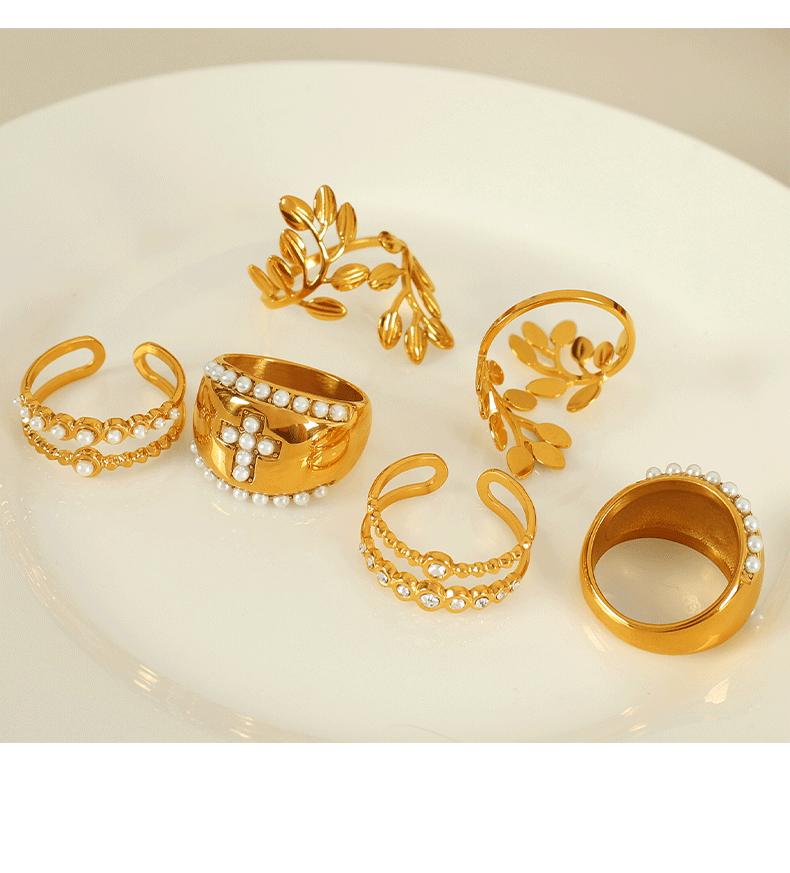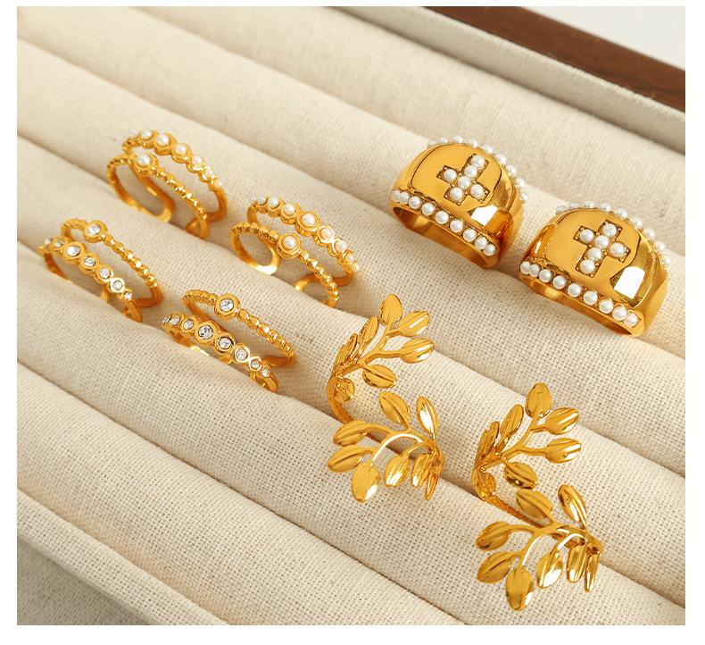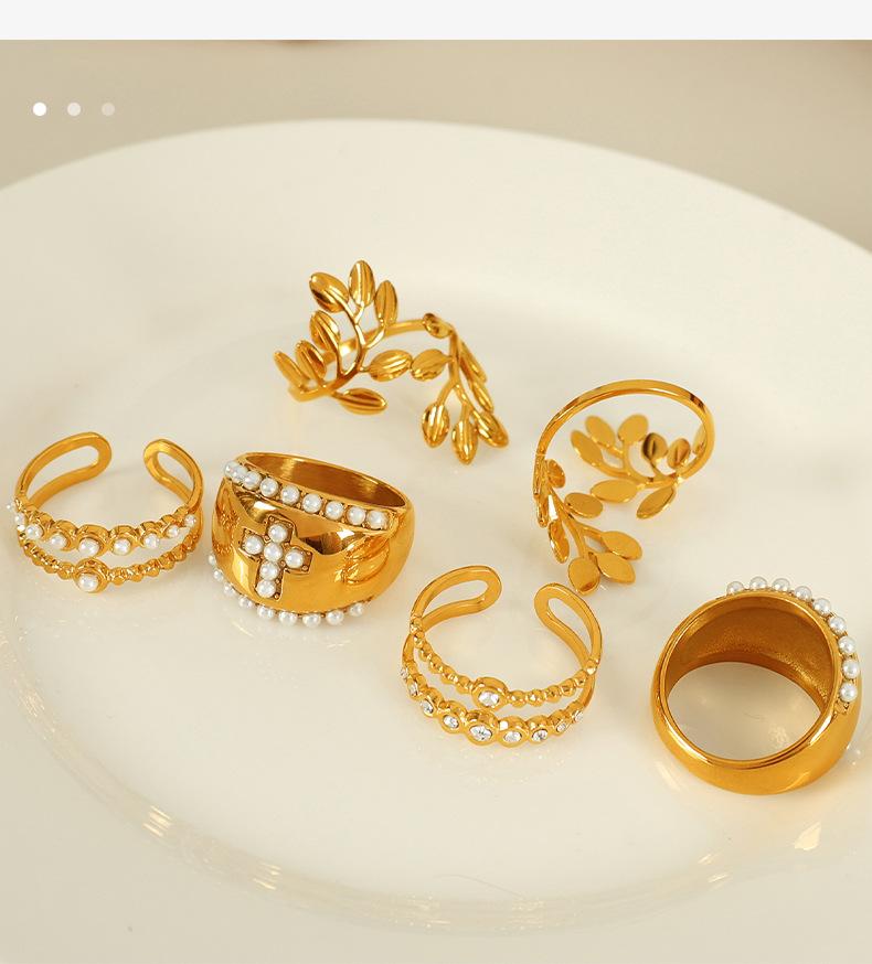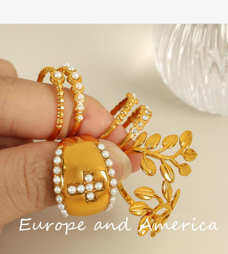Anillo de hoja cruzada de acero de titanio retro con incrustaciones de perlas de imitación y diamantes de imitación de alta calidad de Europa y Estados Unidos.