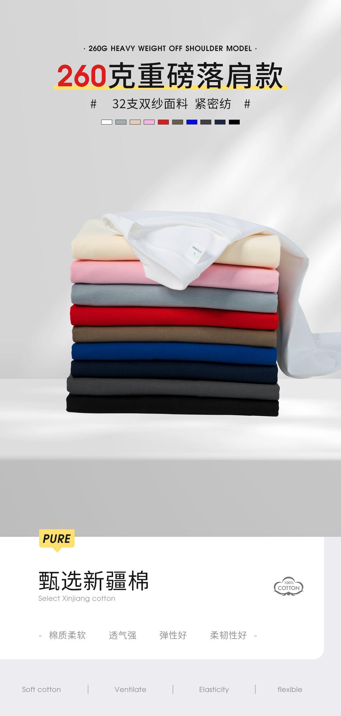 Camiseta de manga corta de algodón de 260 g, holgada, con hombros descubiertos y logotipo impreso, para publicidad, ropa de trabajo, ropa de clase y fiesta.