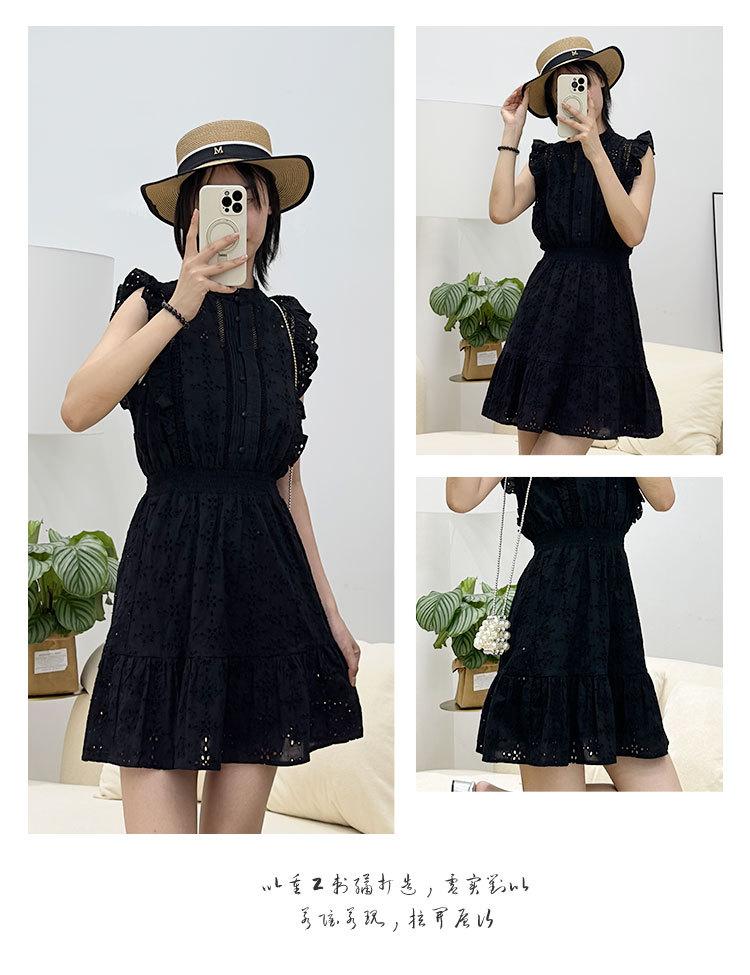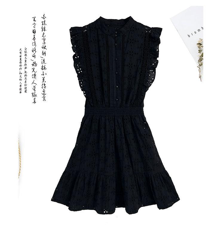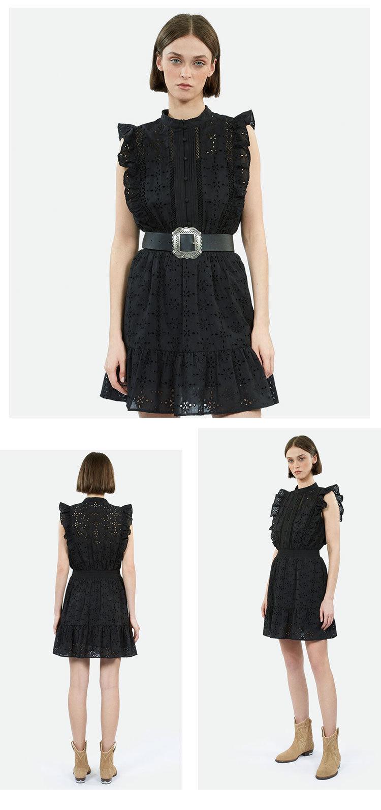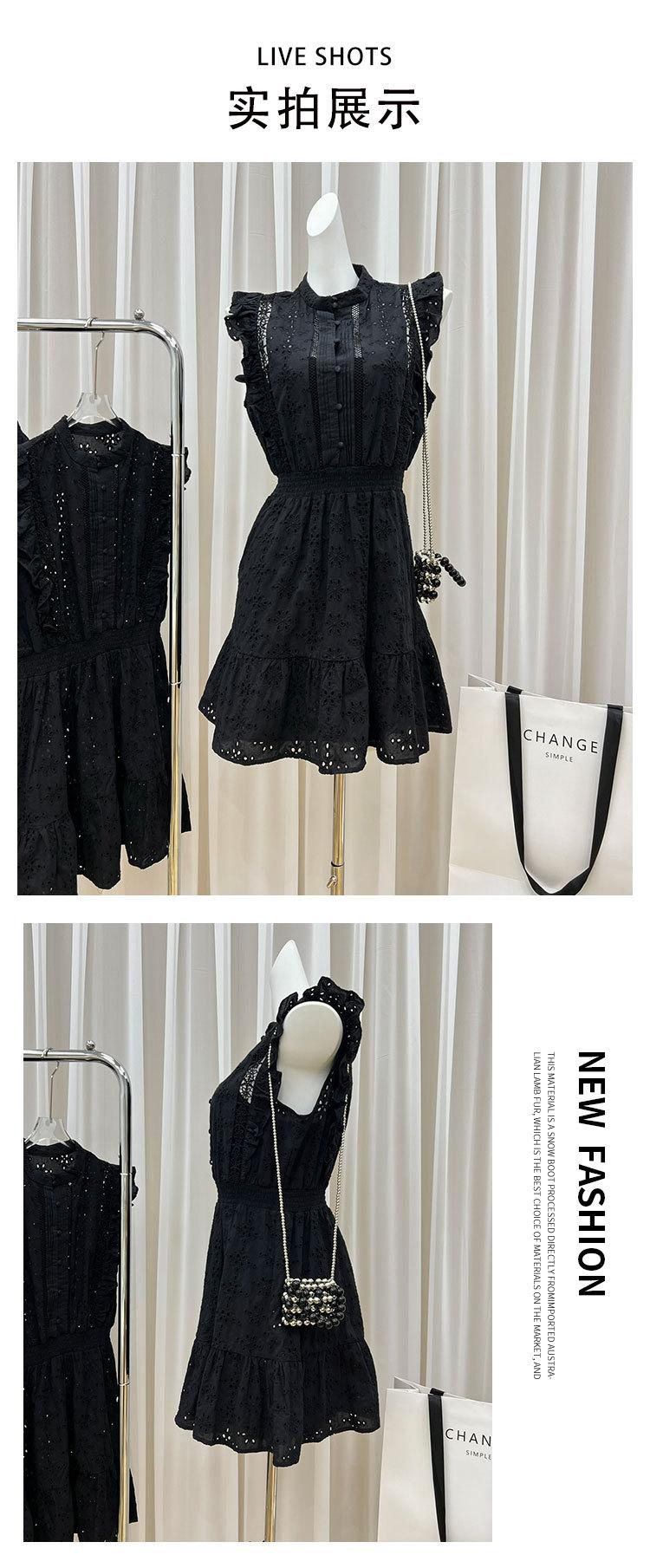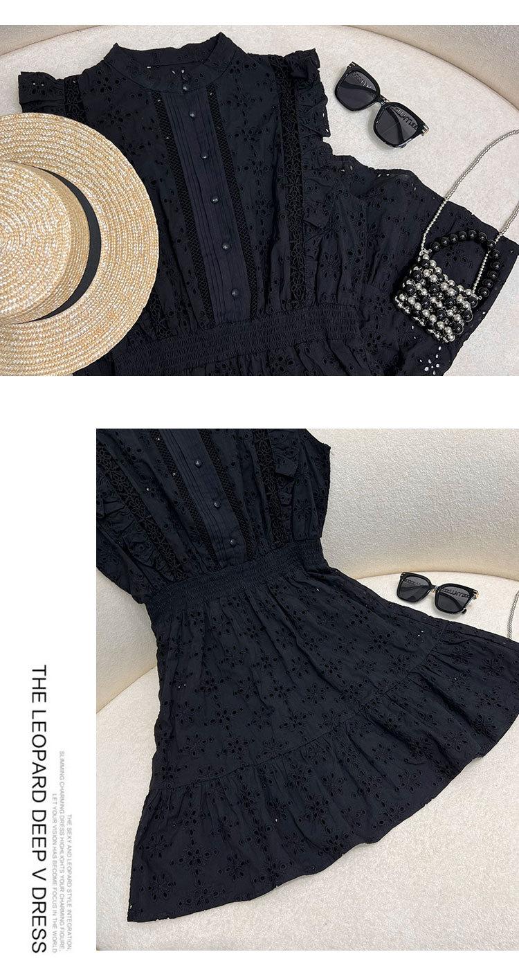 Verano Nuevo Francés Negro Dulce y Lindo Bordado Calado Manga Corta con Volantes Vestido Corto