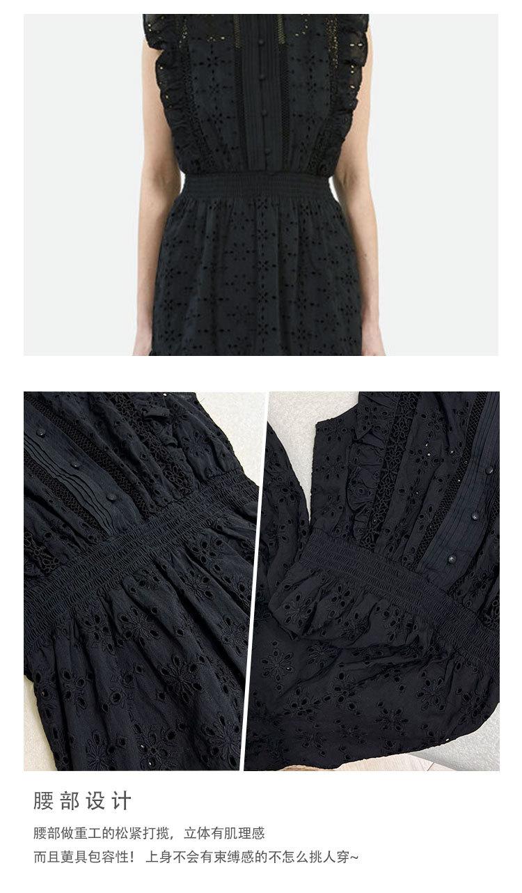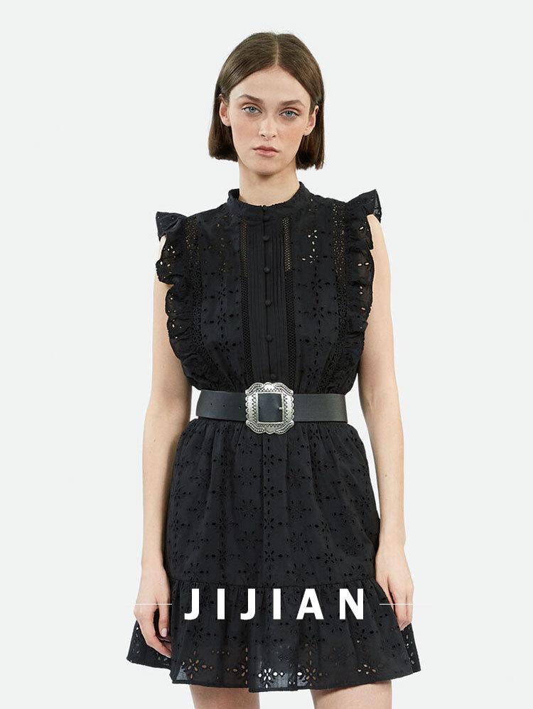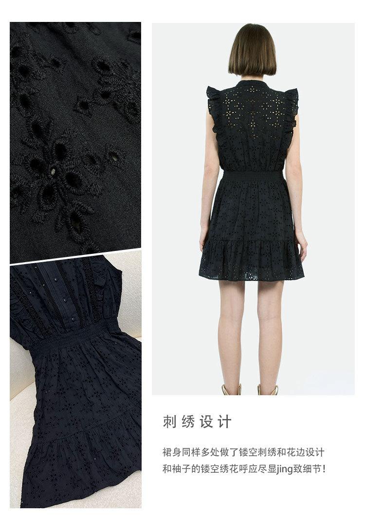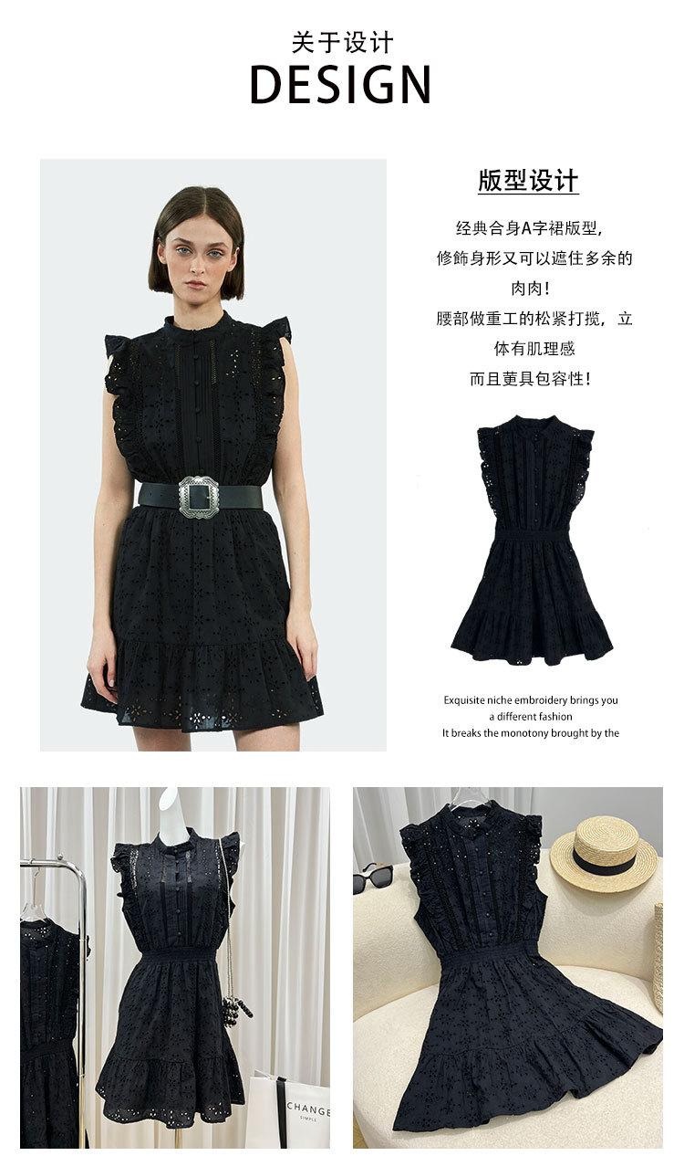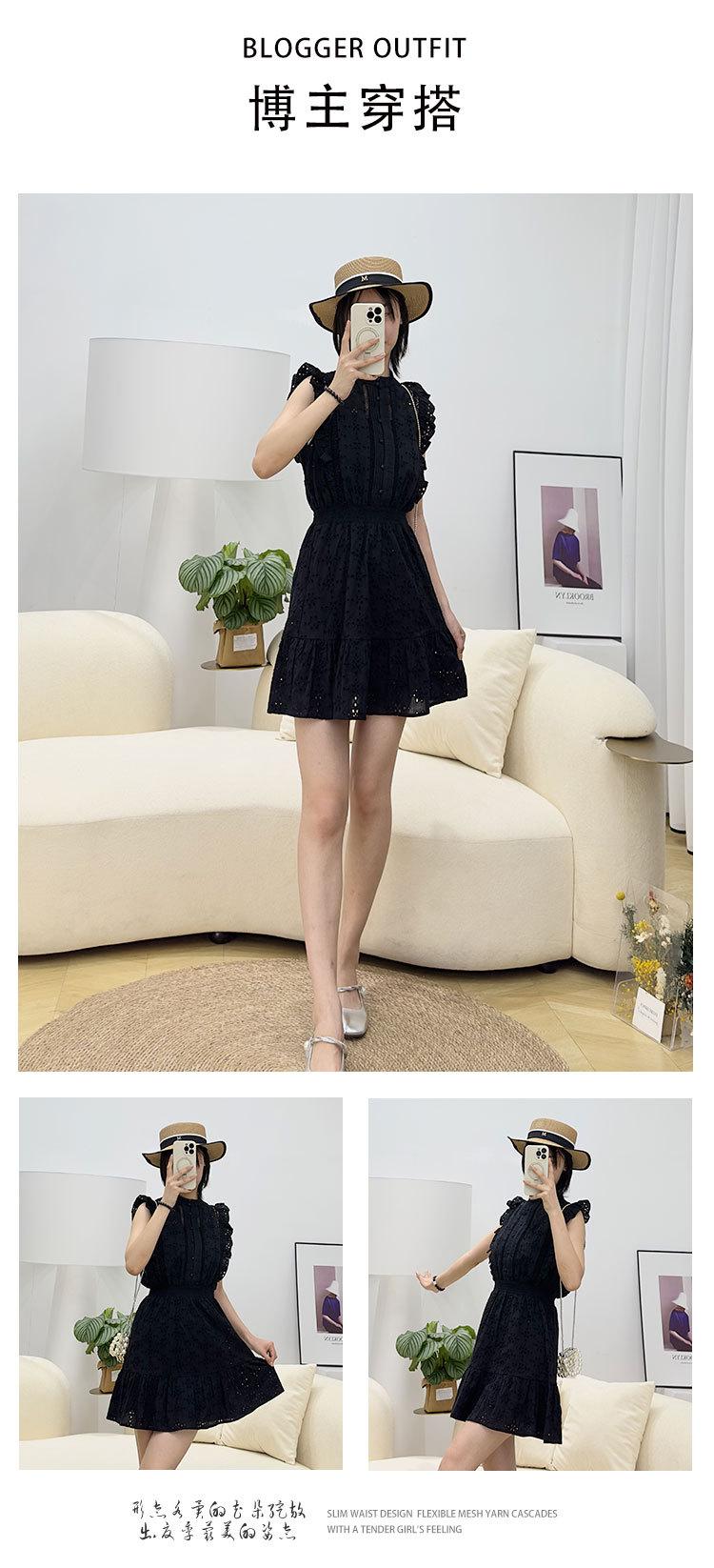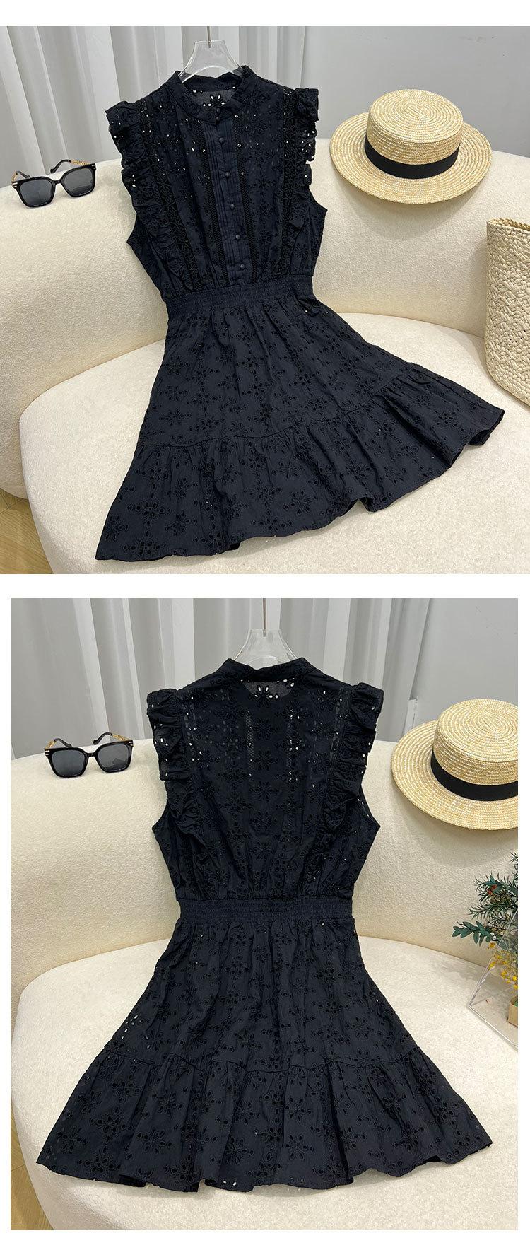 Verano Nuevo Francés Negro Dulce y Lindo Bordado Calado Manga Corta con Volantes Vestido Corto