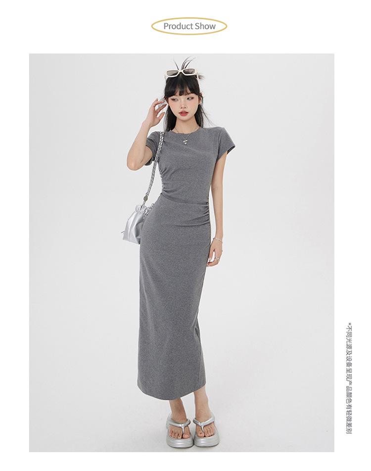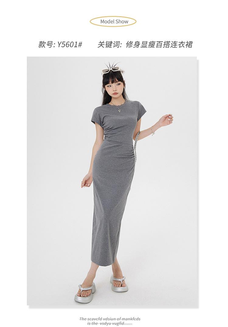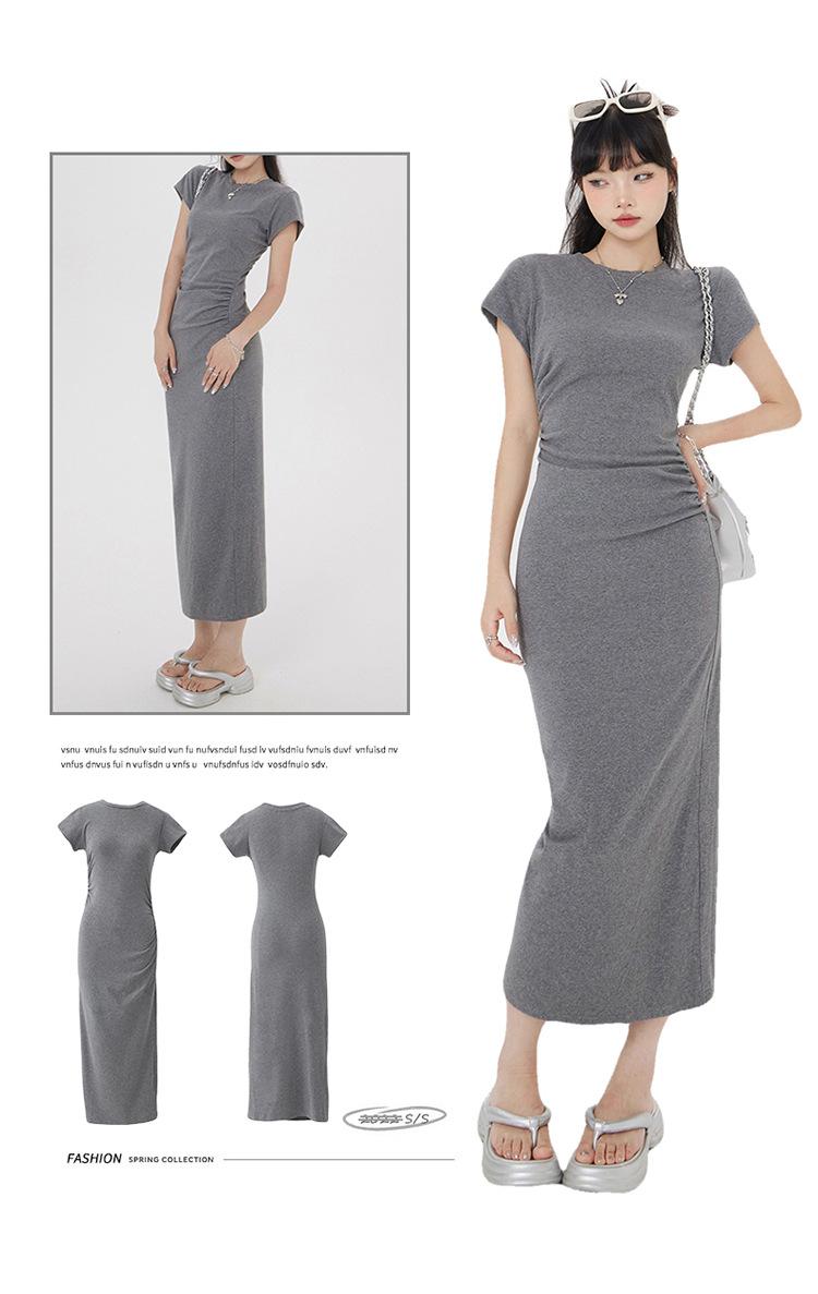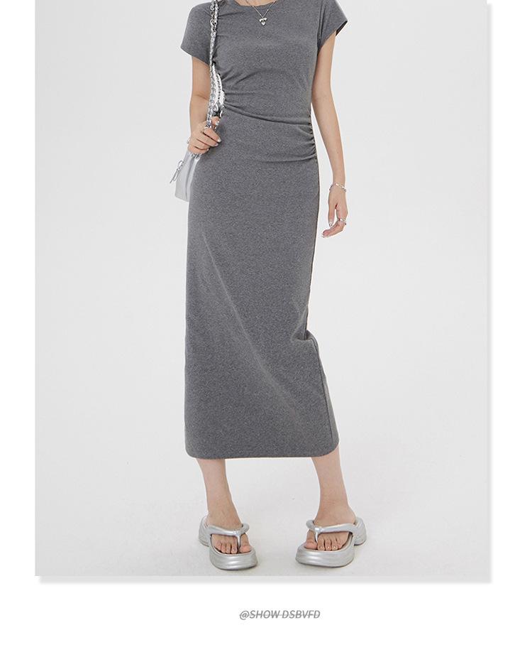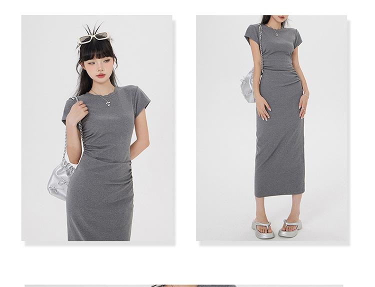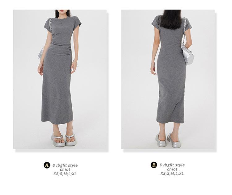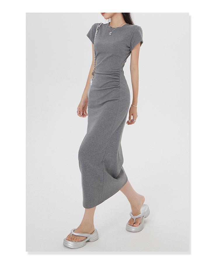 Vestido ajustado de manga corta para mujer, estilo Pure Desire, color gris, ajustado, con cintura ajustada y diseño plisado, a la moda, largo.