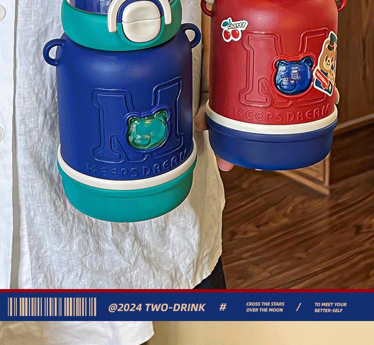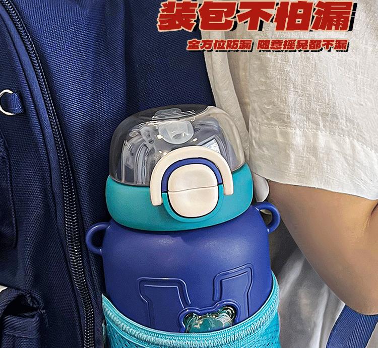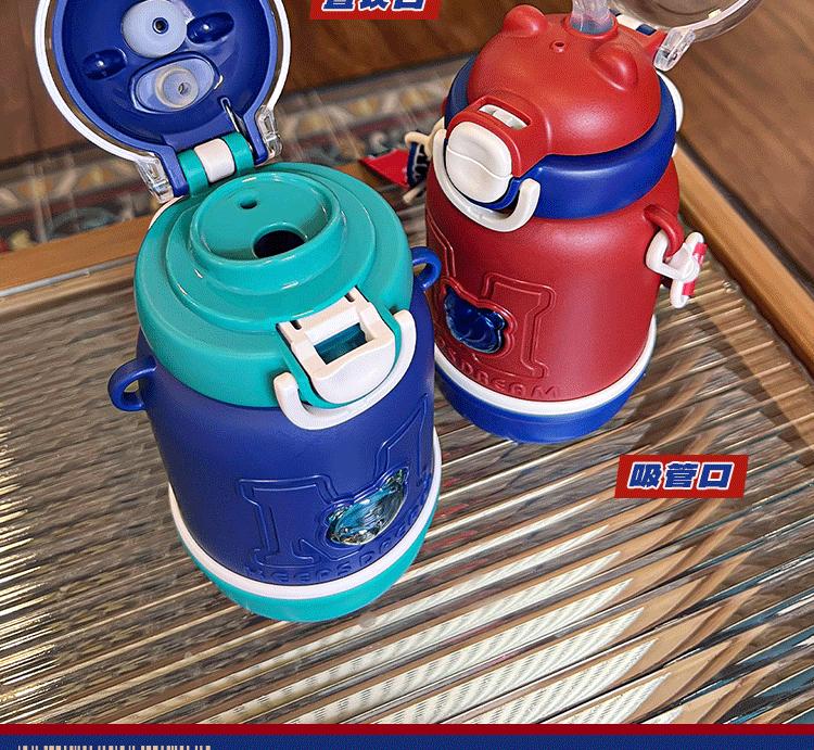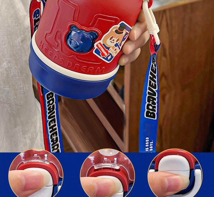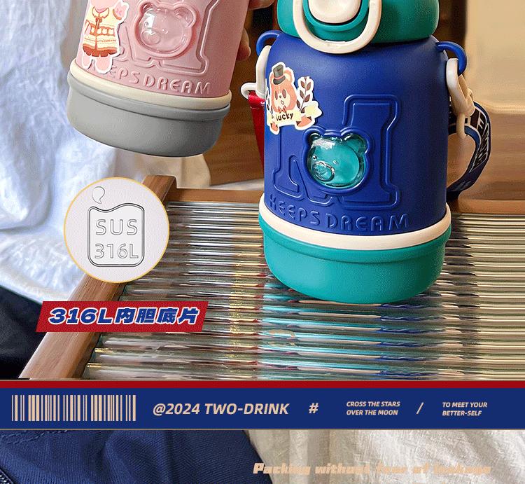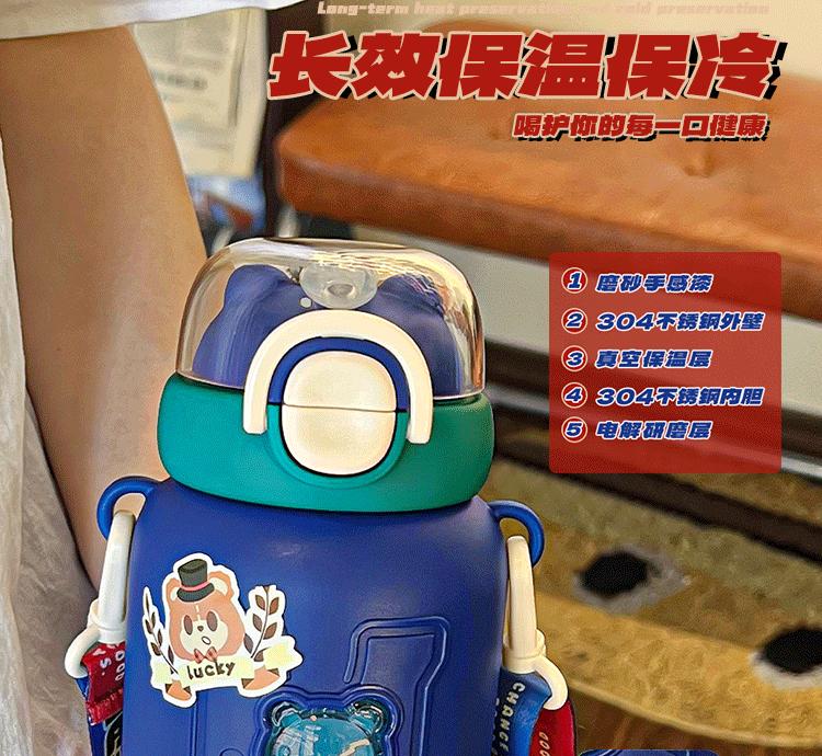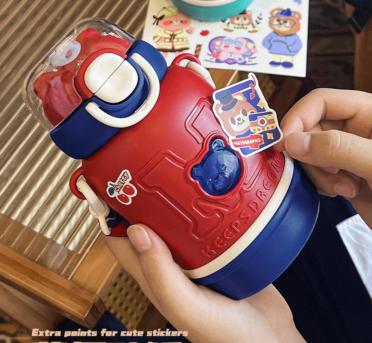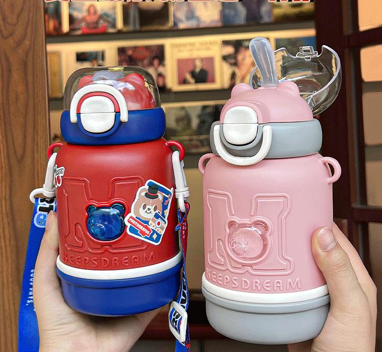 Acero Inoxidable 316 Vaso Termo Doméstico de Gran Capacidad Dibujos Animados Portátil con Correa Vaso de Agua Anticaídas Vaso con Pajita para Estudiantes