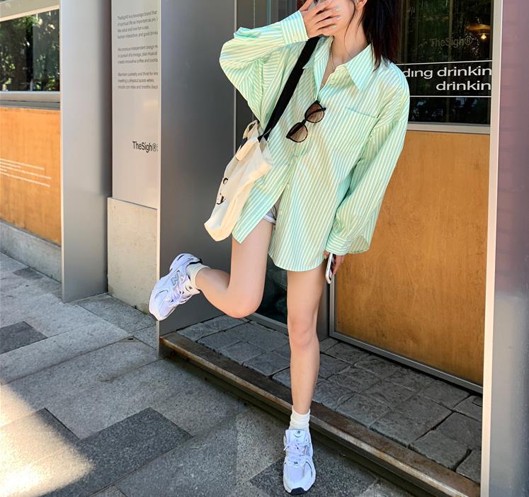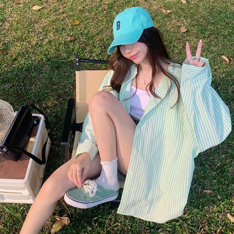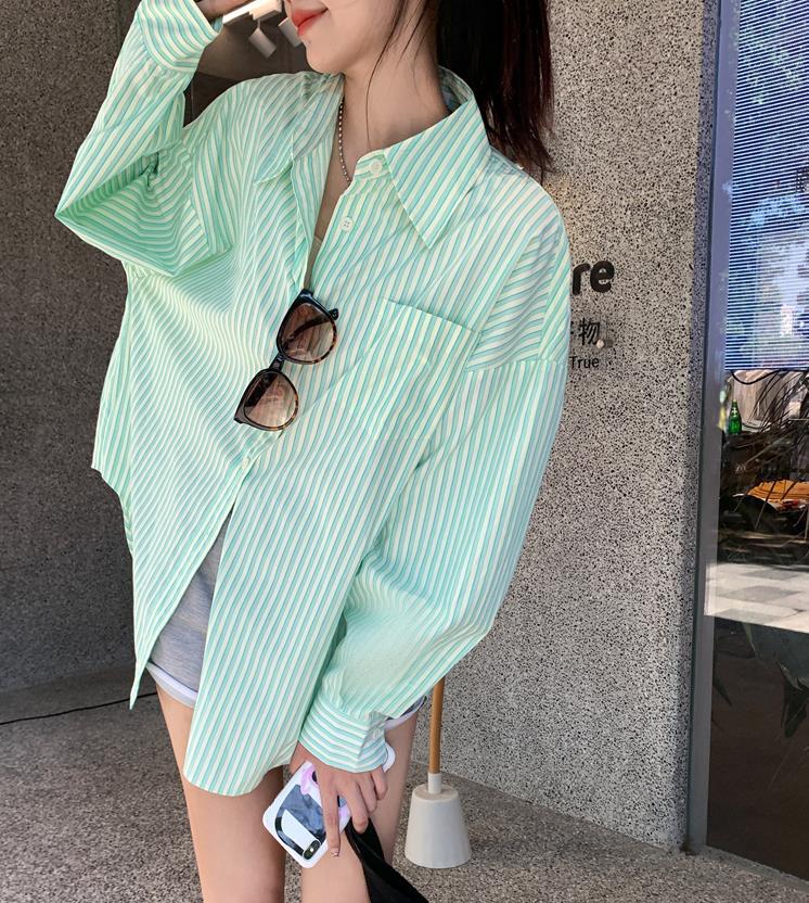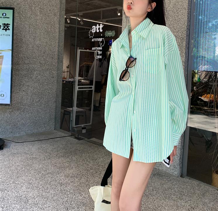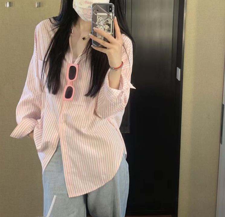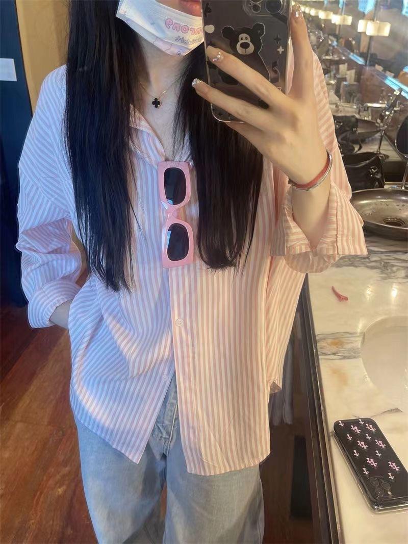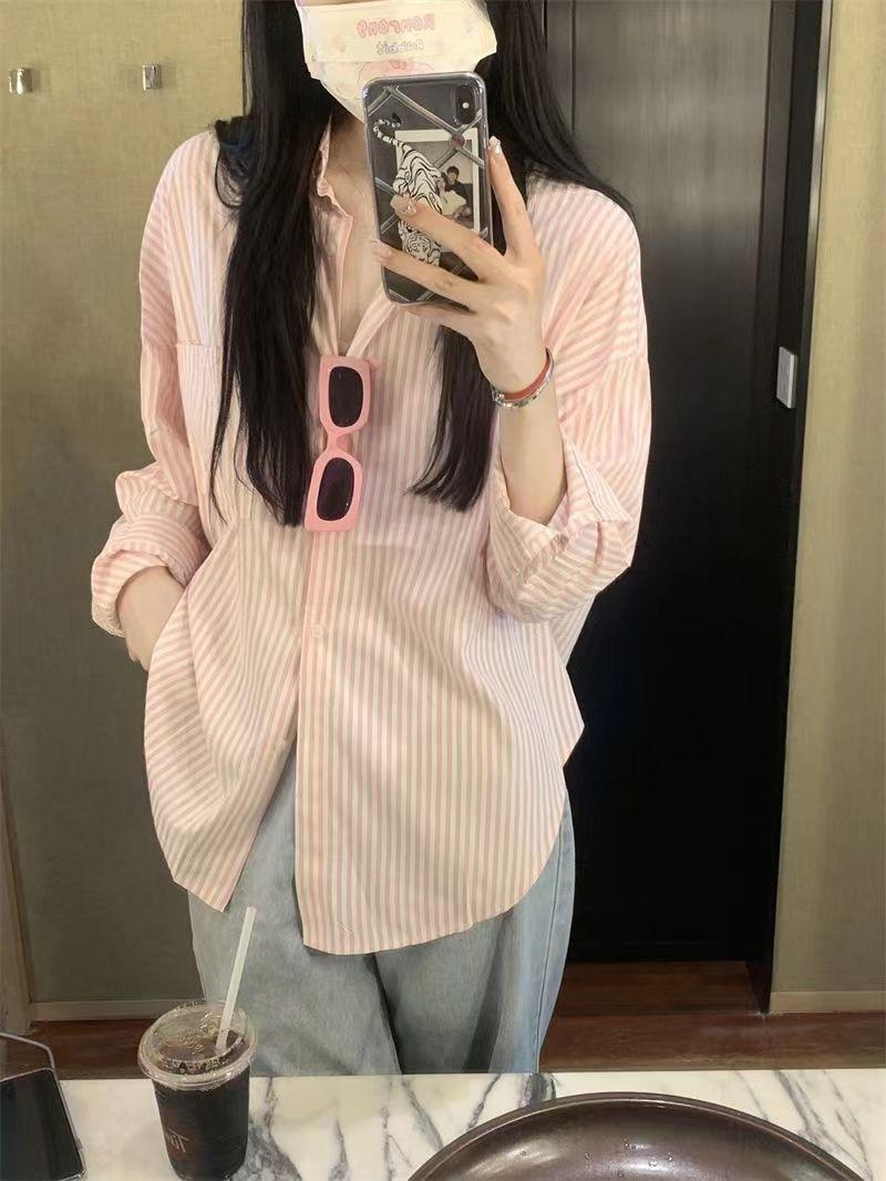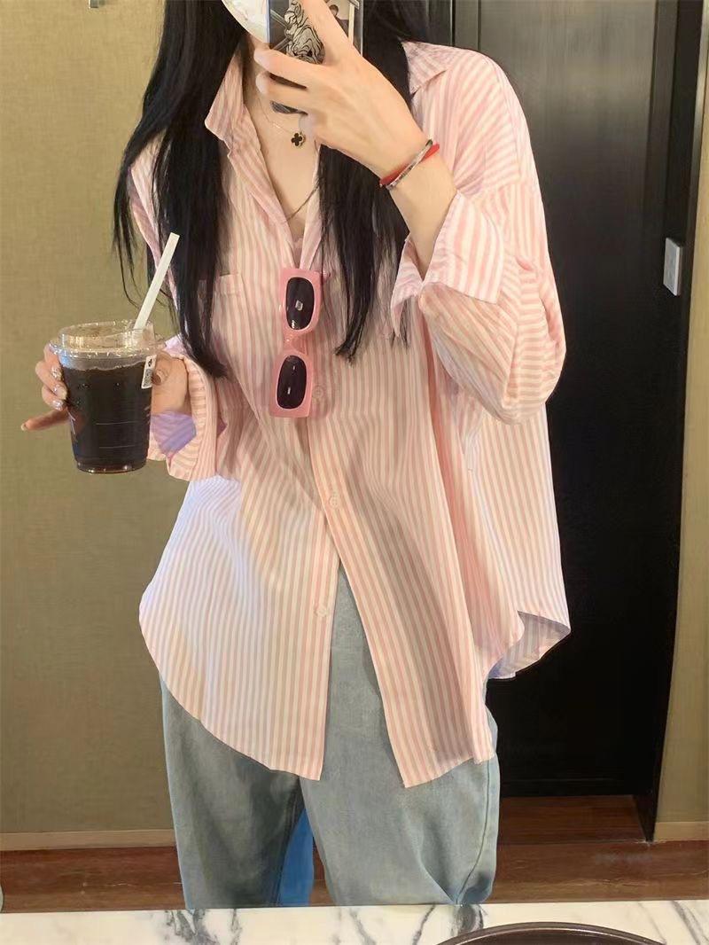 Camisa de rayas rosas para mujer, fina, elegante, con protector solar, de manga larga, de verano, diseño holgado, tipo chaqueta tipo camisa