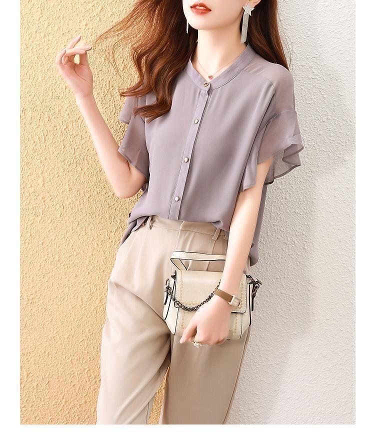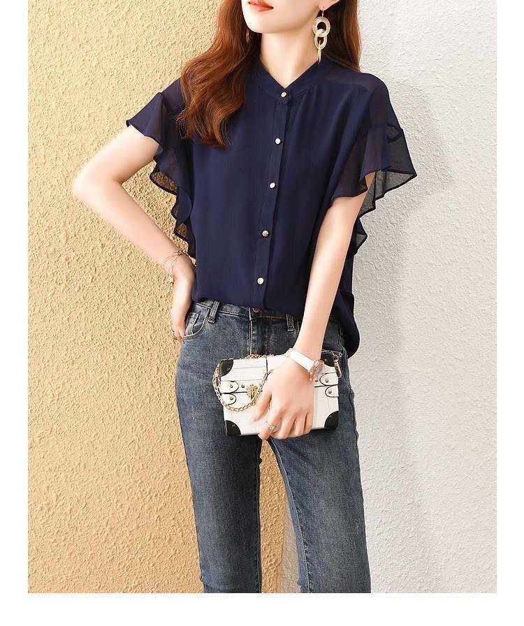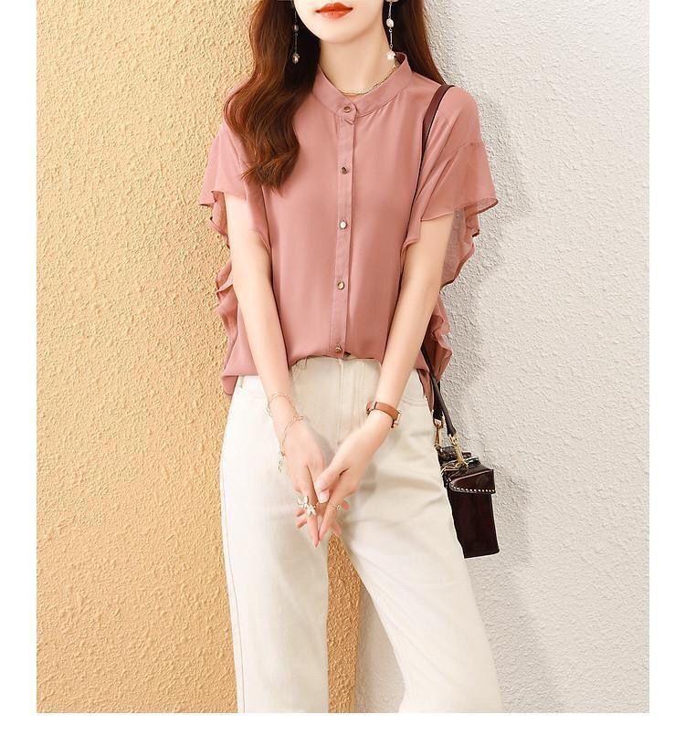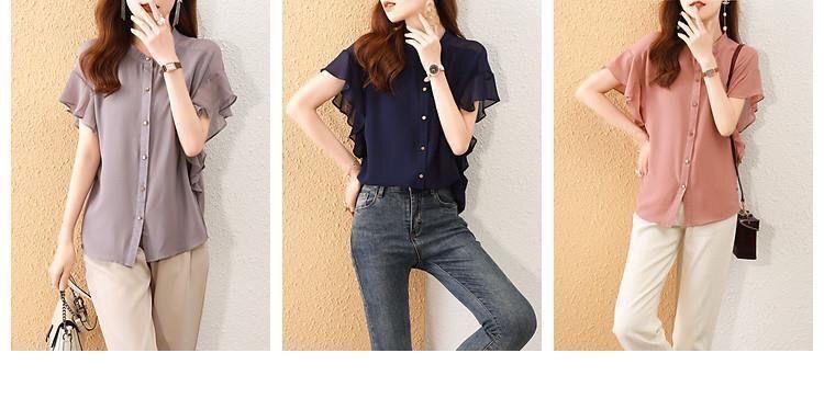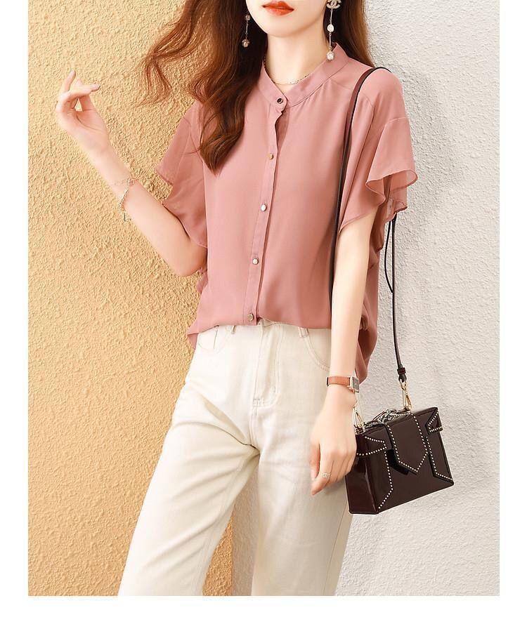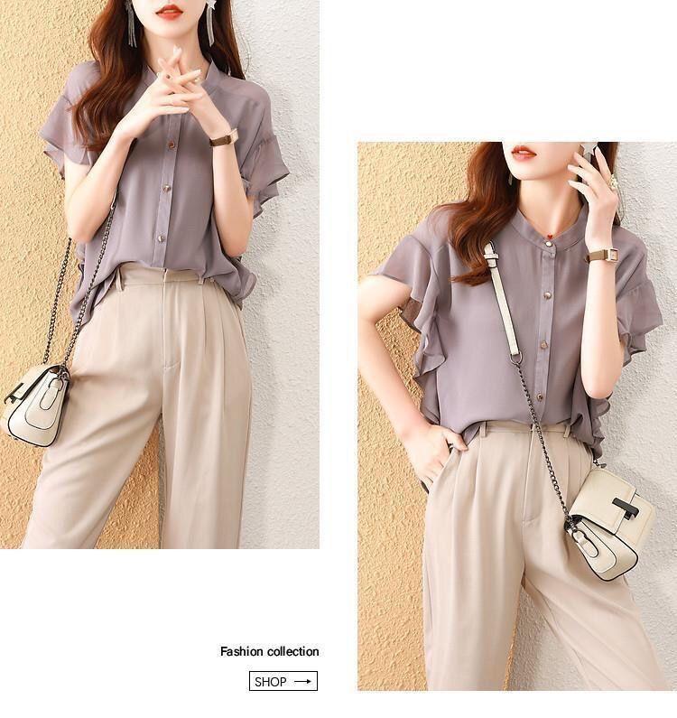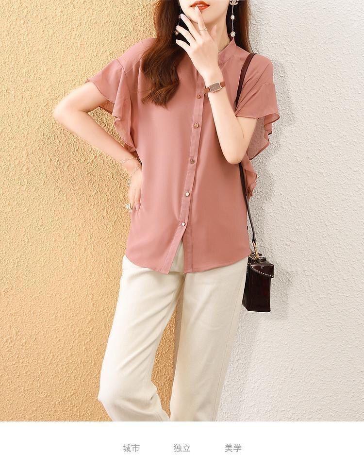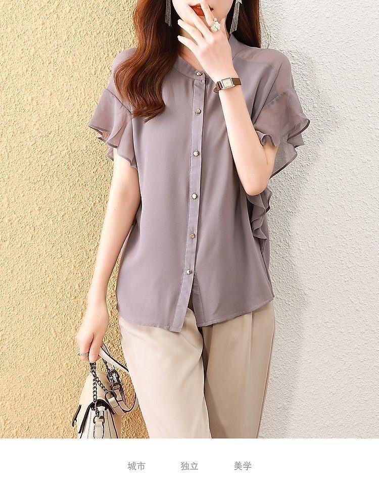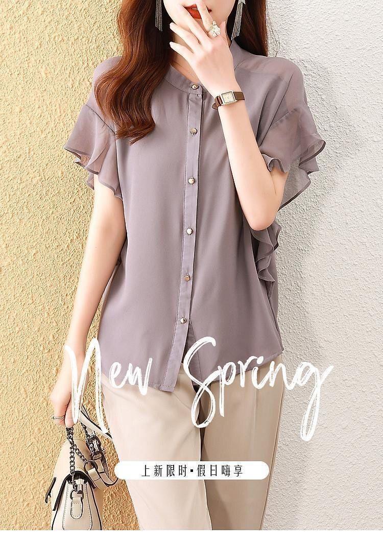 2025 Nuevo Estilo de Verano Versátil Camisa de Gasa con Mangas Volantes Camisa de Color Puro Hermosa Top Holgado Delgado