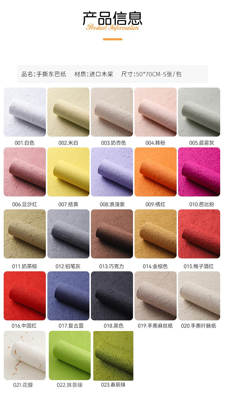 5 | Papel Dongba color sólido | 5Hoja/50*70CM | 21.5 | Bolsa | 100 | 2150 |