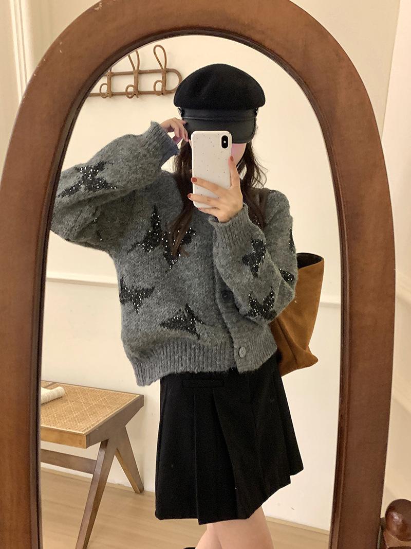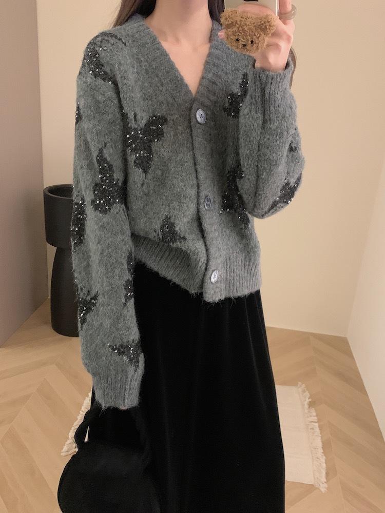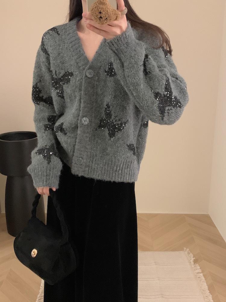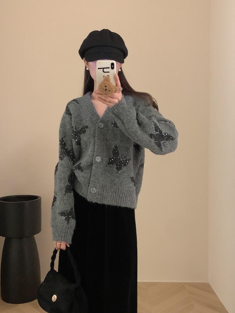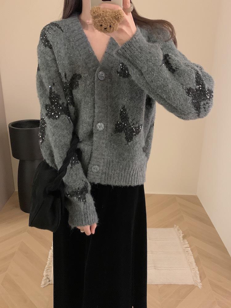 Otoño e invierno nuevo cárdigan de punto suave y suelto de cera para mujer, suéter de lentejuelas de mariposa de estilo occidental de alta gama para mujer