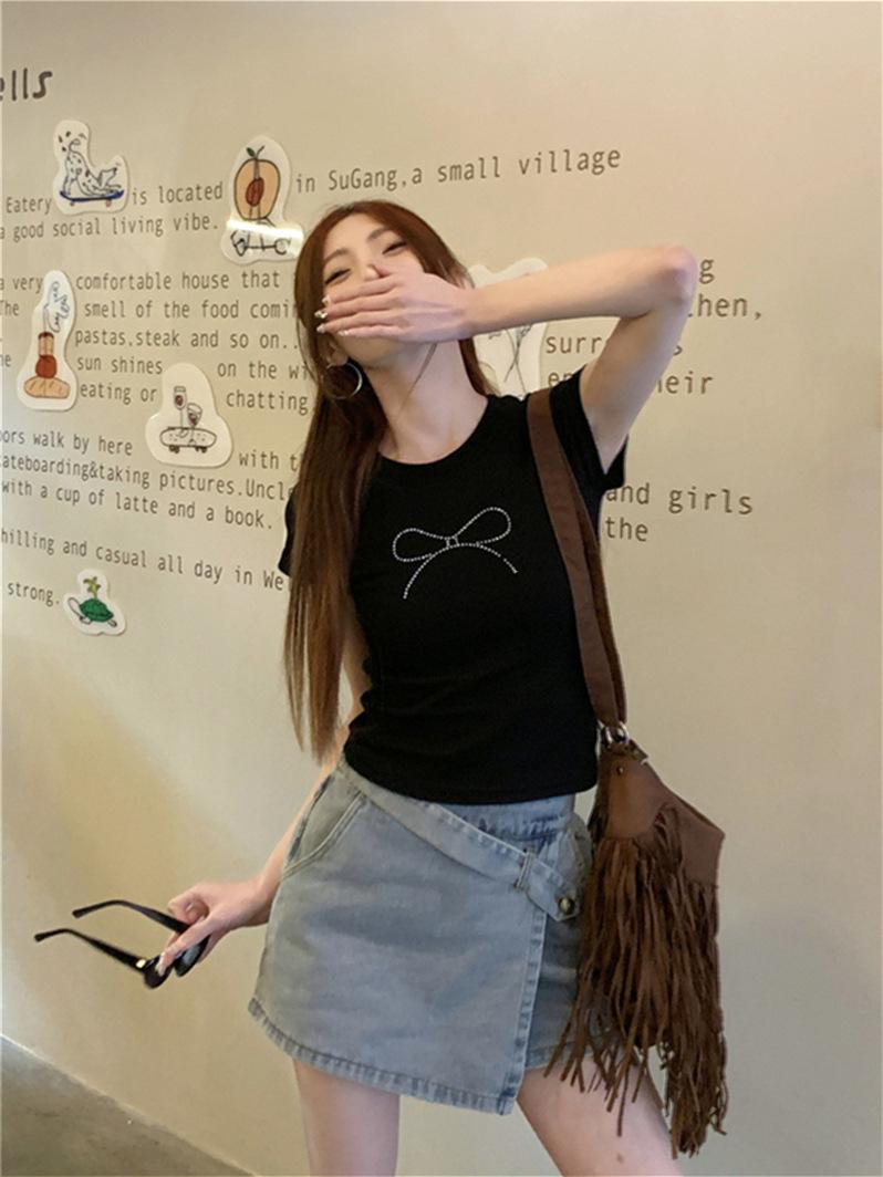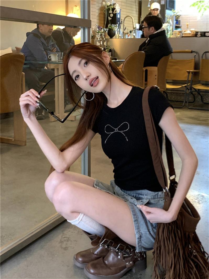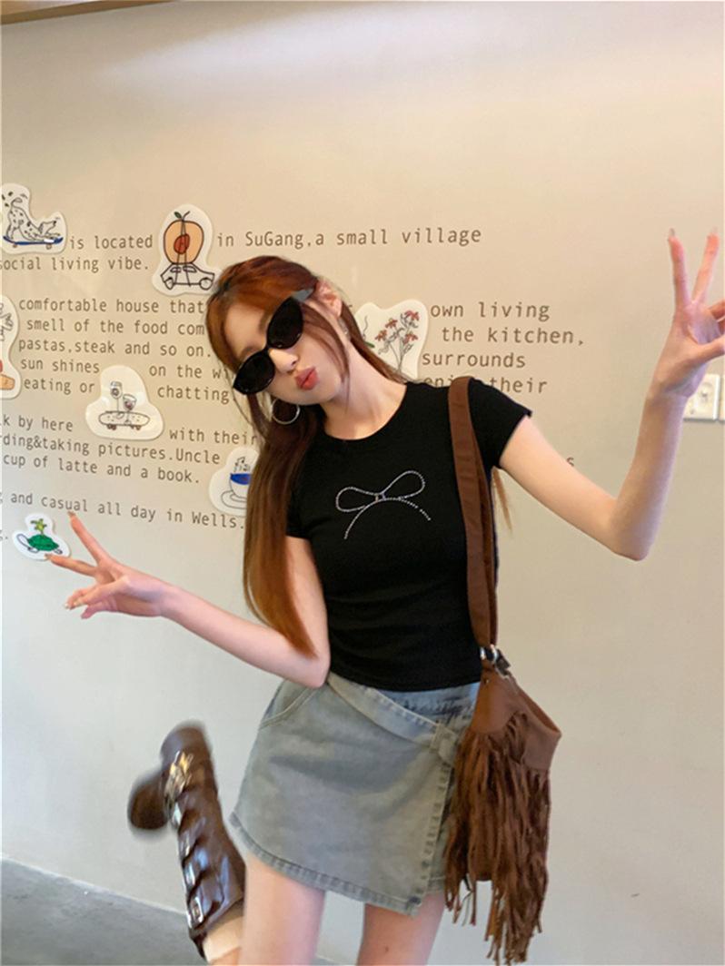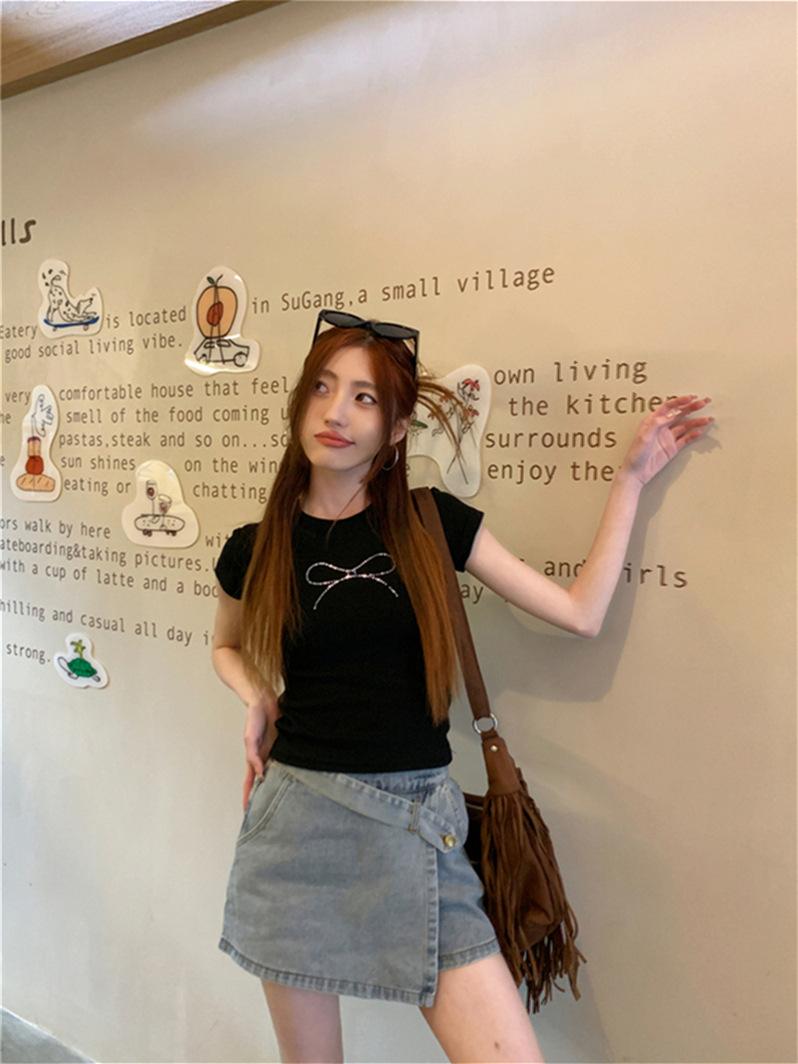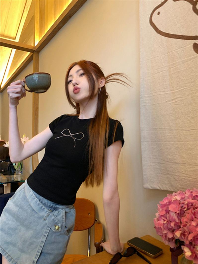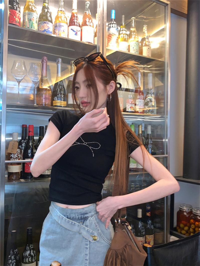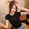 2025 Verano Estilo Americano Chica Caliente Camiseta Manga Corta Crop Top para Mujer Negro Lazo Pedrería Ajustado Top Corto Trendy