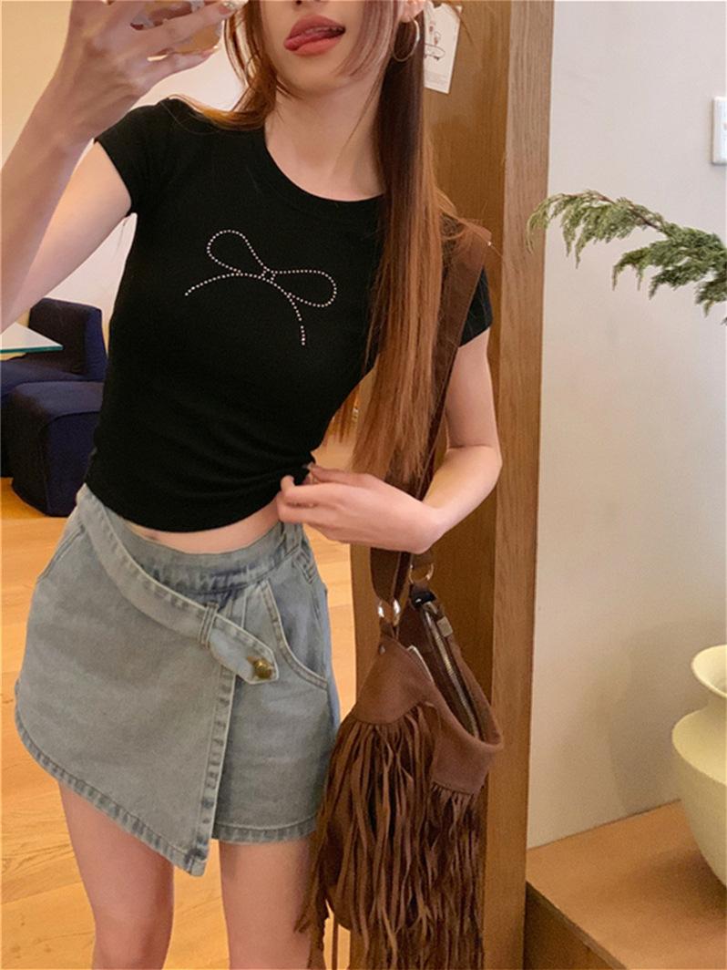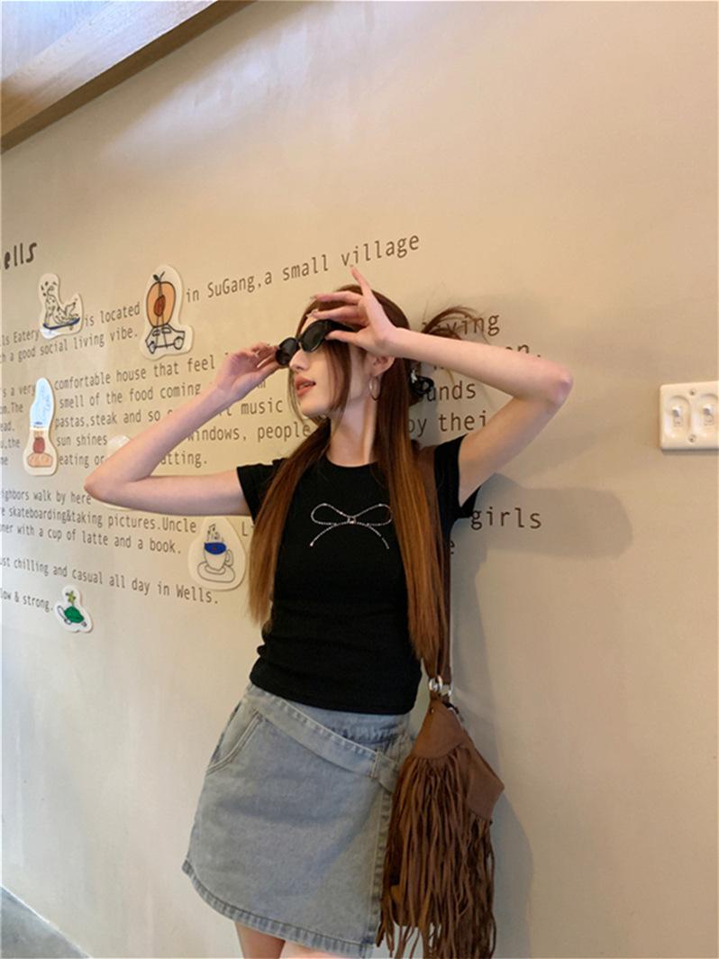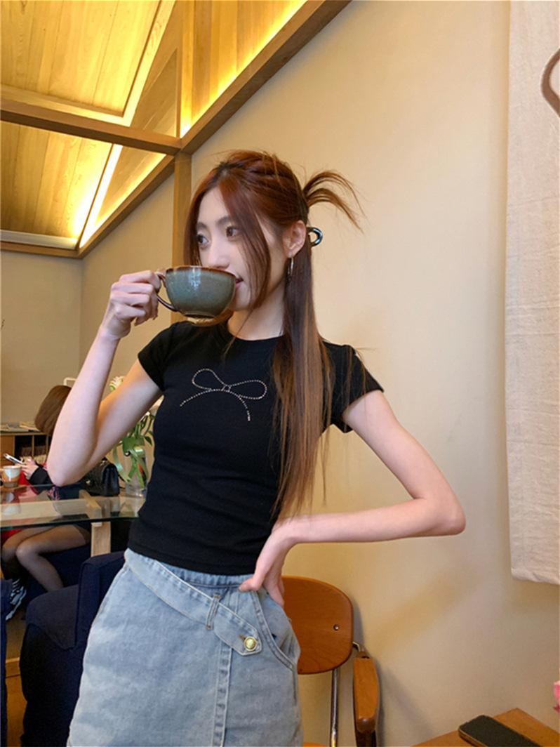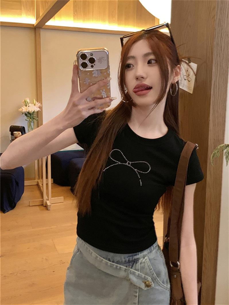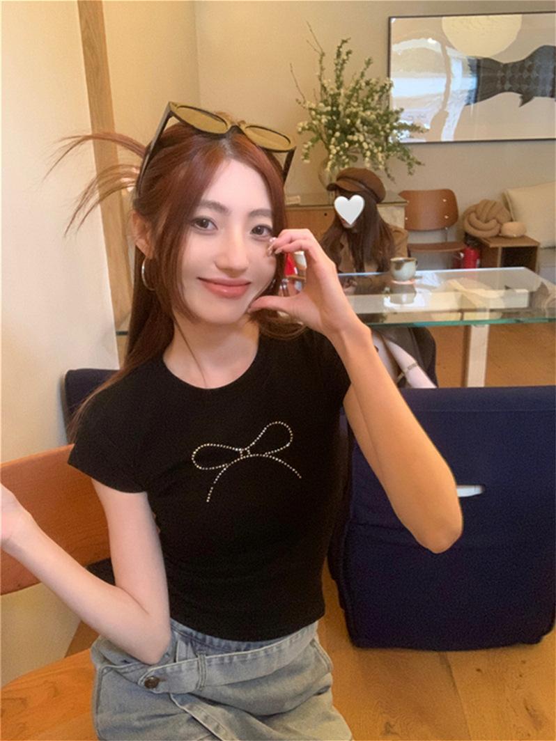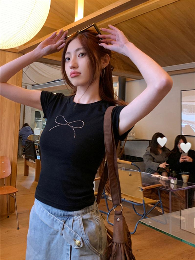 2025 Verano Estilo Americano Chica Caliente Camiseta Manga Corta Crop Top para Mujer Negro Lazo Pedrería Ajustado Top Corto Trendy