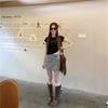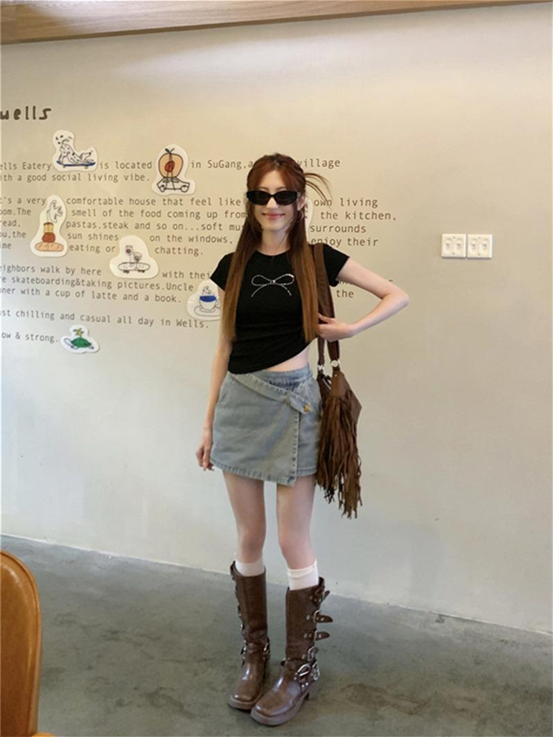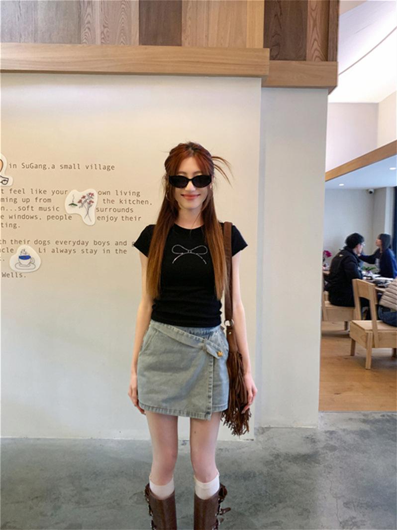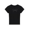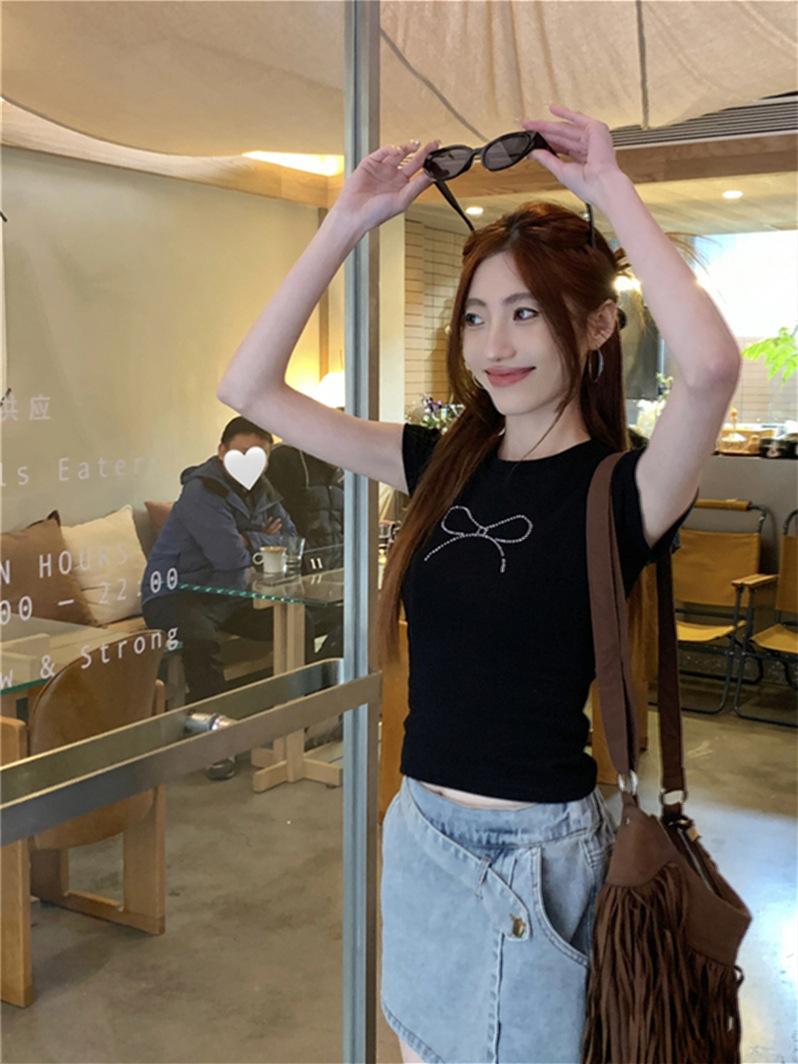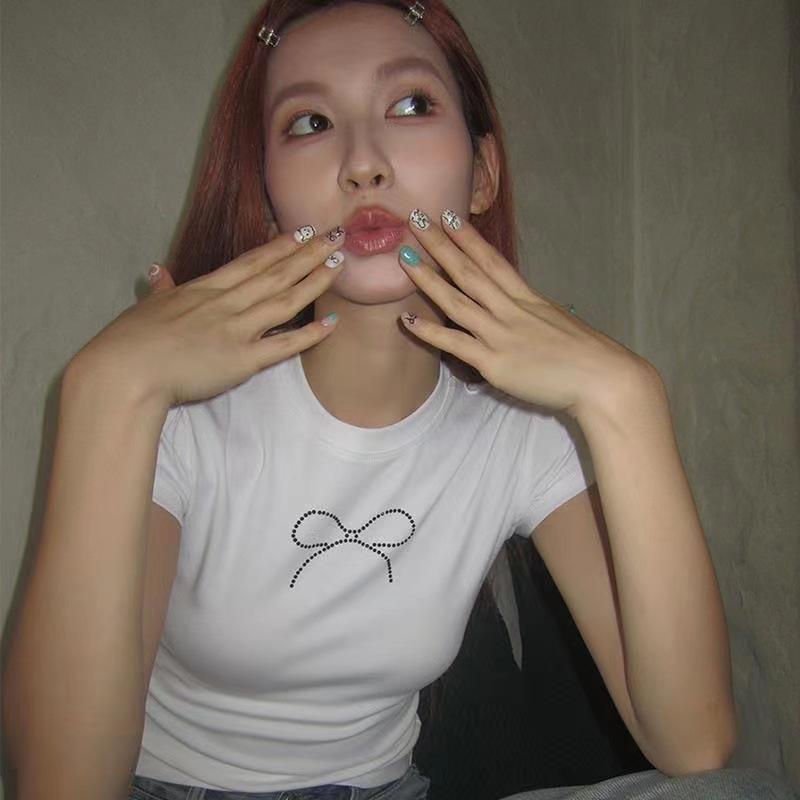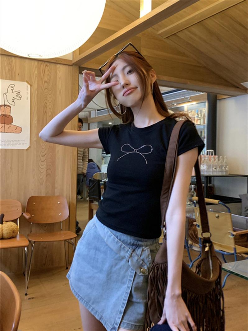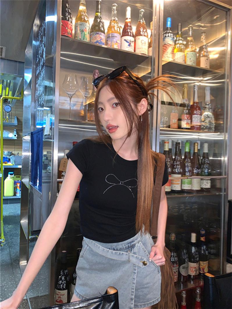 2025 Verano Estilo Americano Chica Caliente Camiseta Manga Corta Crop Top para Mujer Negro Lazo Pedrería Ajustado Top Corto Trendy