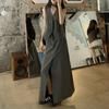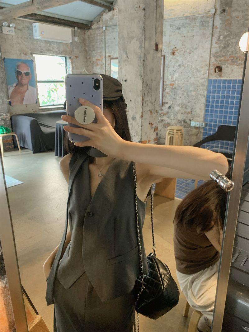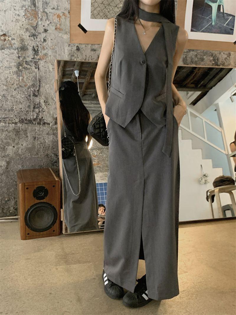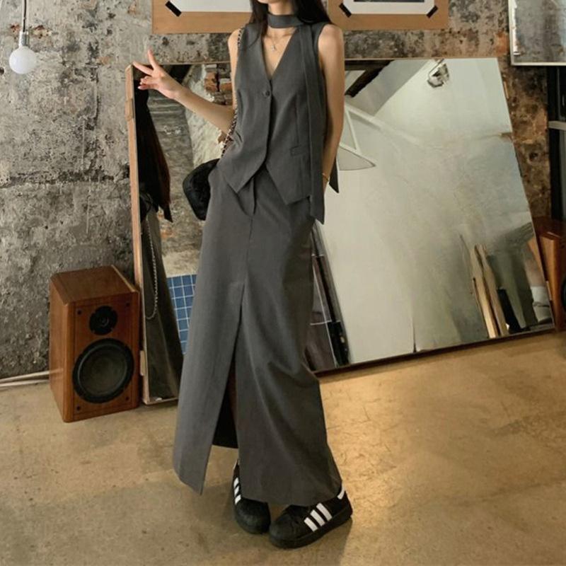 Traje Retro de Temperamento Chaleco Gris sin Mangas Falda con Abertura para Verano para Mujer Conjunto de Dos Piezas de Alta Gama