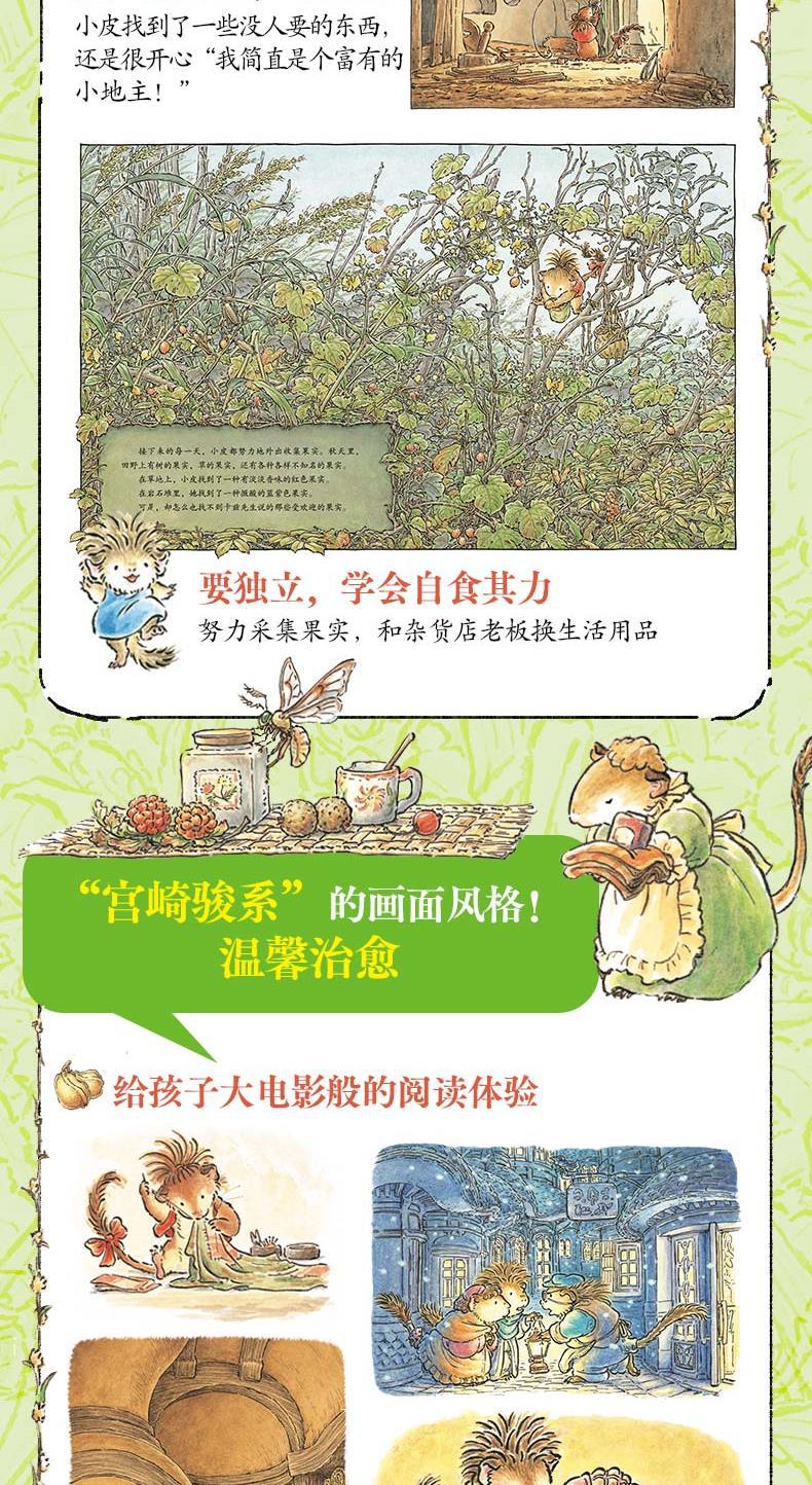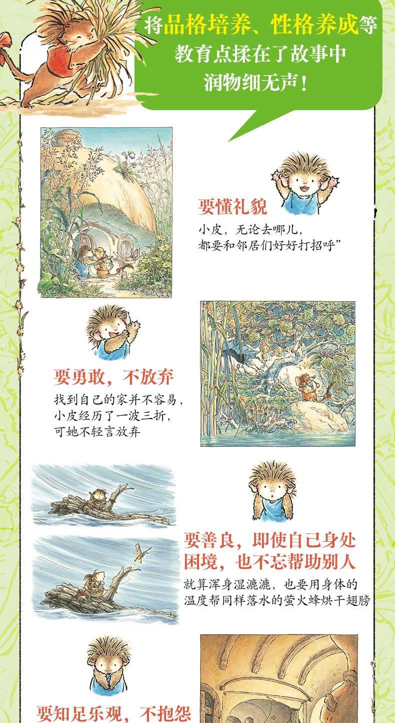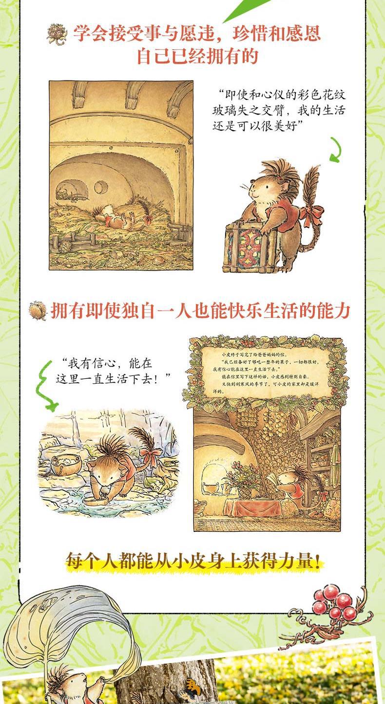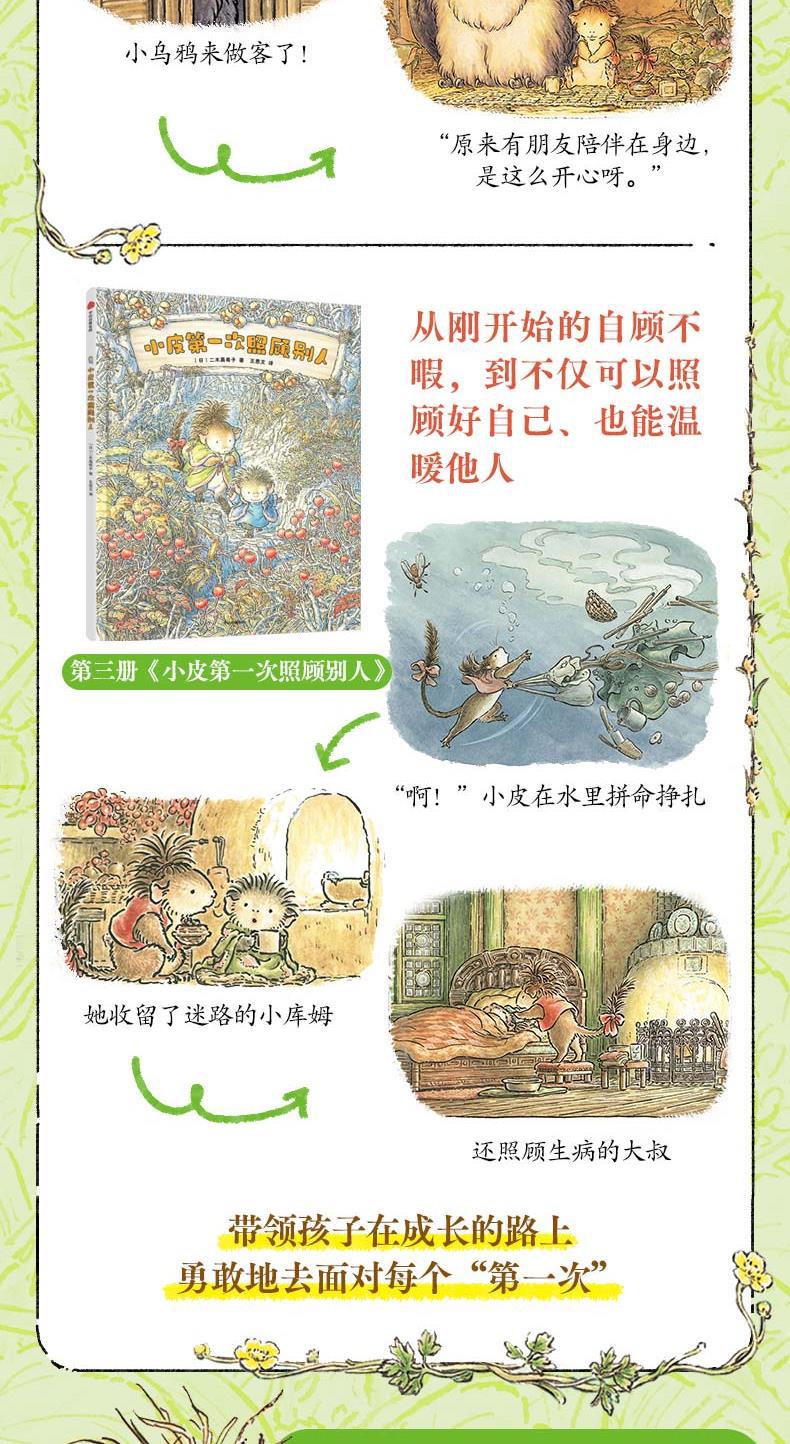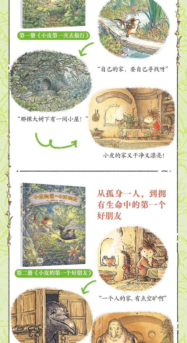 Esta serie de libros consta de tres volúmenes, cada uno titulado "El primer viaje de Xiao Pi", "El primer buen amigo de Xiao Pi" y "La primera vez que Xiao Pi cuida de los demás". "El primer viaje de Xiao Pi". A principios de verano, en una soleada mañana, Xiao Pi se despidió de sus padres, empacó su mochila y emprendió un largo viaje. Recorriendo bosques densos y ciudades bulliciosas, Xiao Pi anhelaba encontrar su propio hogar. Pasó por muchos lugares: las rocas altas ofrecían una buena vista, y Xiao Pi decidió acampar en las grietas de las rocas, pero el viento era demasiado fuerte; la cueva junto al río parecía atractiva, pero Xiao Pi cayó accidentalmente al agua; finalmente, después de algunas idas y venidas, Xiao Pi finalmente encontró su propio hogar. Ordenó su pequeño hogar de manera ordenada, cálido y acogedor. Xiao Pi es una niña valiente e independiente. Dejó a sus padres y se embarcó en un viaje de crecimiento en solitario. Al igual que el crecimiento de cada niño, hay dificultades y obstáculos, cariño y caricias, y ella ha experimentado cada "primera vez", y luego ha crecido gradualmente. "El primer buen amigo de la pequeña Pi". Un día, la pequeña Pi fue a la tienda de comestibles del Sr. Katz a comprar provisiones para el invierno. Vio un trozo de vidrio estampado de colores particularmente hermoso en la esquina de la tienda y le gustó mucho. Quería usarlo para decorar su casa. Pero este vidrio...