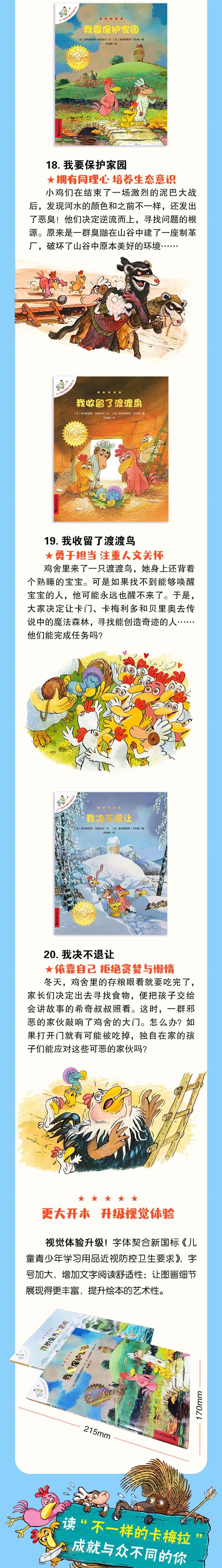 La serie de libros ilustrados más vendida "Carmela Diferente" atrae a muchos jóvenes lectores con magníficas ilustraciones, rica imaginación y argumentos inesperados. El libro está lleno de tramas emocionantes y lenguaje humorístico, y estas historias calientan la infancia de los niños. La descripción del libro de cualidades hermosas como los sueños, la amistad, la tolerancia, el coraje, la sabiduría y las interpretaciones alternativas de pinturas mundialmente famosas atrae profundamente a los niños y es buscada por los fans de Carmela. El libro pintado a mano lanzado recientemente tiene un tamaño y una fuente más grandes, lo que hace que la disposición del texto sea más cómoda y permite que los maravillosos detalles de las imágenes se muestren de forma más vívida, acercándose al nuevo estándar nacional para la prevención y el control de la miopía en niños y adolescentes, y mejorando la comodidad y la experiencia de lectura.