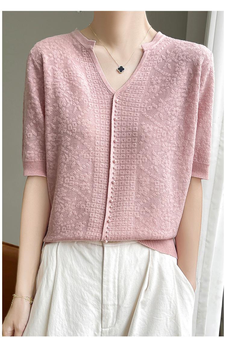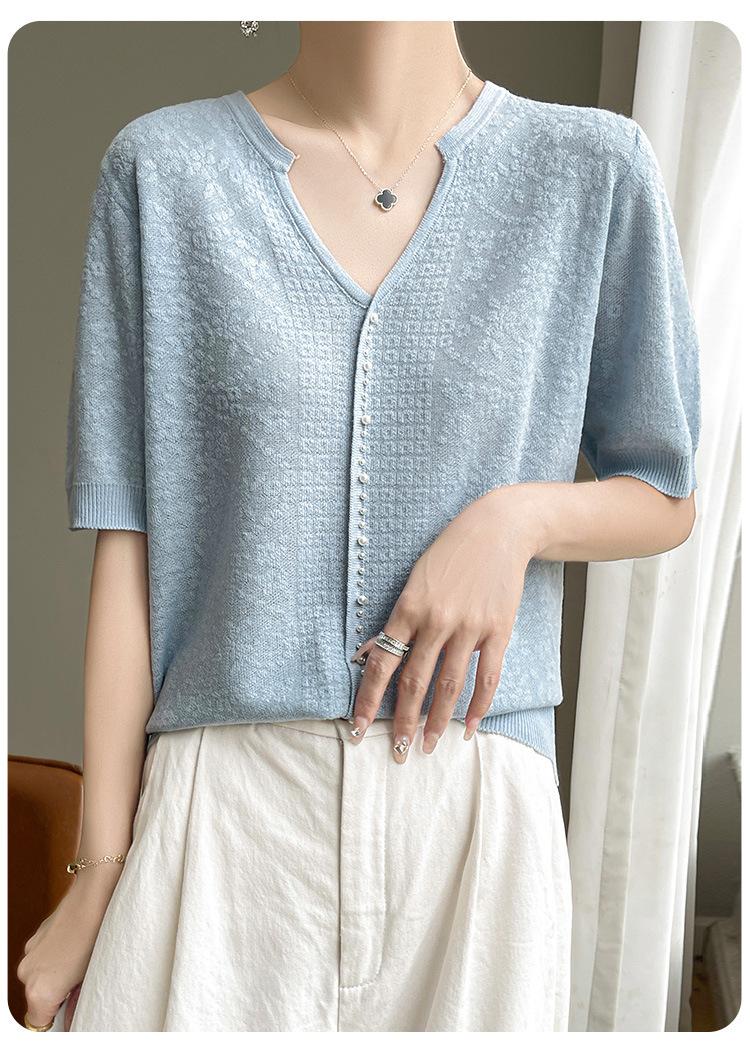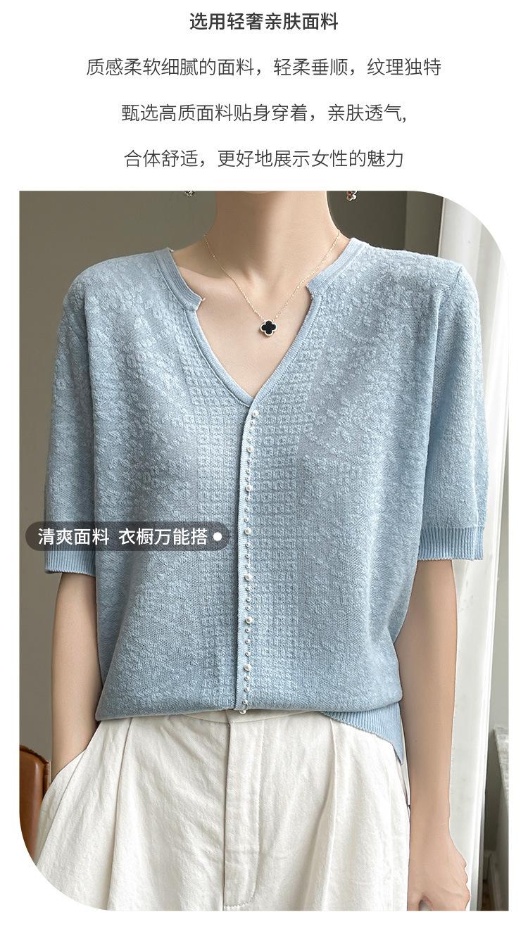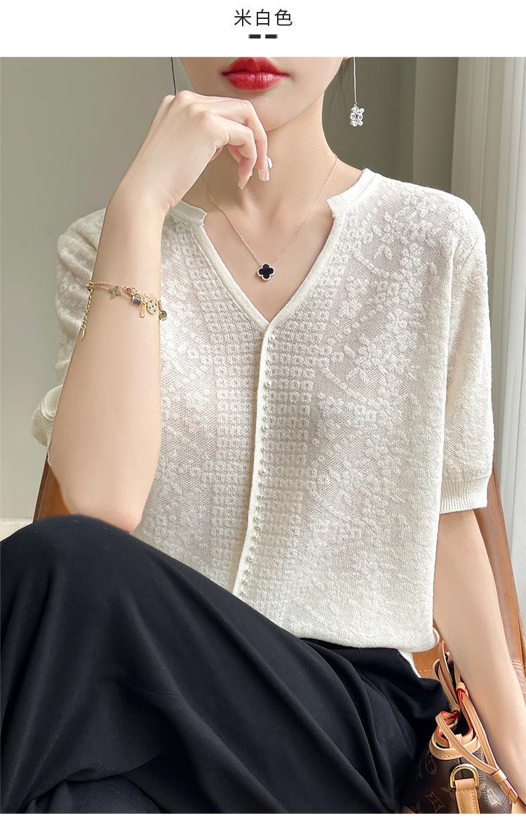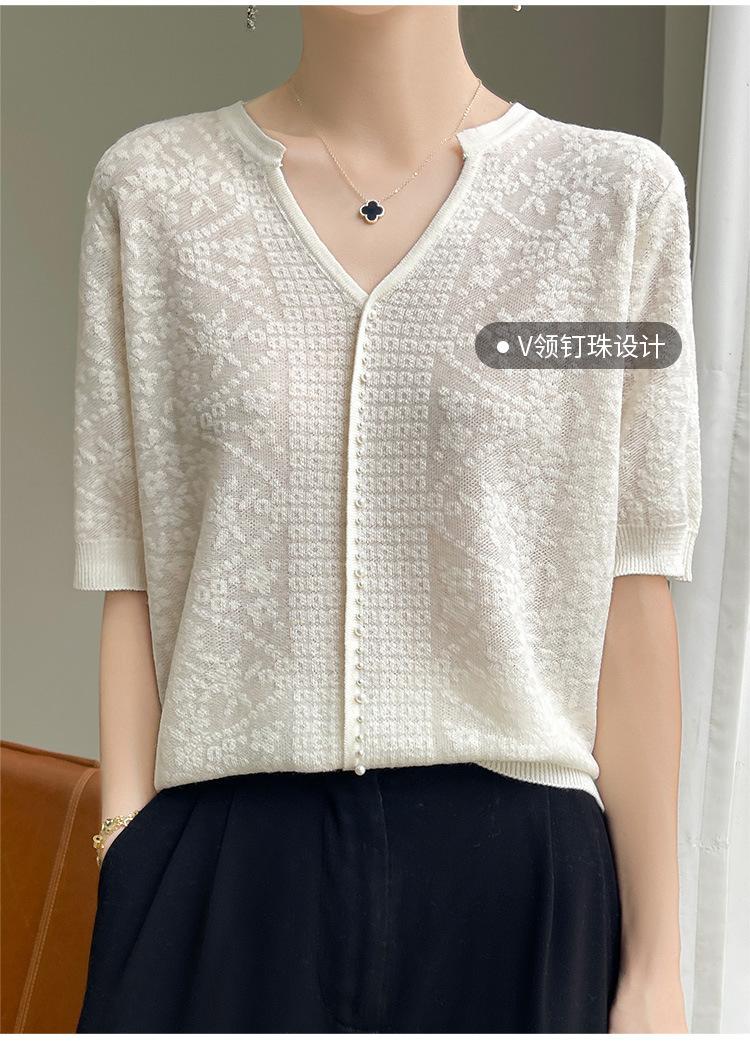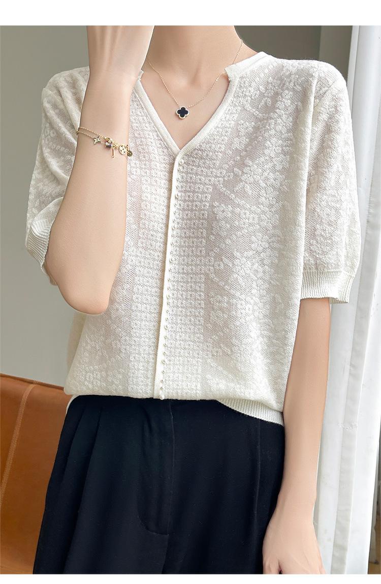 Camisa de punto con cuentas y cuello en V, estilo nacional chino, mezcla de seda morera y tencel, top de crochet hueco, novedad de verano de 2024