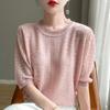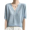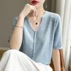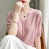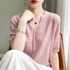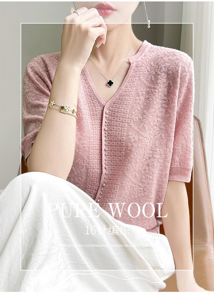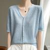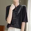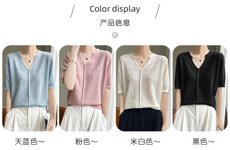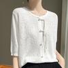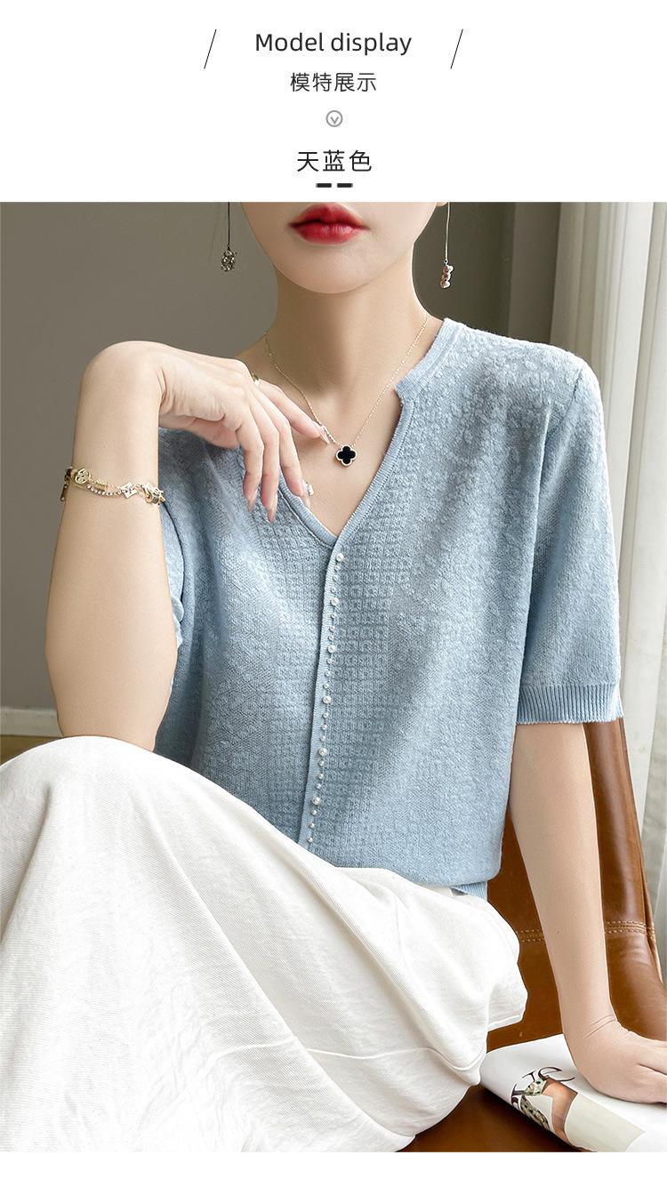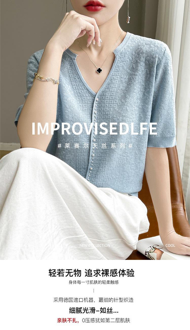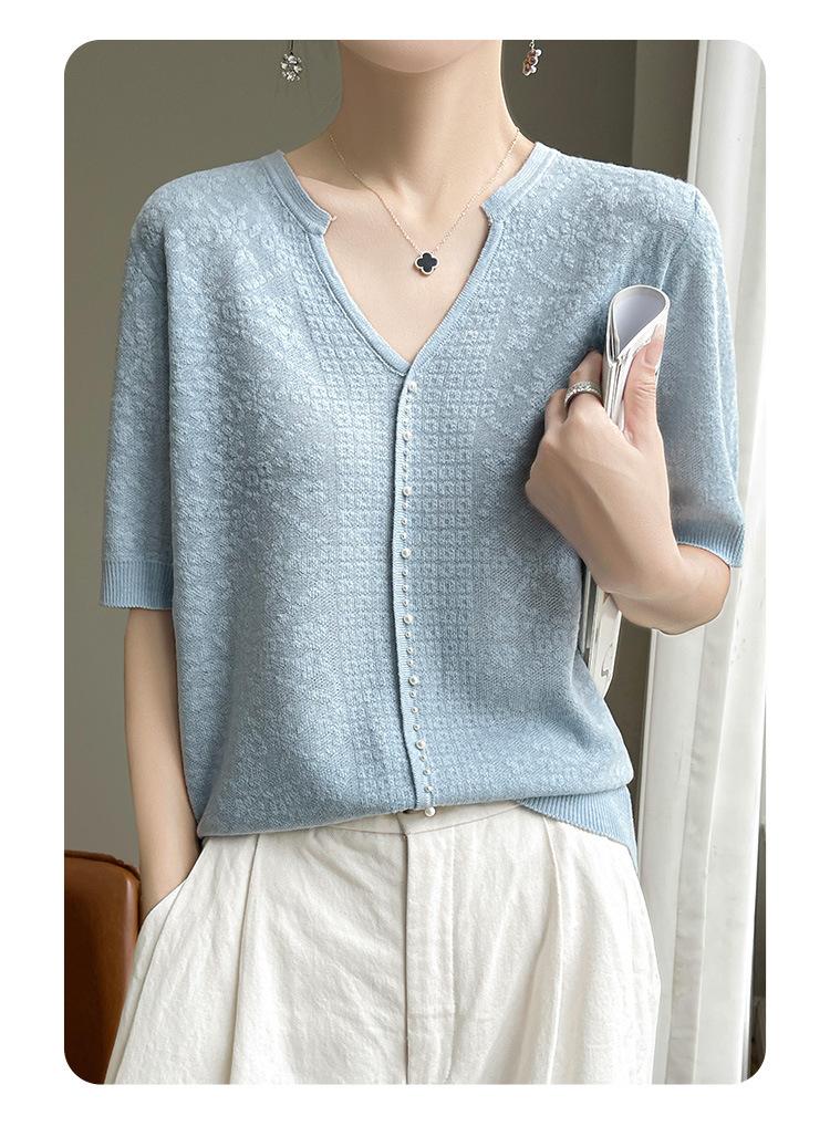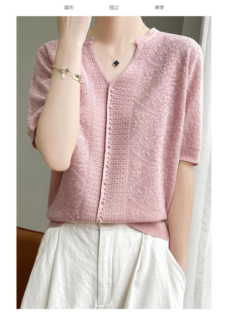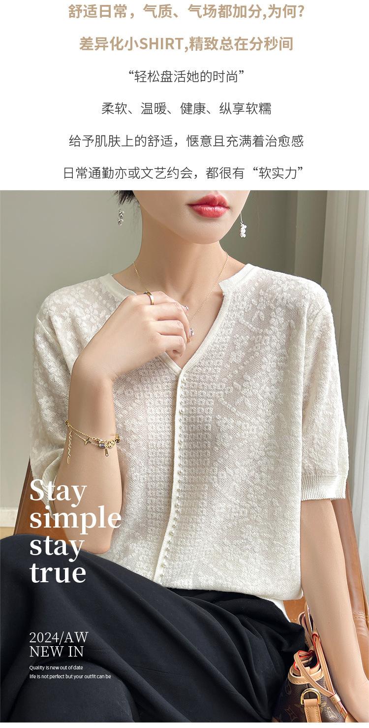 Camisa de punto con cuentas y cuello en V, estilo nacional chino, mezcla de seda morera y tencel, top de crochet hueco, novedad de verano de 2024