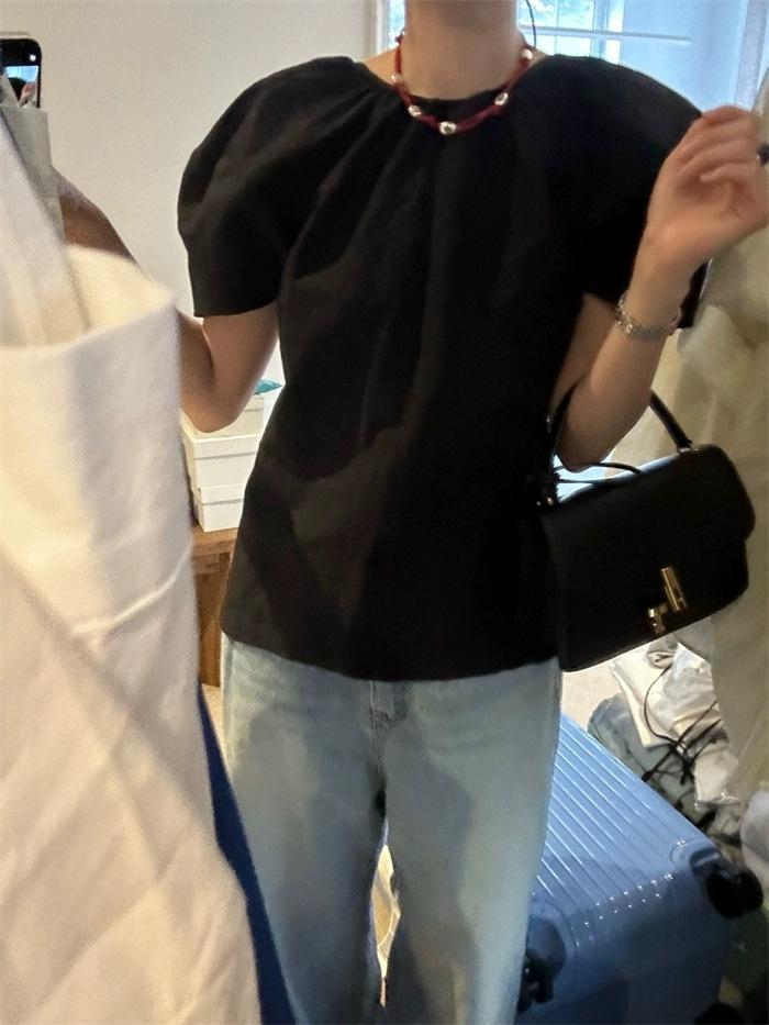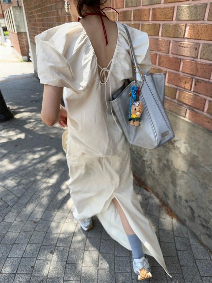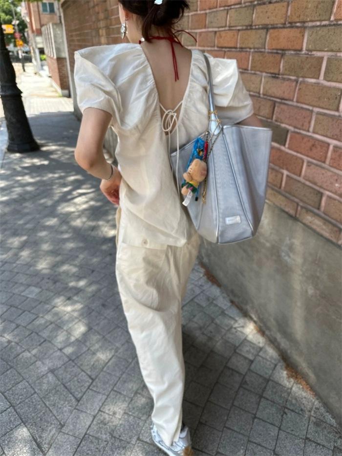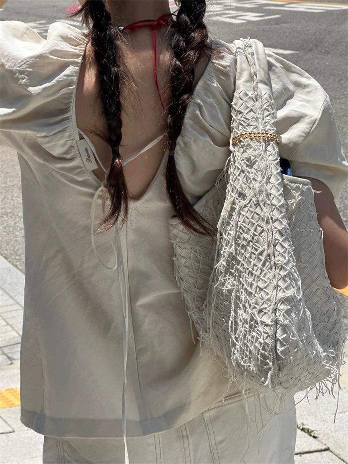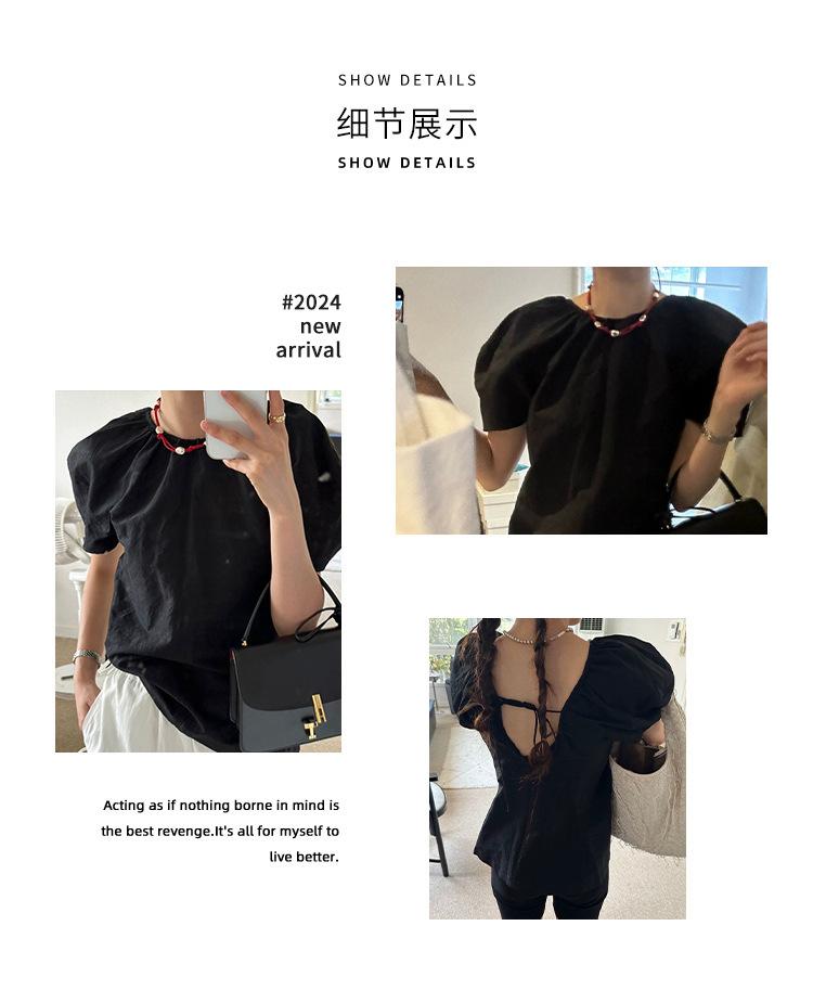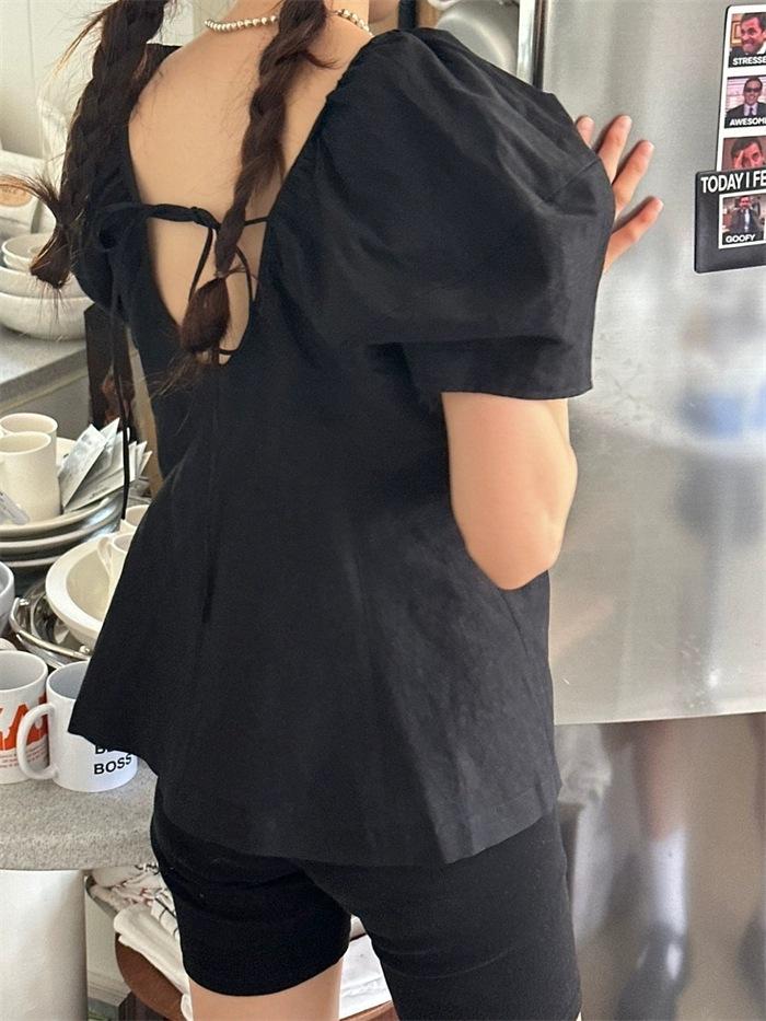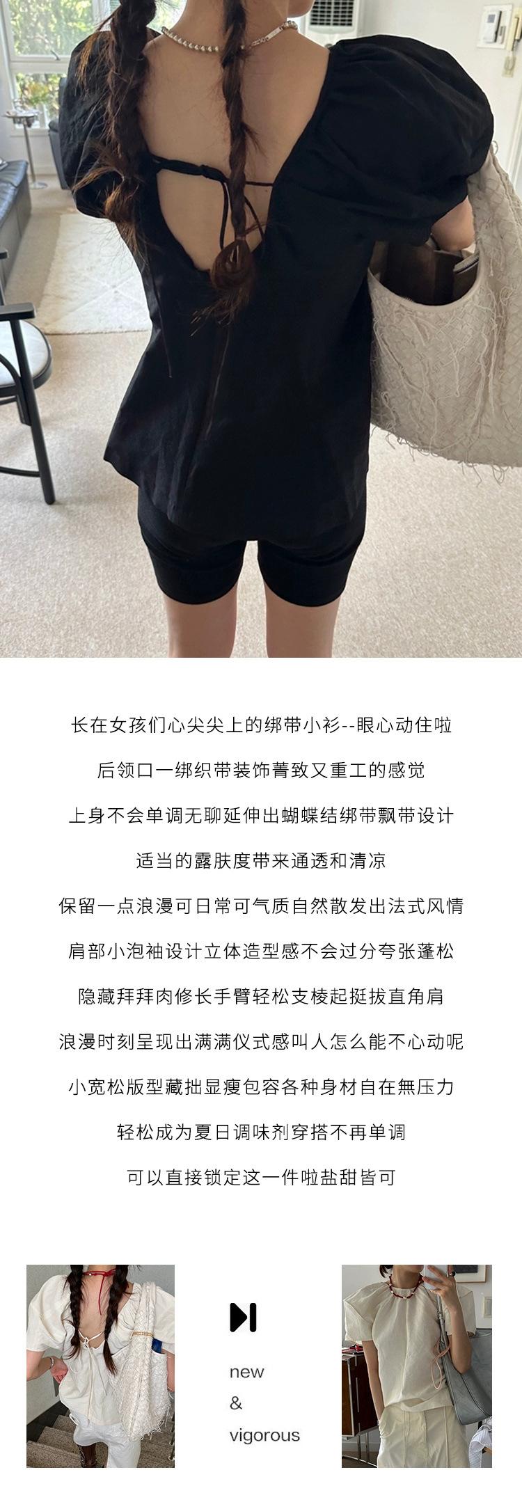 Sin Devoluciones ni Cambios, Liquidación 2025 Nuevo Verano Coreano Dongdaemun Ri*Bonbit Camisa de Encaje con Cordones en la Espalda sin Espalda de Manga Corta