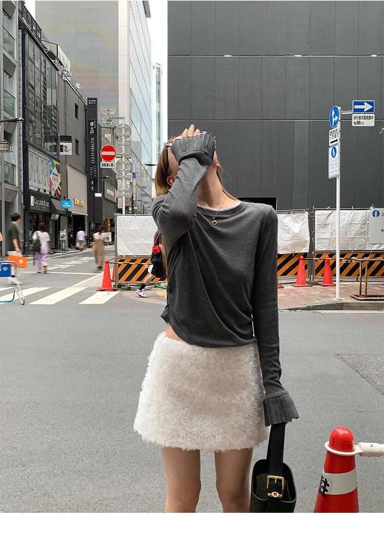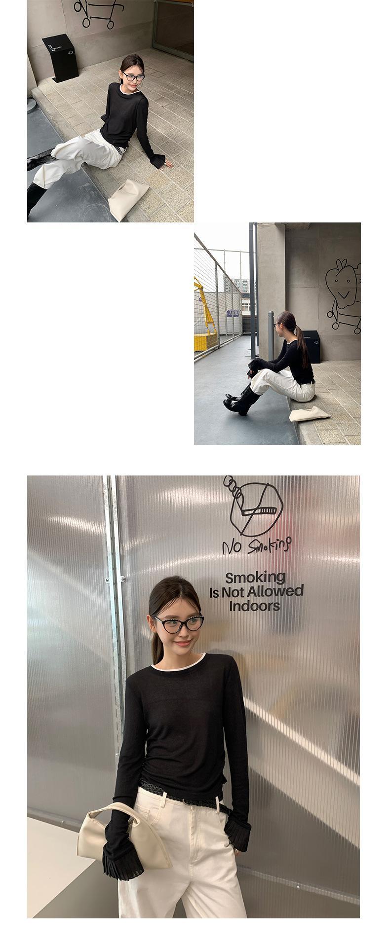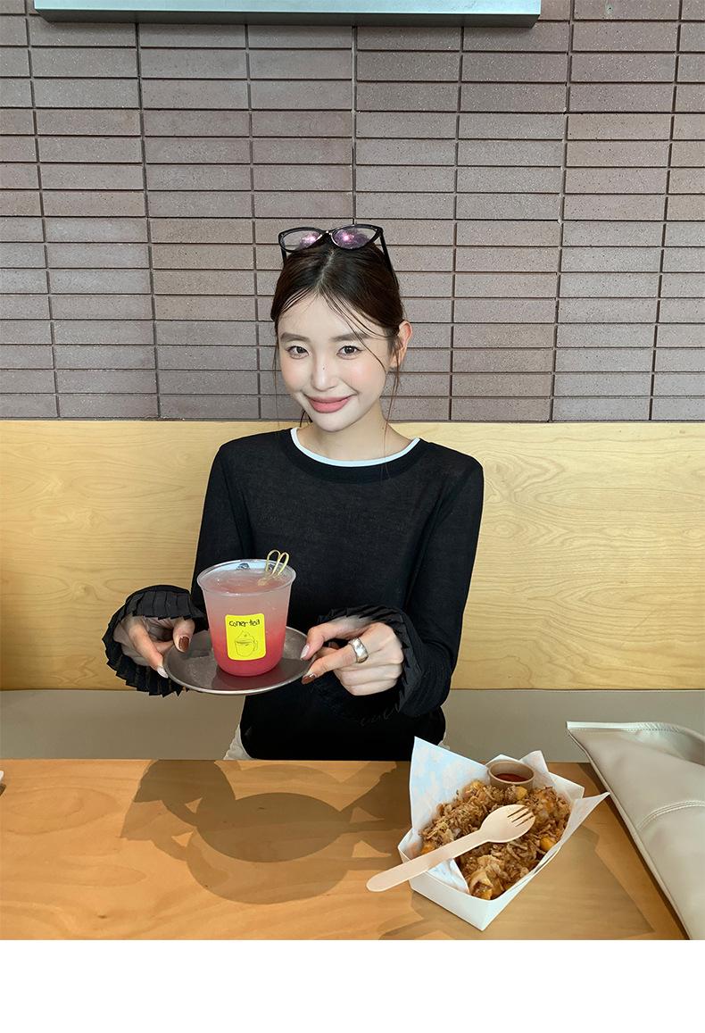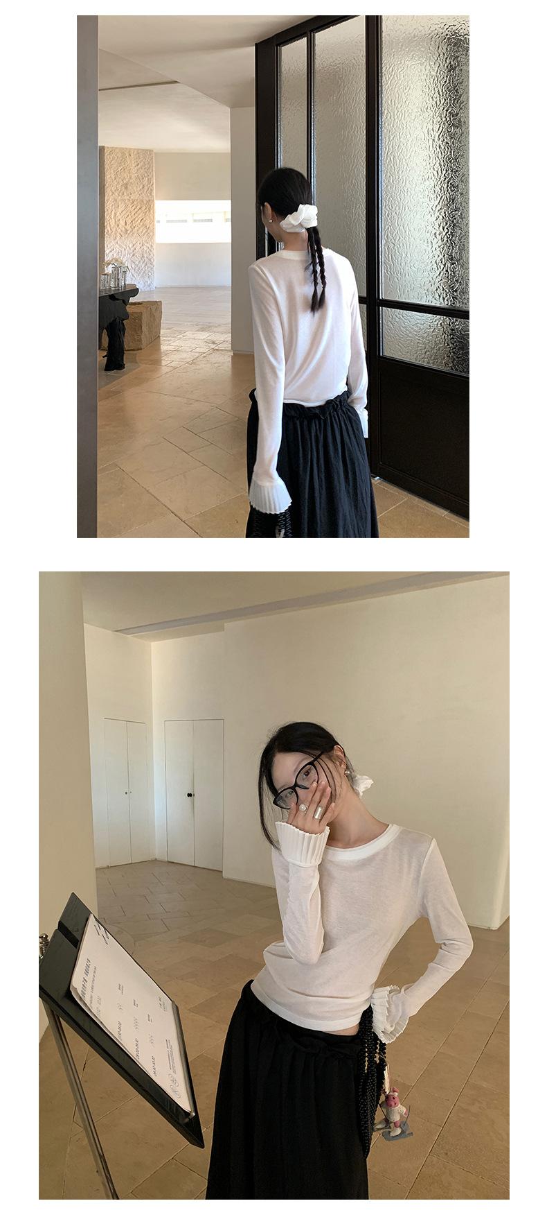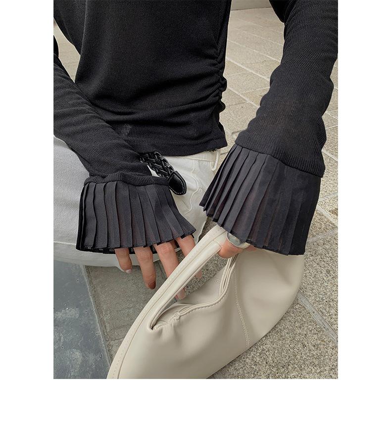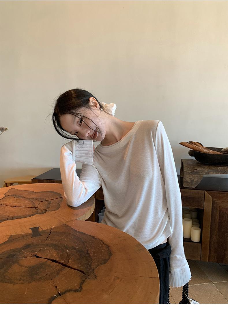 Dreaming DT ETOLIE Sentido del Diseño Camiseta de Manga Larga con Cintura Plisada para Mujer, Corte Slim, Manga Acampanada, Cuello con Costuras, Top Corto