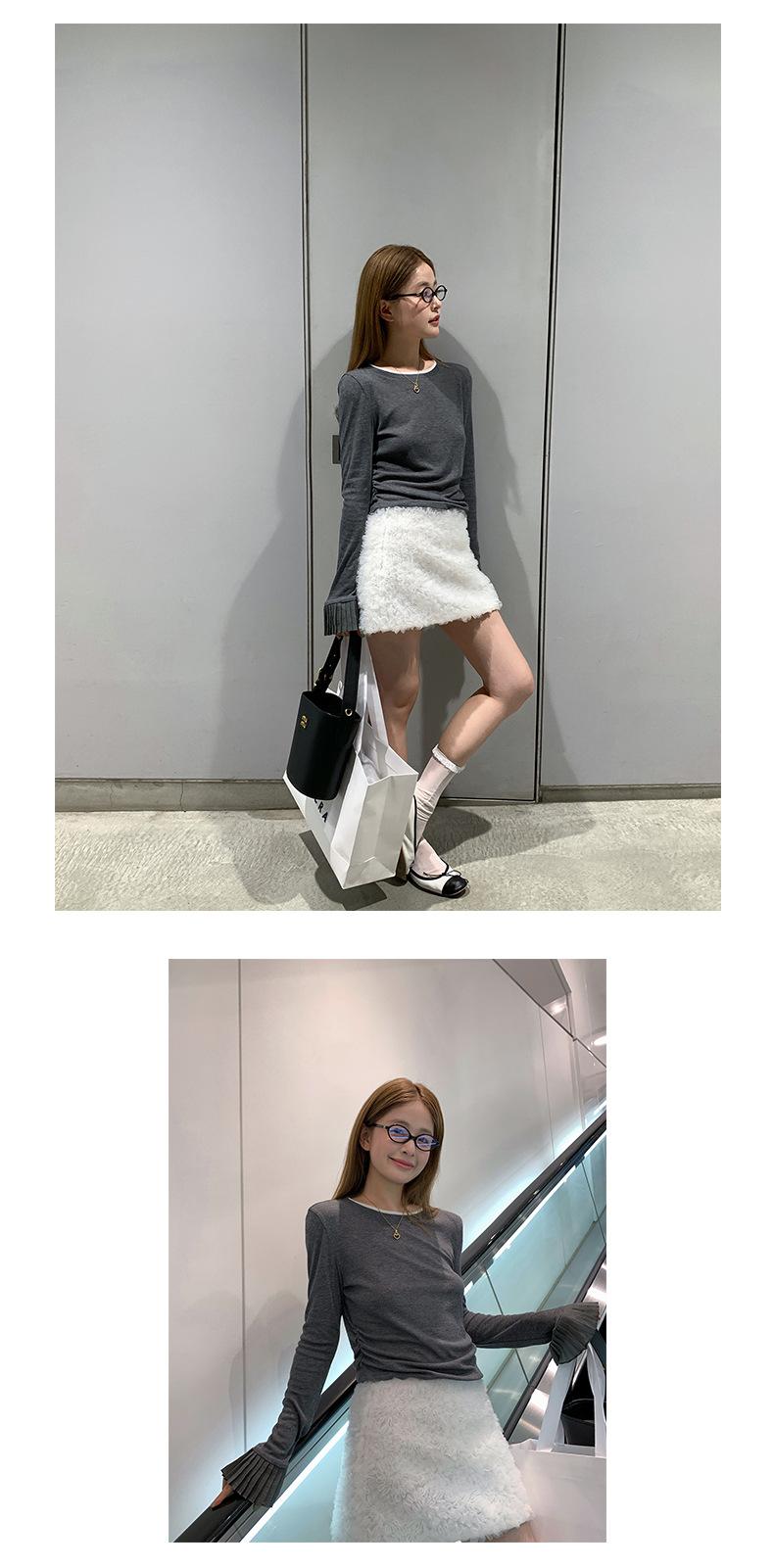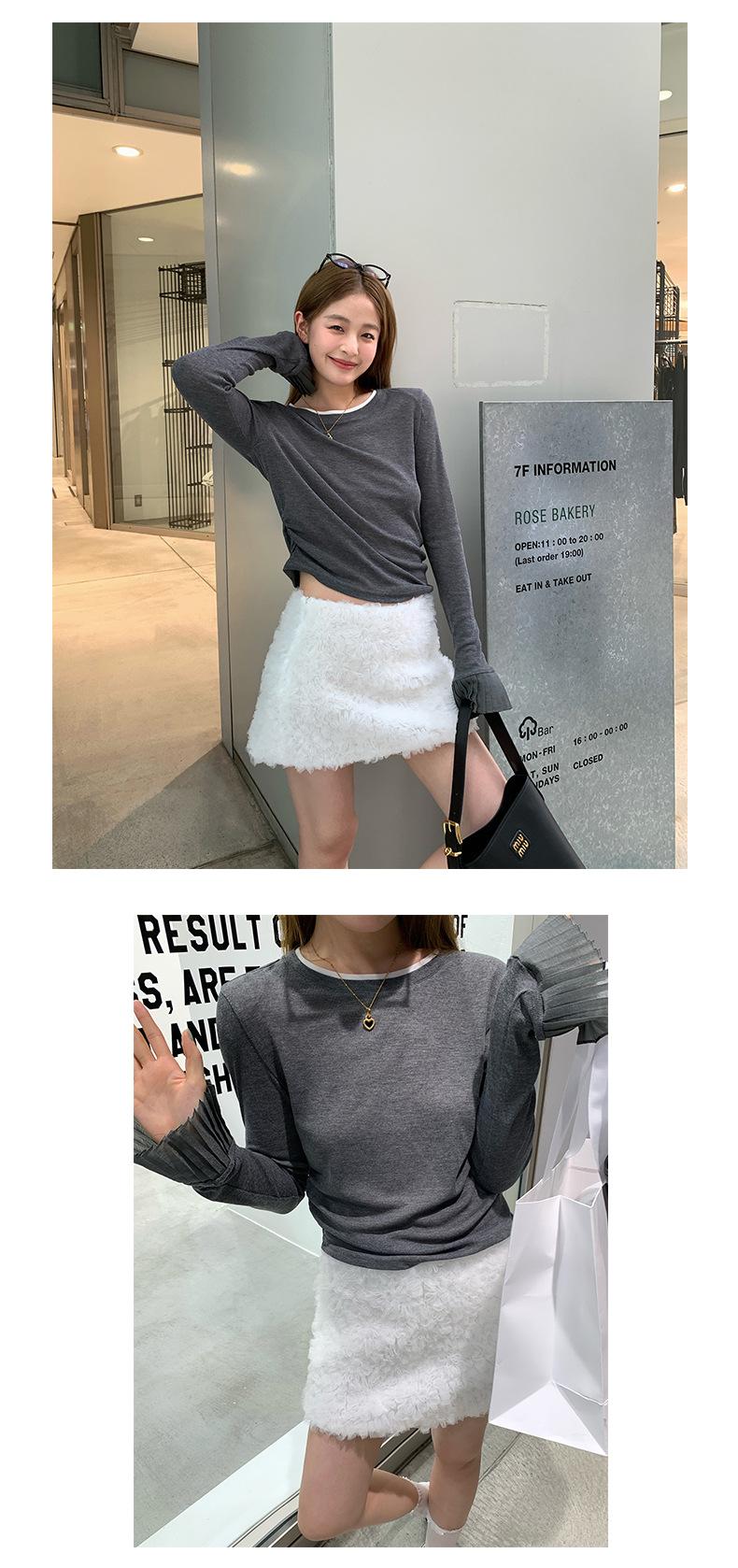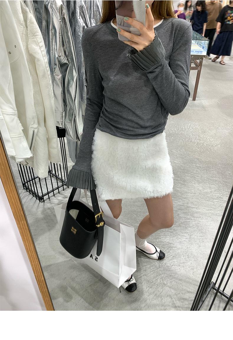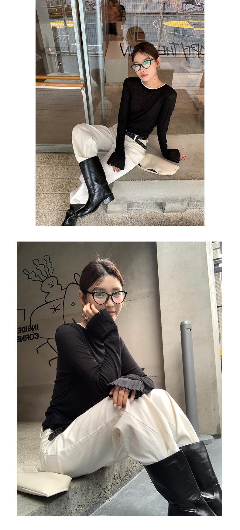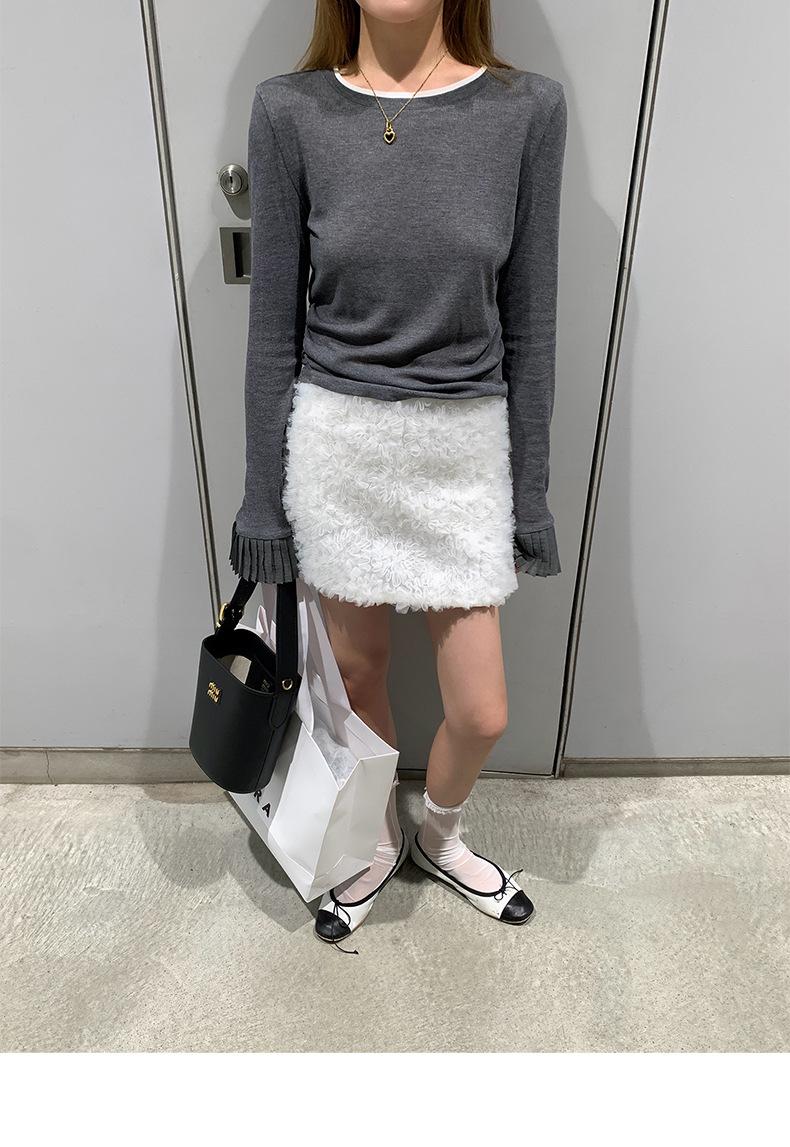 Dreaming DT ETOLIE Sentido del Diseño Camiseta de Manga Larga con Cintura Plisada para Mujer, Corte Slim, Manga Acampanada, Cuello con Costuras, Top Corto