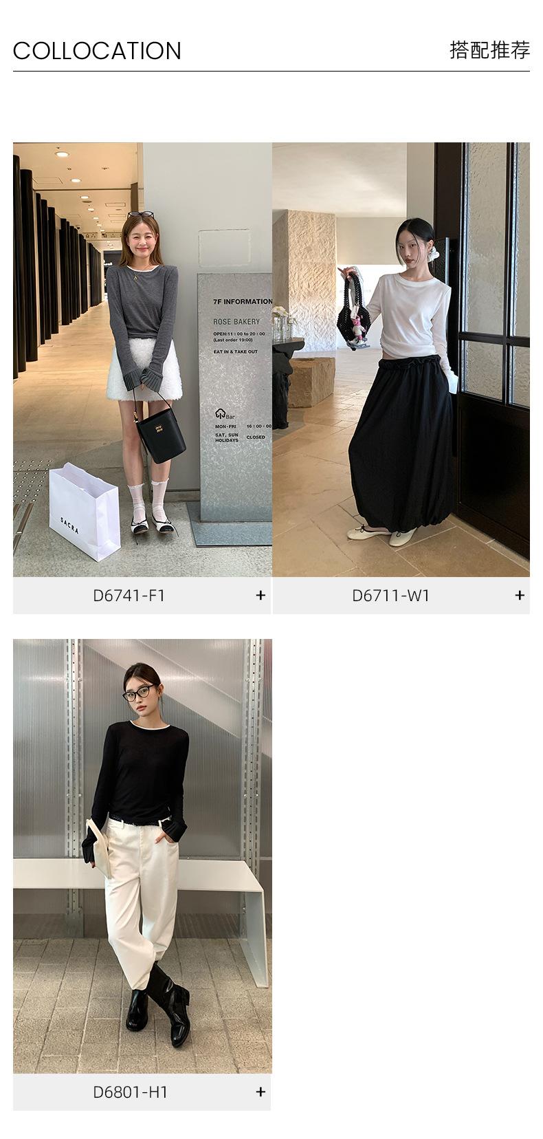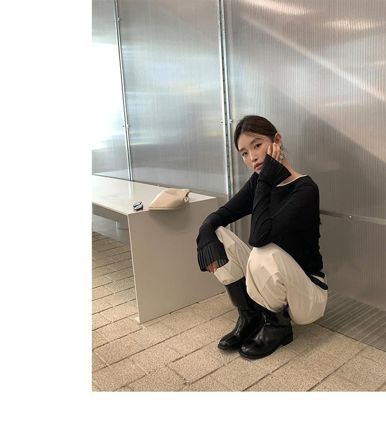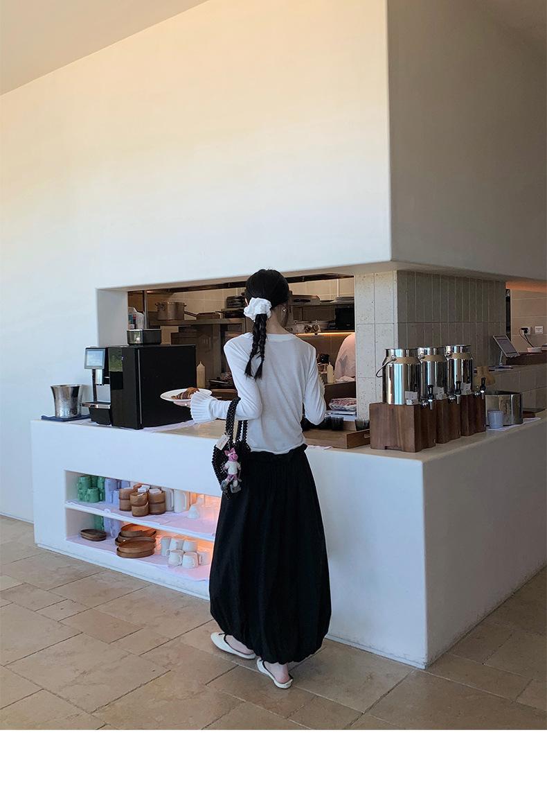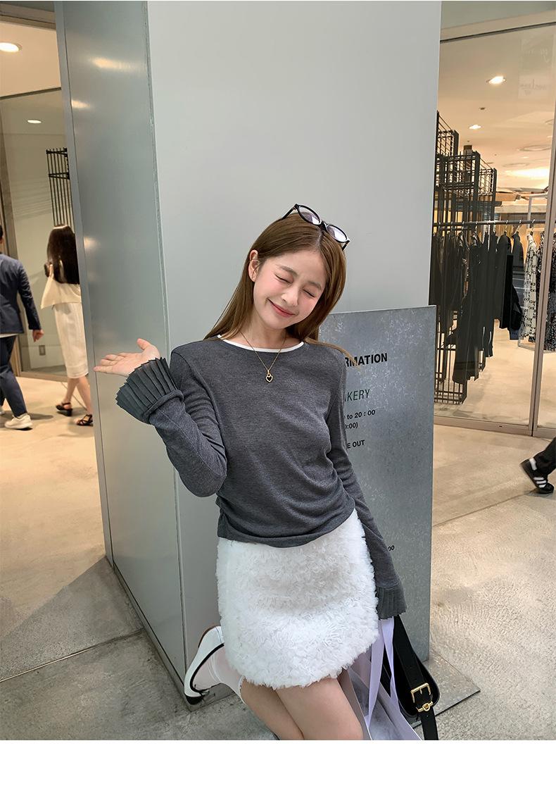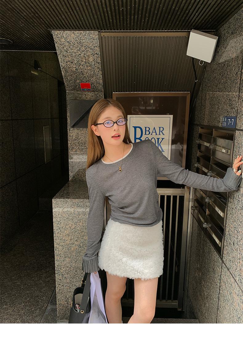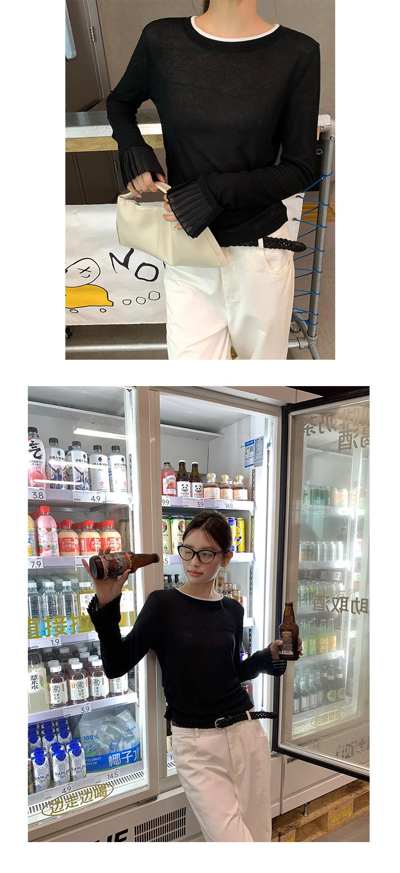 Dreaming DT ETOLIE Sentido del Diseño Camiseta de Manga Larga con Cintura Plisada para Mujer, Corte Slim, Manga Acampanada, Cuello con Costuras, Top Corto