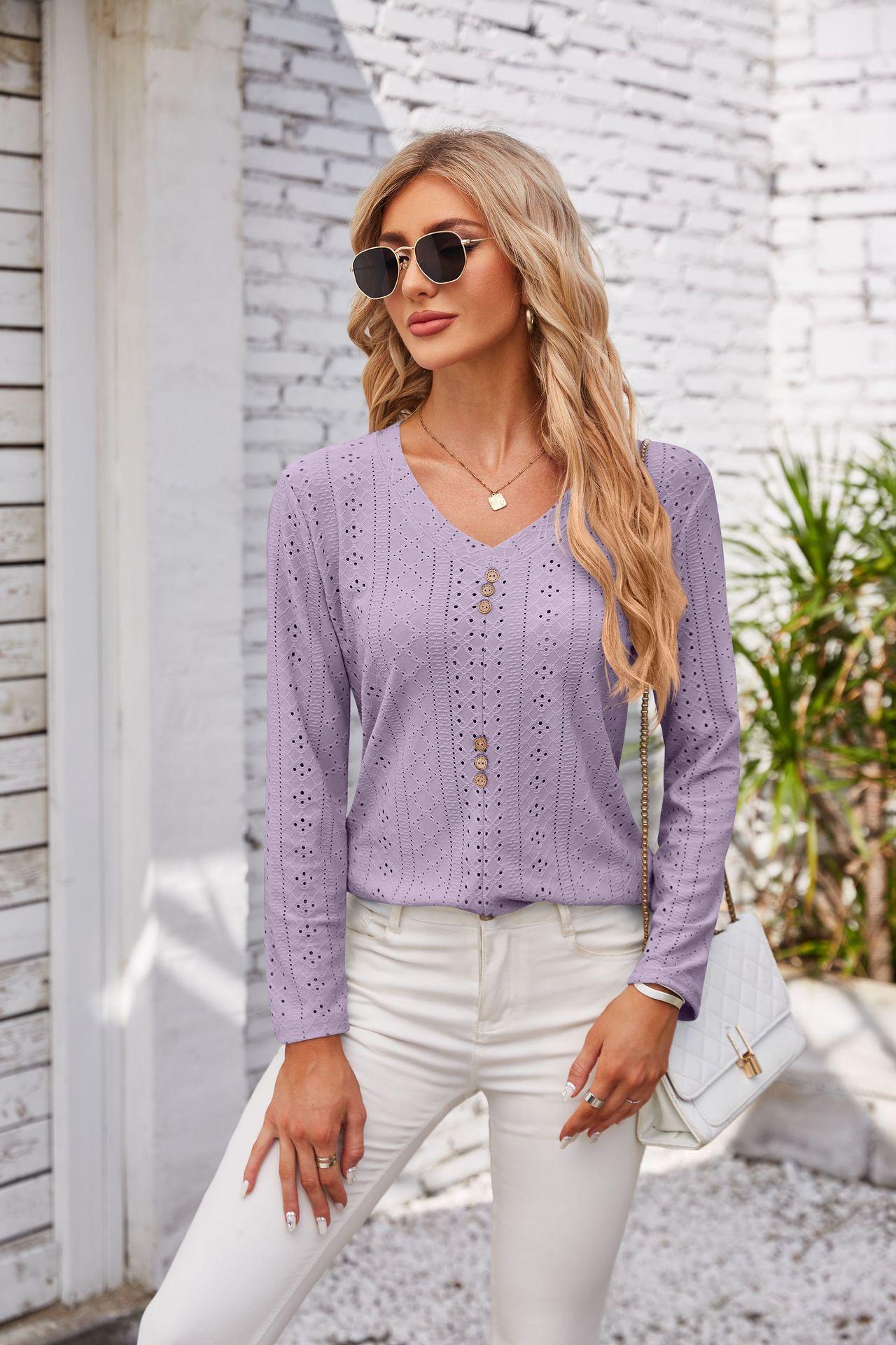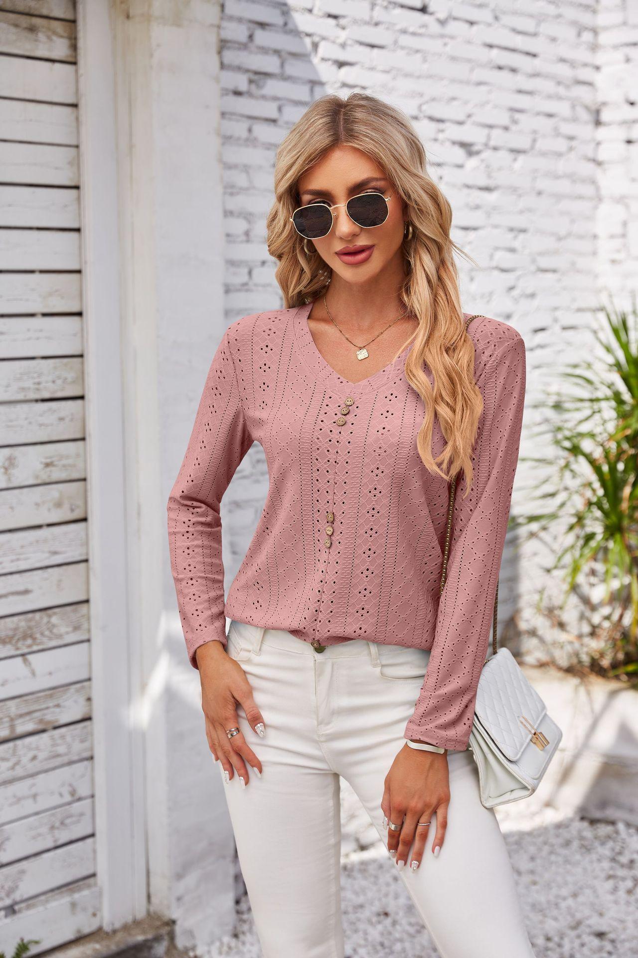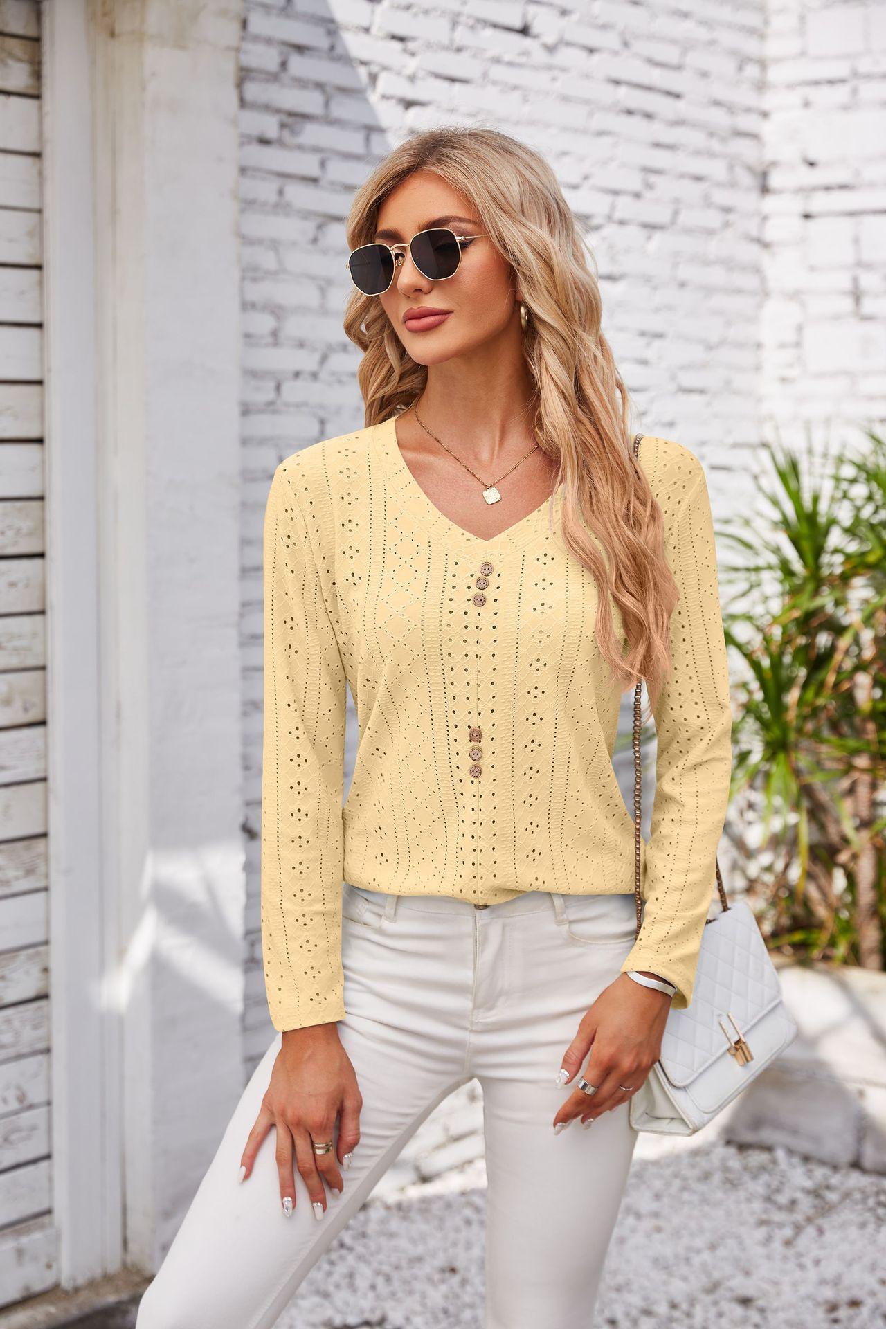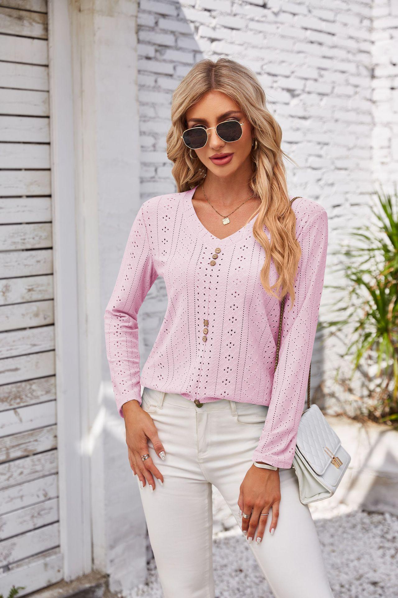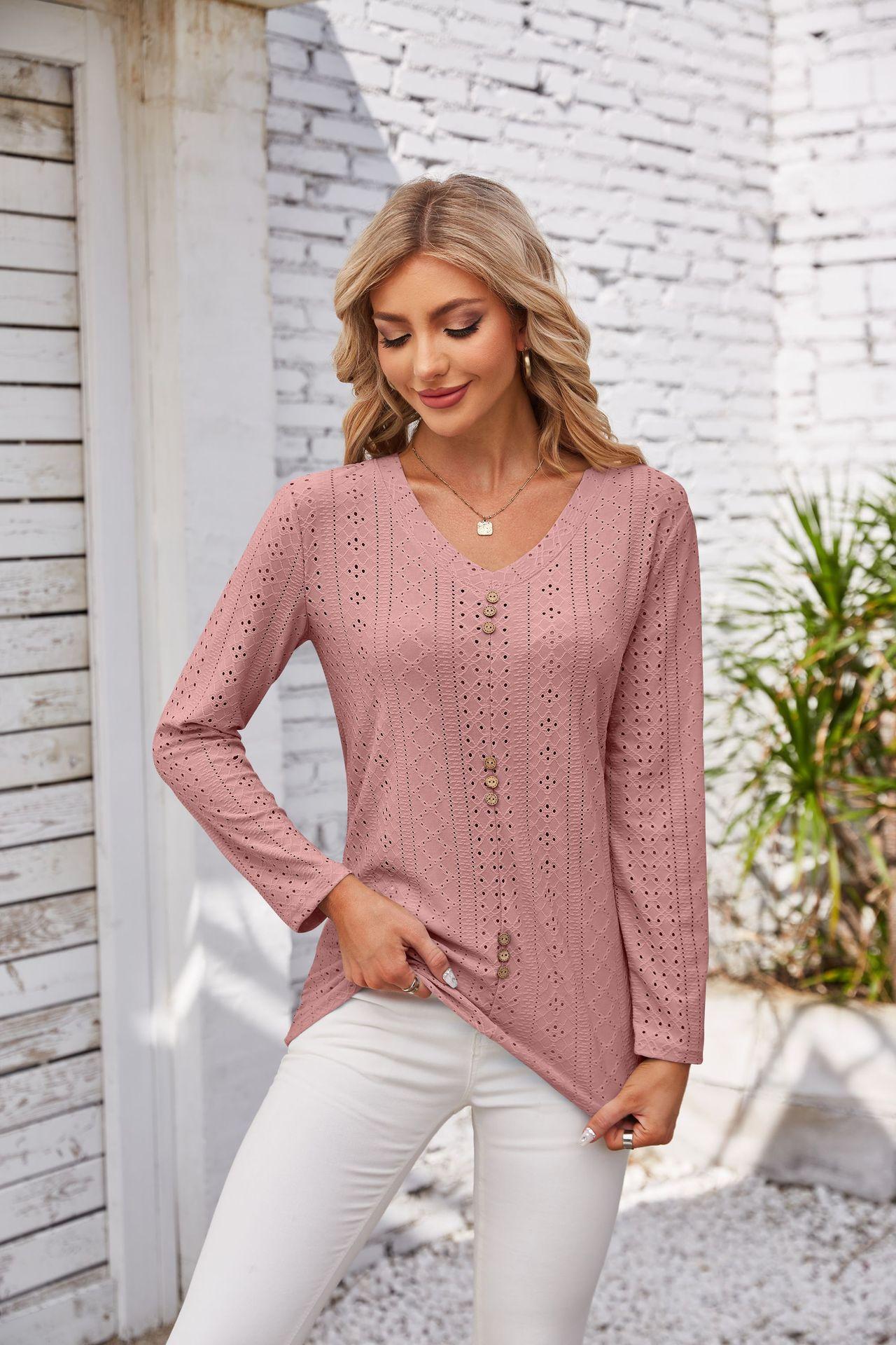 Camiseta de manga larga con cuello en V y botones sueltos para mujer, nueva camiseta informal de primavera y verano de comercio exterior transfronterizo europeo y americano de Amazon 2024