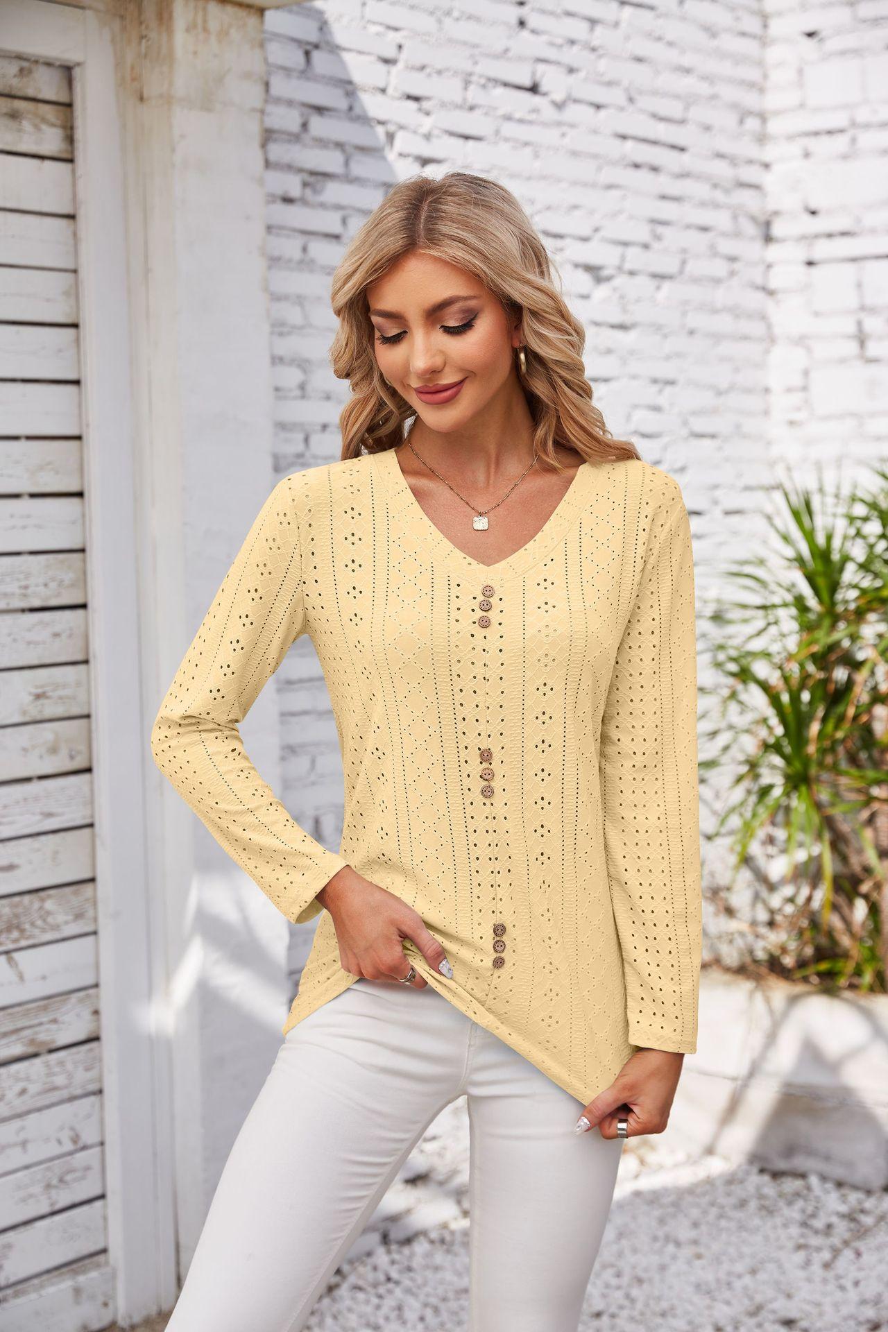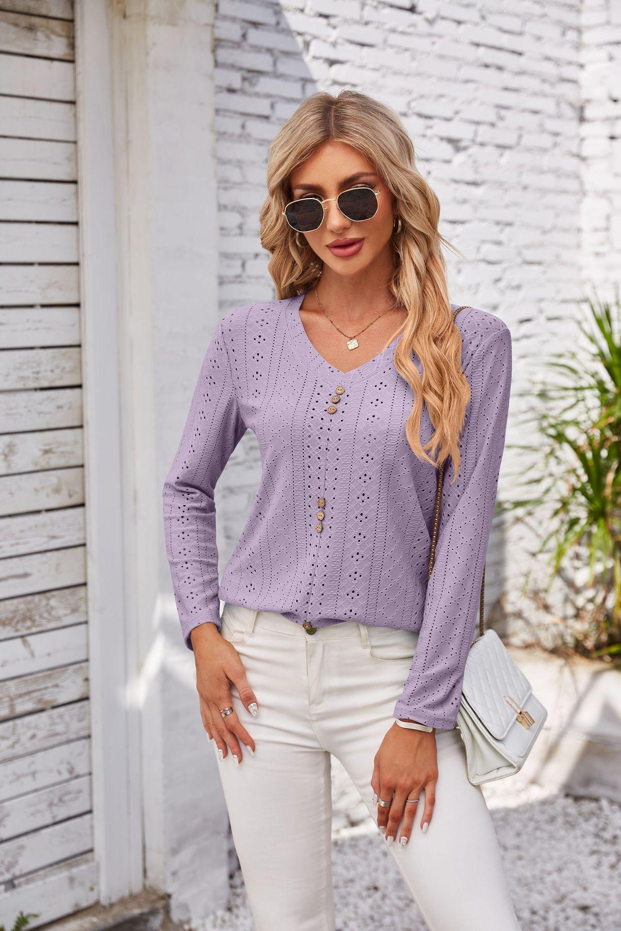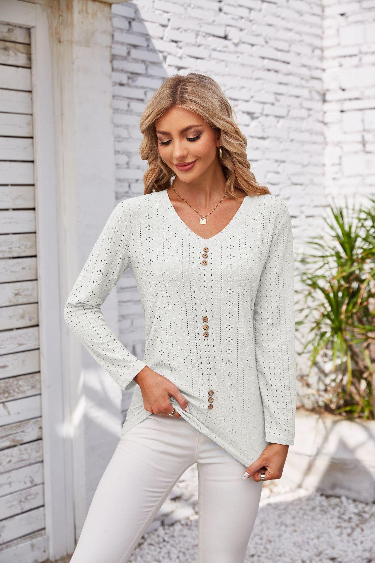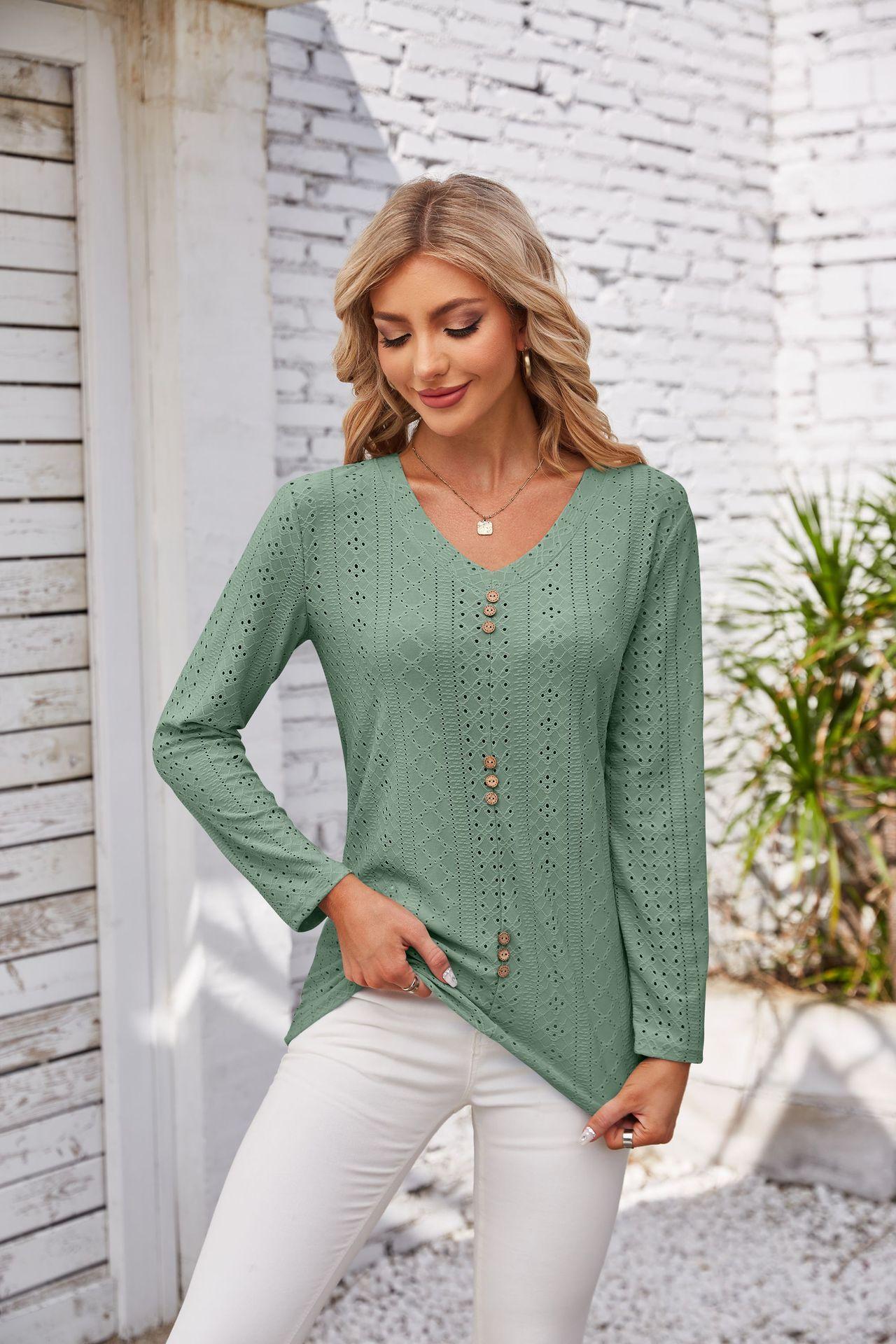 Camiseta de manga larga con cuello en V y botones sueltos para mujer, nueva camiseta informal de primavera y verano de comercio exterior transfronterizo europeo y americano de Amazon 2024