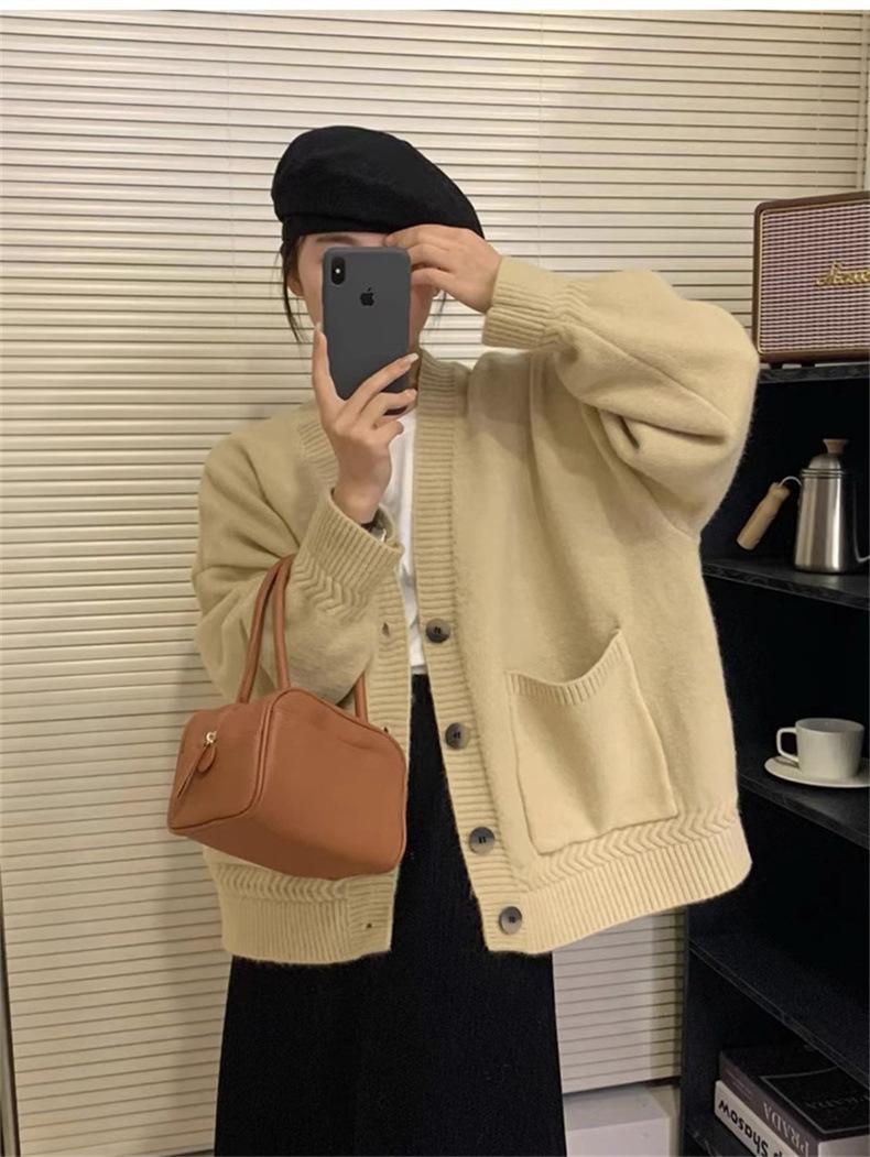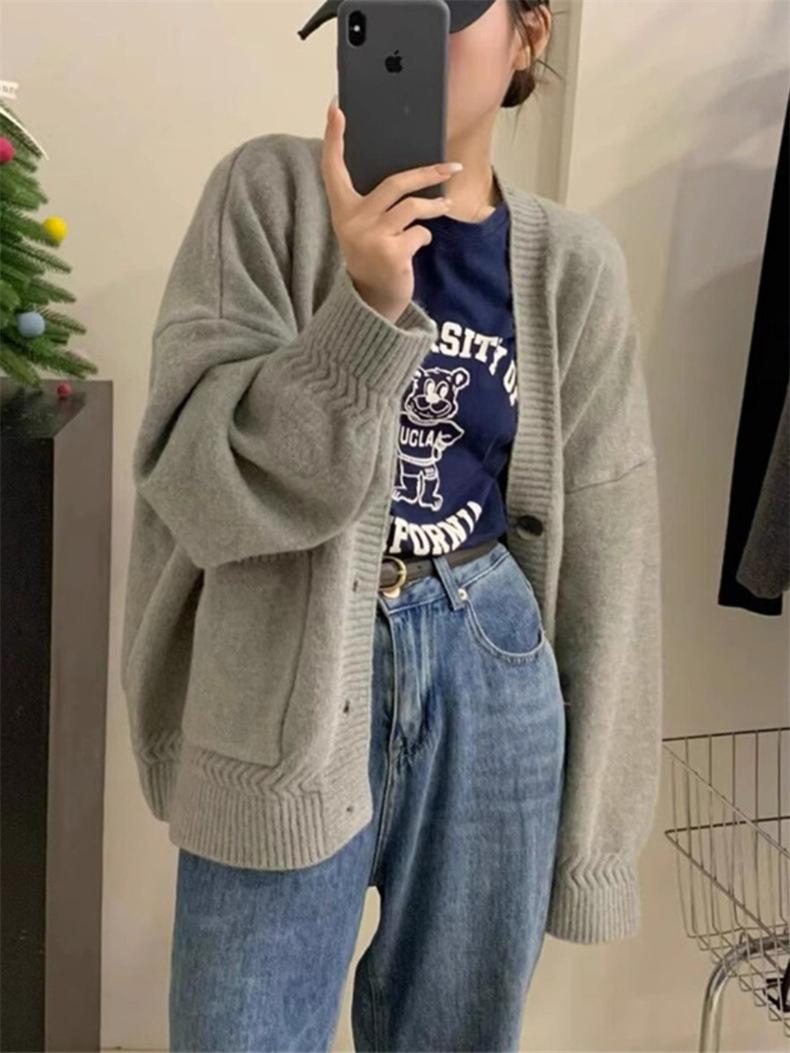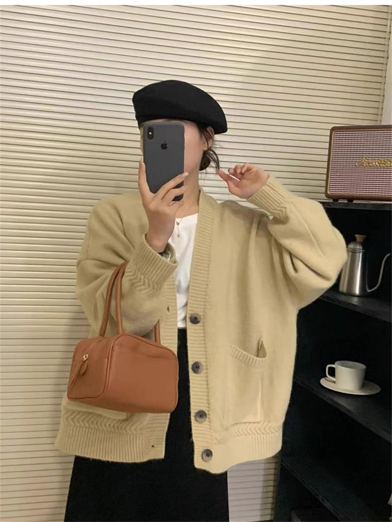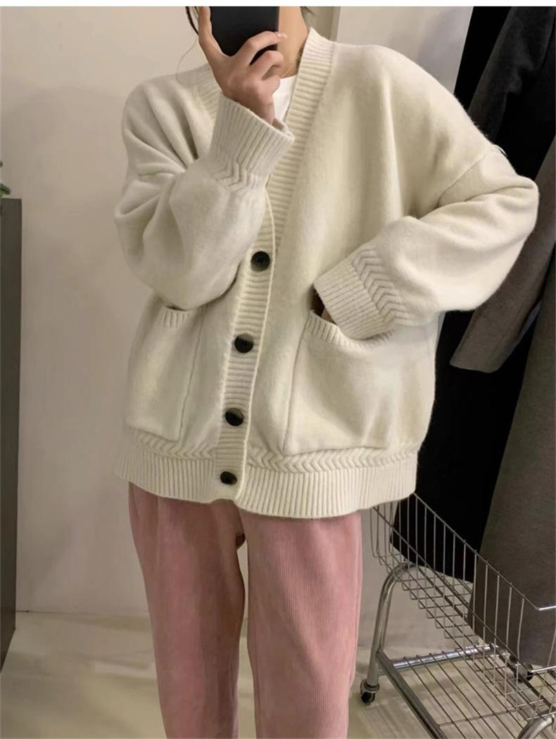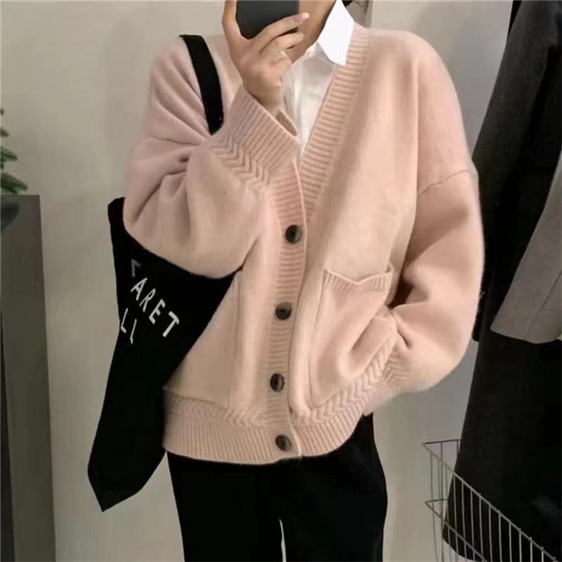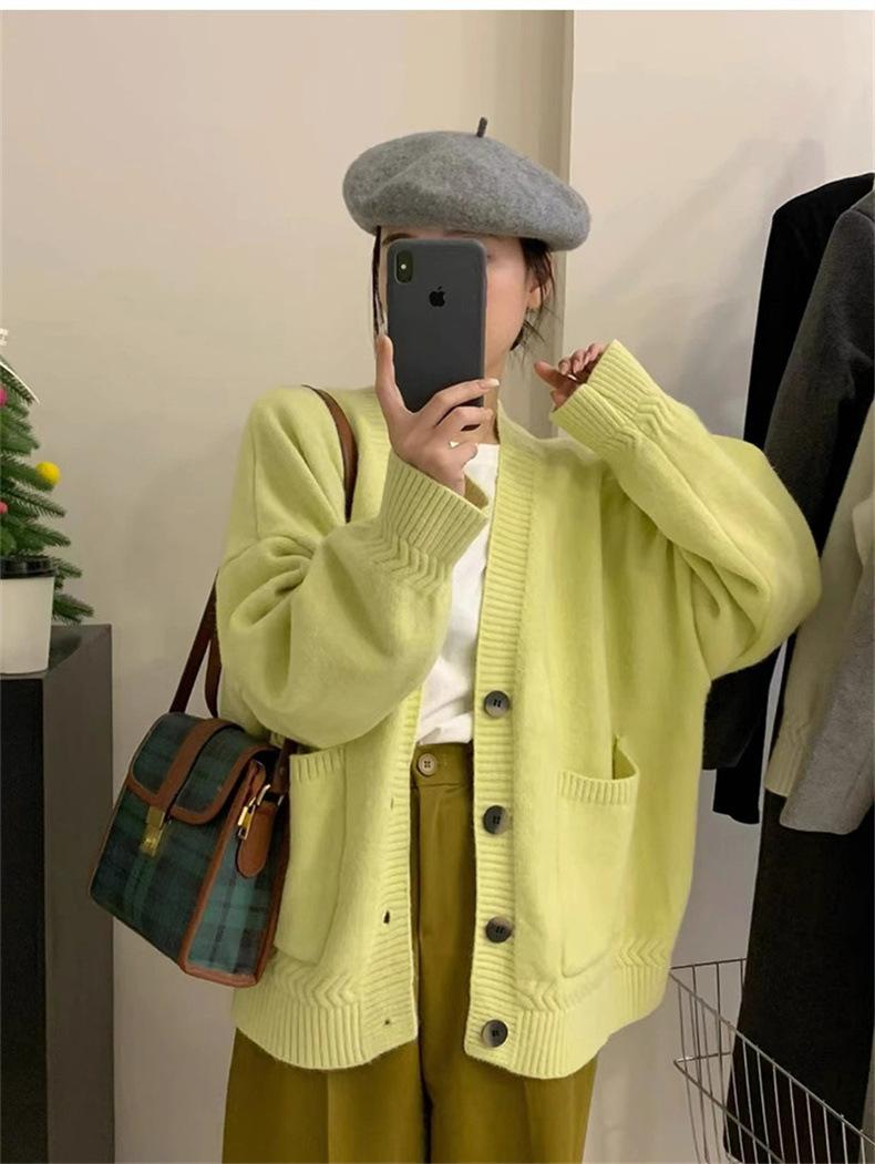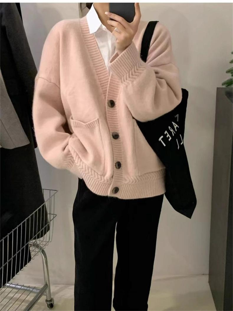 Otoño e Invierno Nuevo Suéter Holgado Perezoso Suave Ceroso Abrigo para Mujer Estilo Gentil Color Sólido Cuello en V Cárdigan de Punto para Mujer