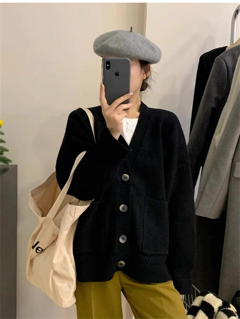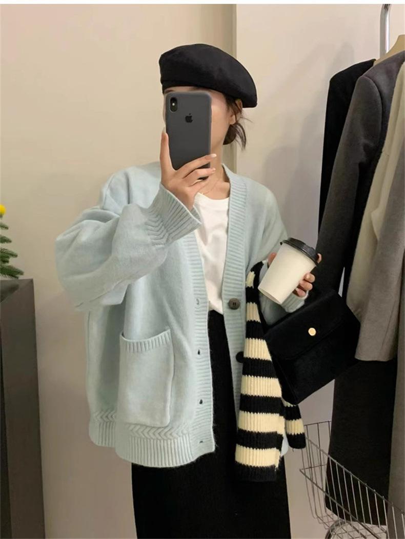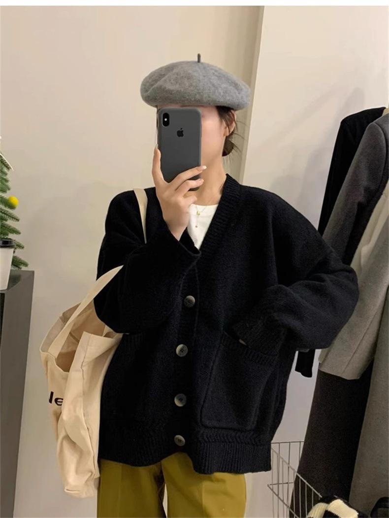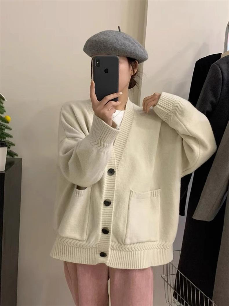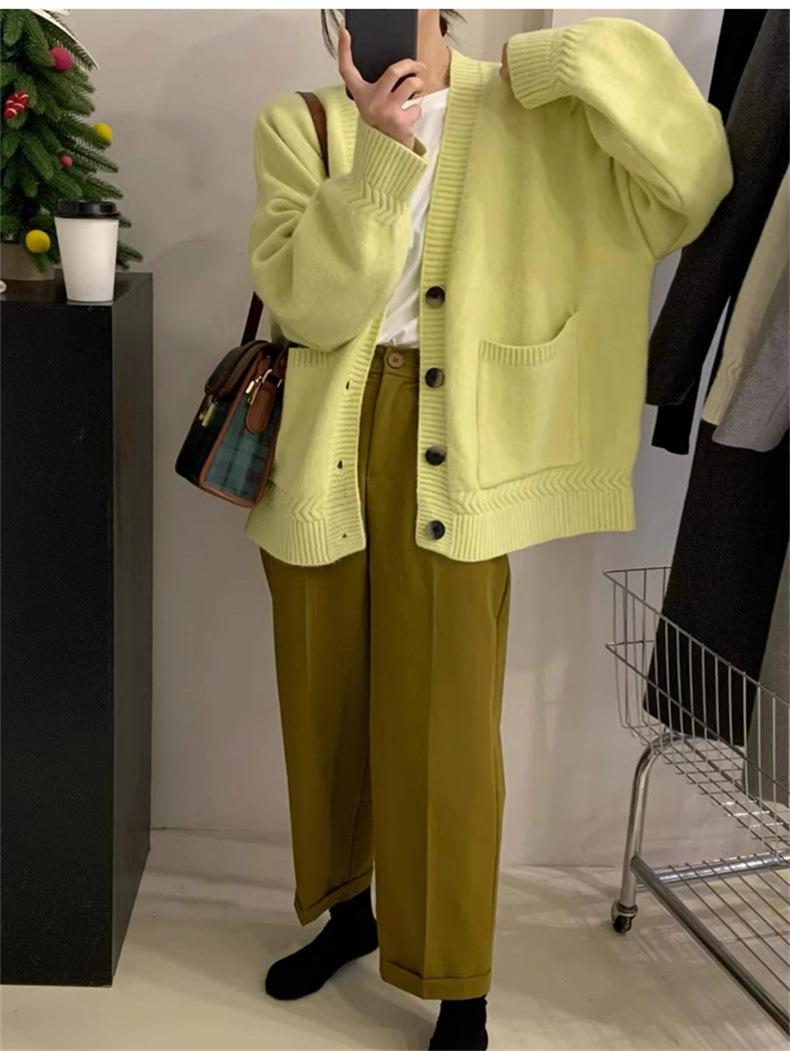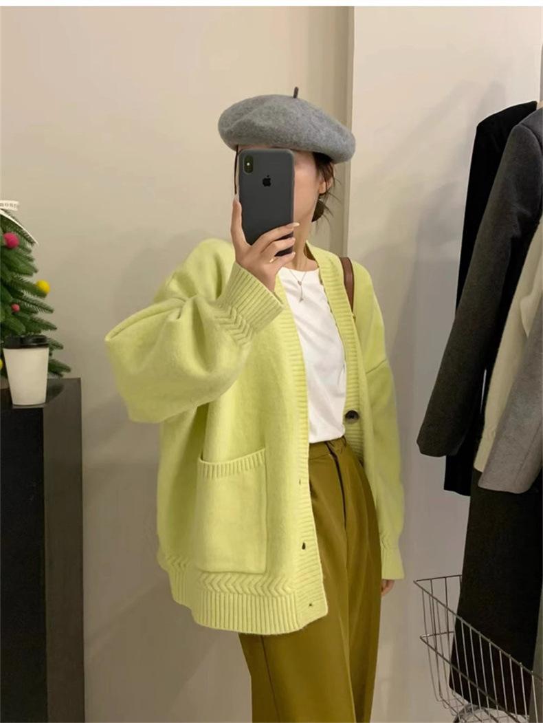 Otoño e Invierno Nuevo Suéter Holgado Perezoso Suave Ceroso Abrigo para Mujer Estilo Gentil Color Sólido Cuello en V Cárdigan de Punto para Mujer