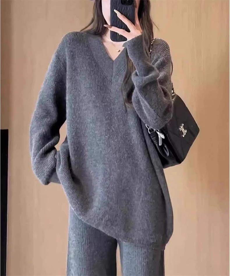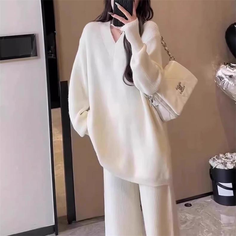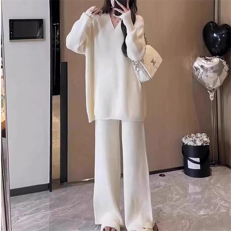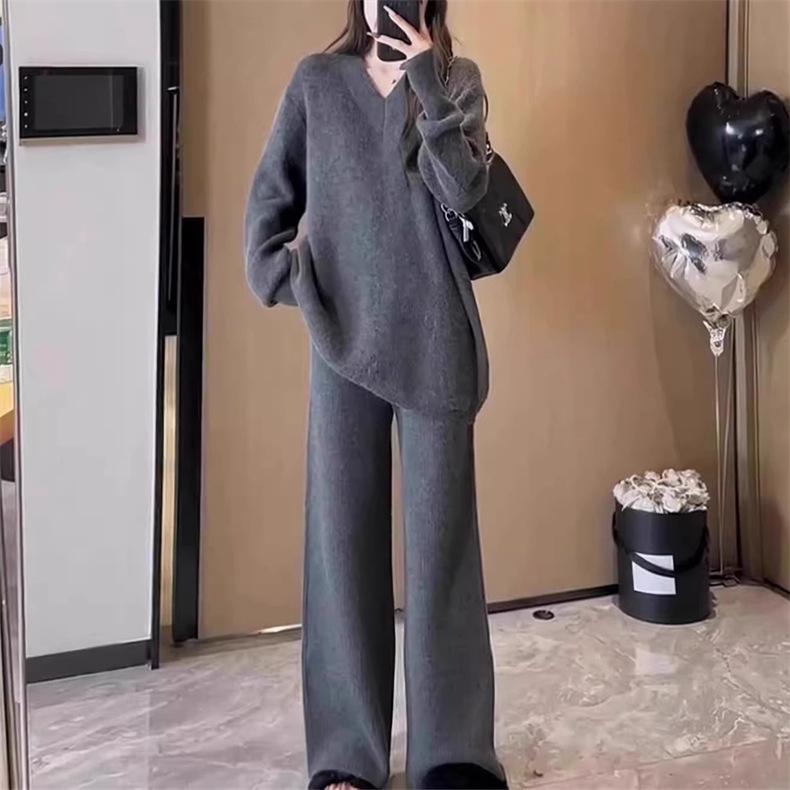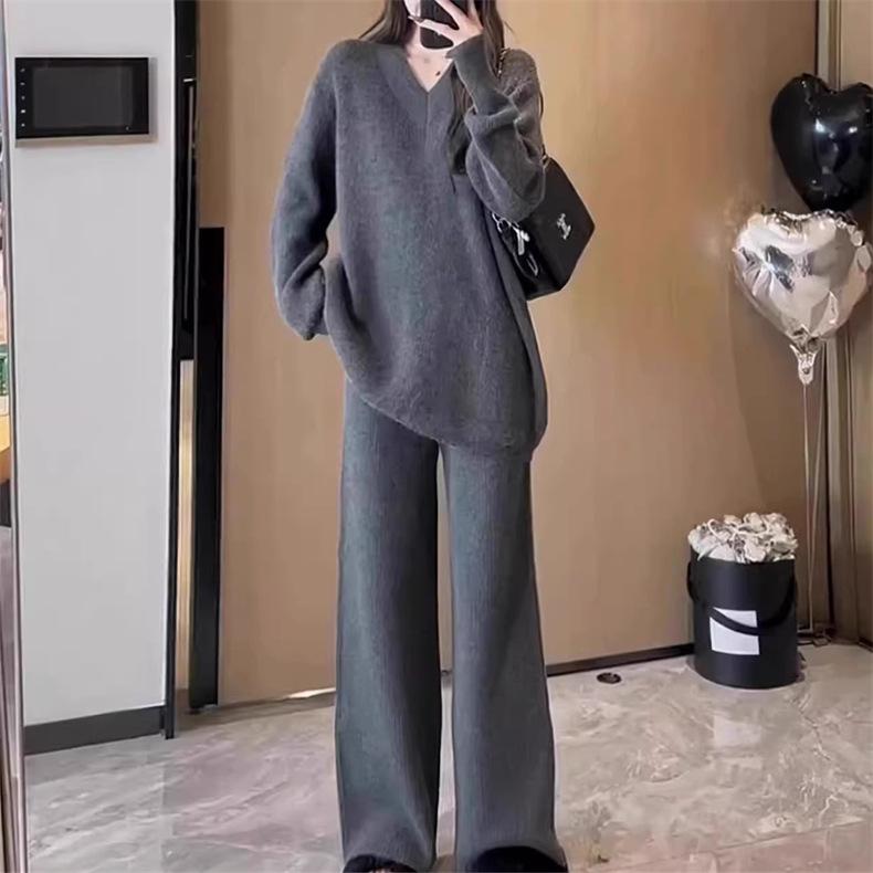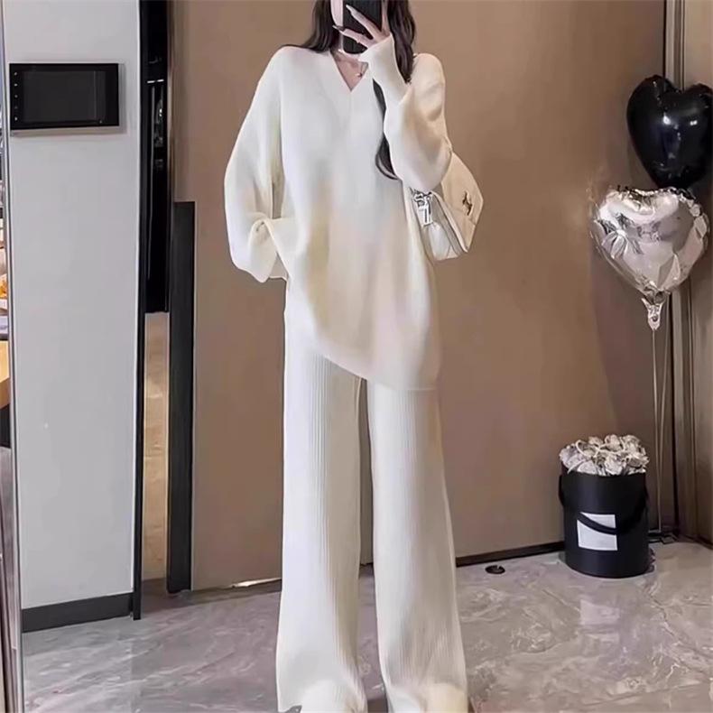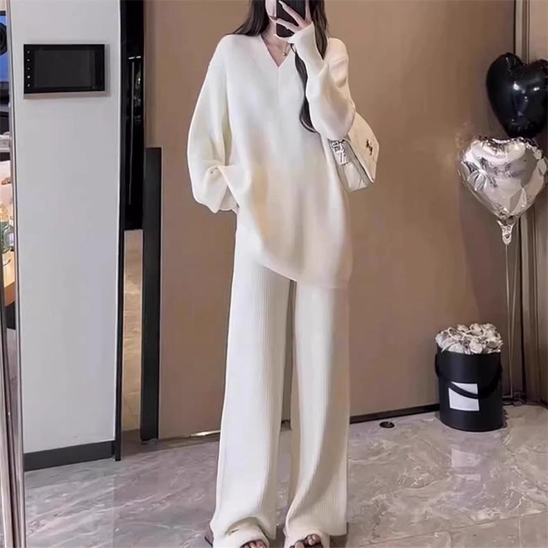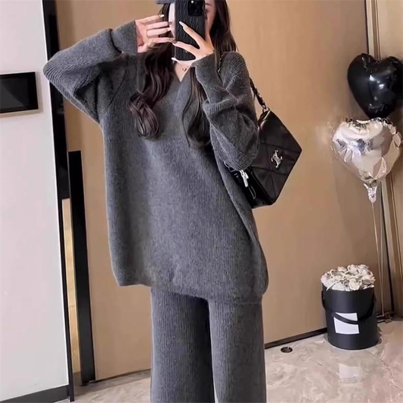 Suéter de punto con cuello en V estilo perezoso para mujer, conjunto de dos piezas de moda informal, pantalones anchos y rectos sueltos para otoño e invierno 2024