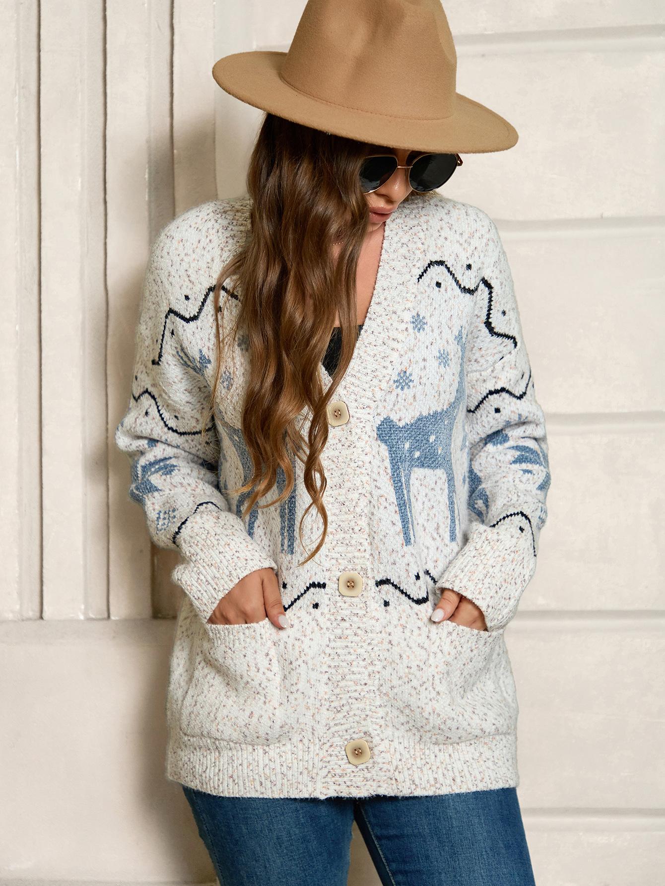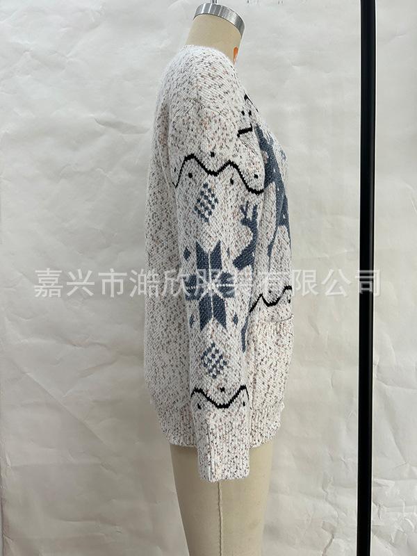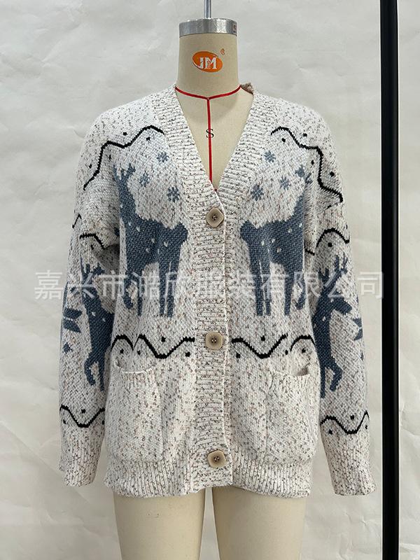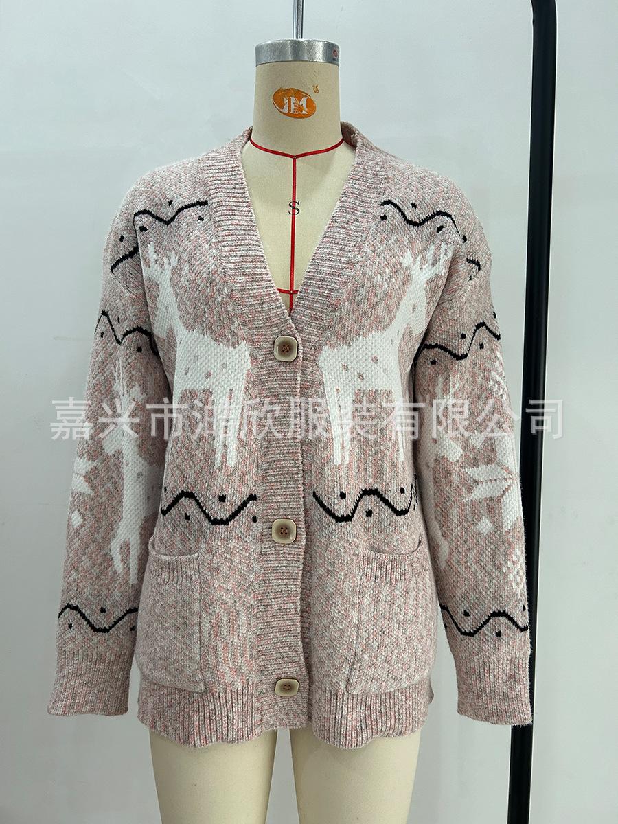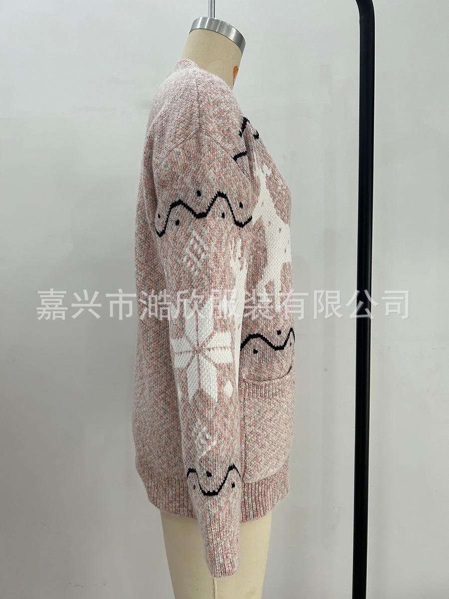 Cárdigan de Chenilla de Primavera y Otoño Comercio Exterior Transfronterizo Suéter de Mujer Jacquard de Alce Casual Chaqueta de Punto con Bolsillo de Solapa Pantalones para Mujer
