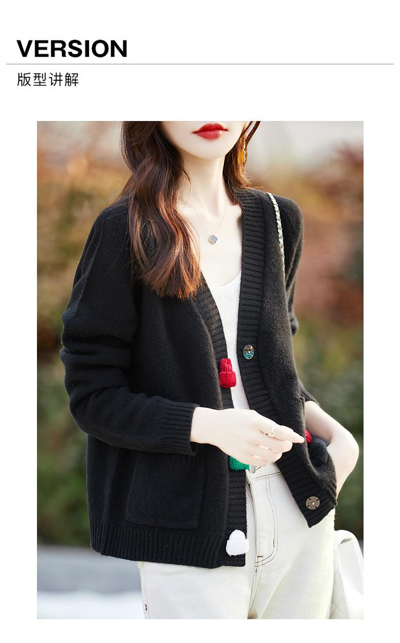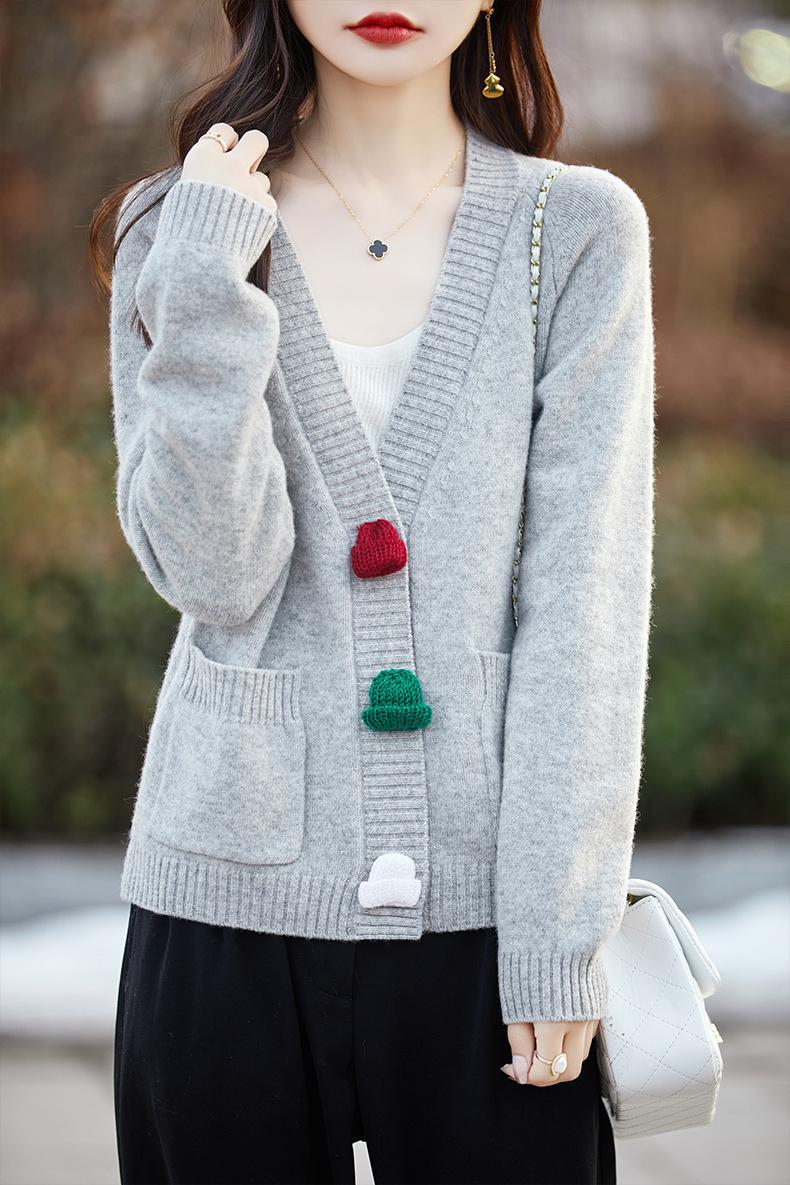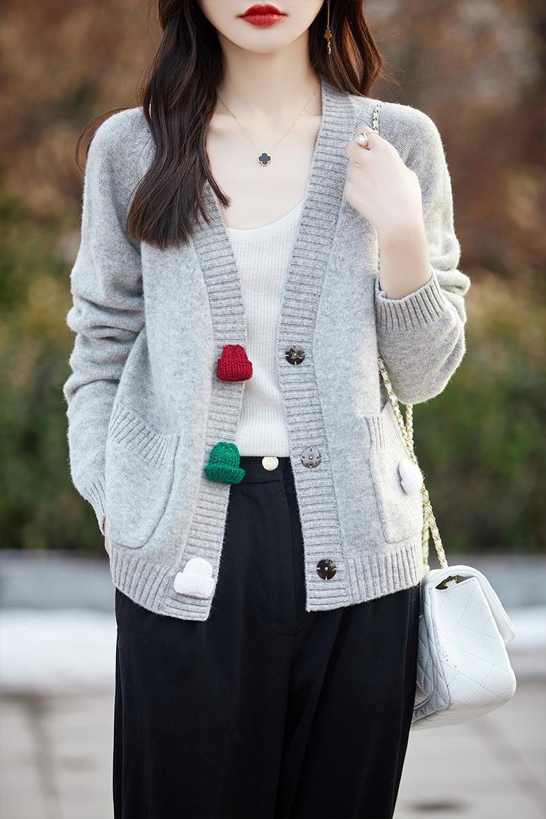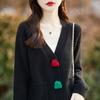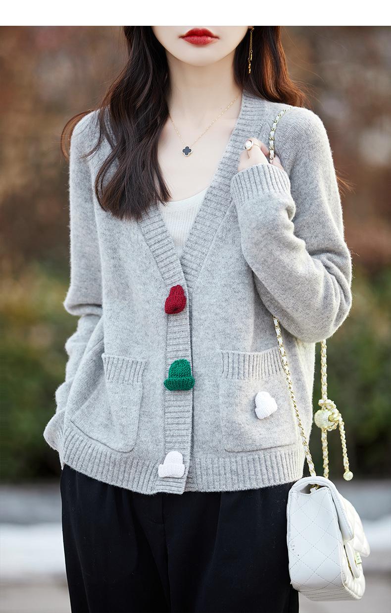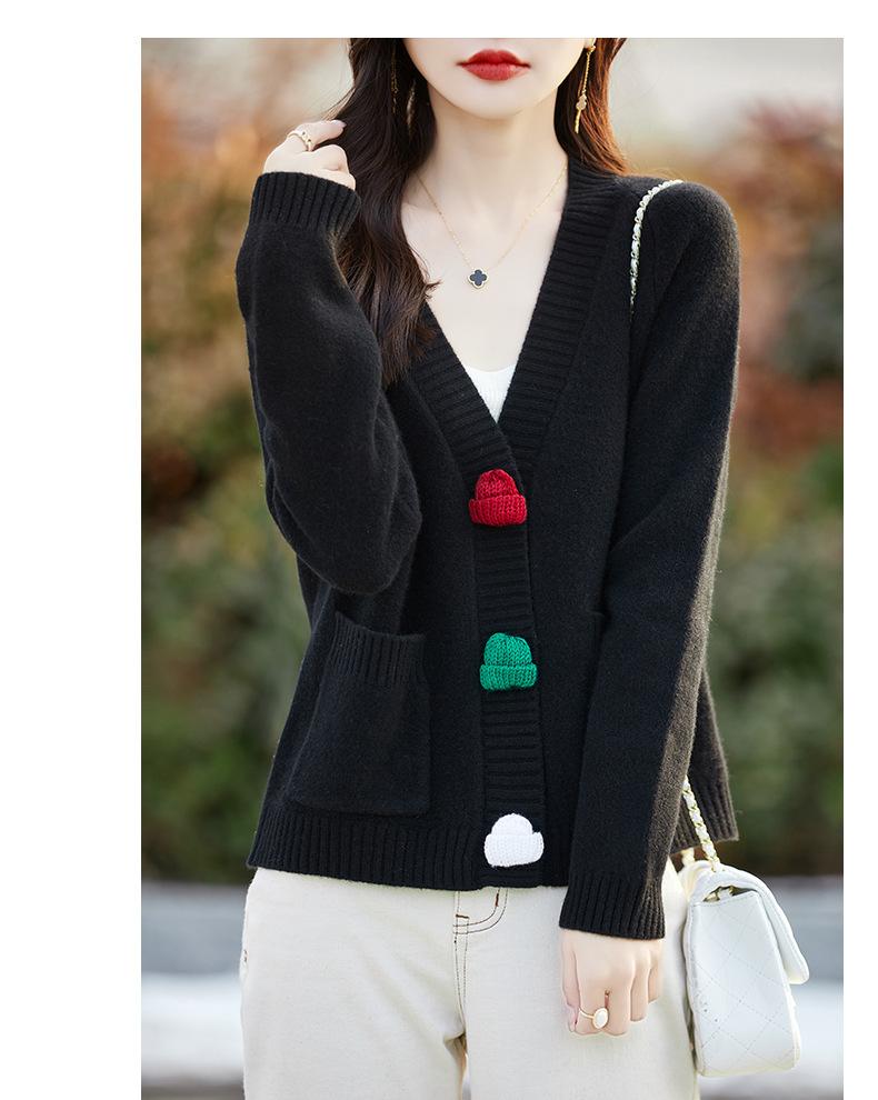 Cárdigan de lana nueva para mujer, otoño e invierno 2024, cuello en V, bolsillo, bordado, manga larga, chaqueta holgada de punto de cachemira.