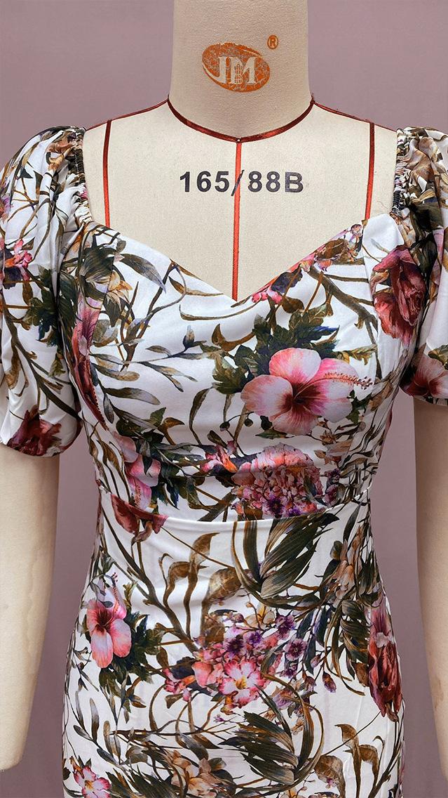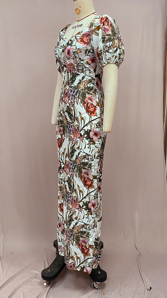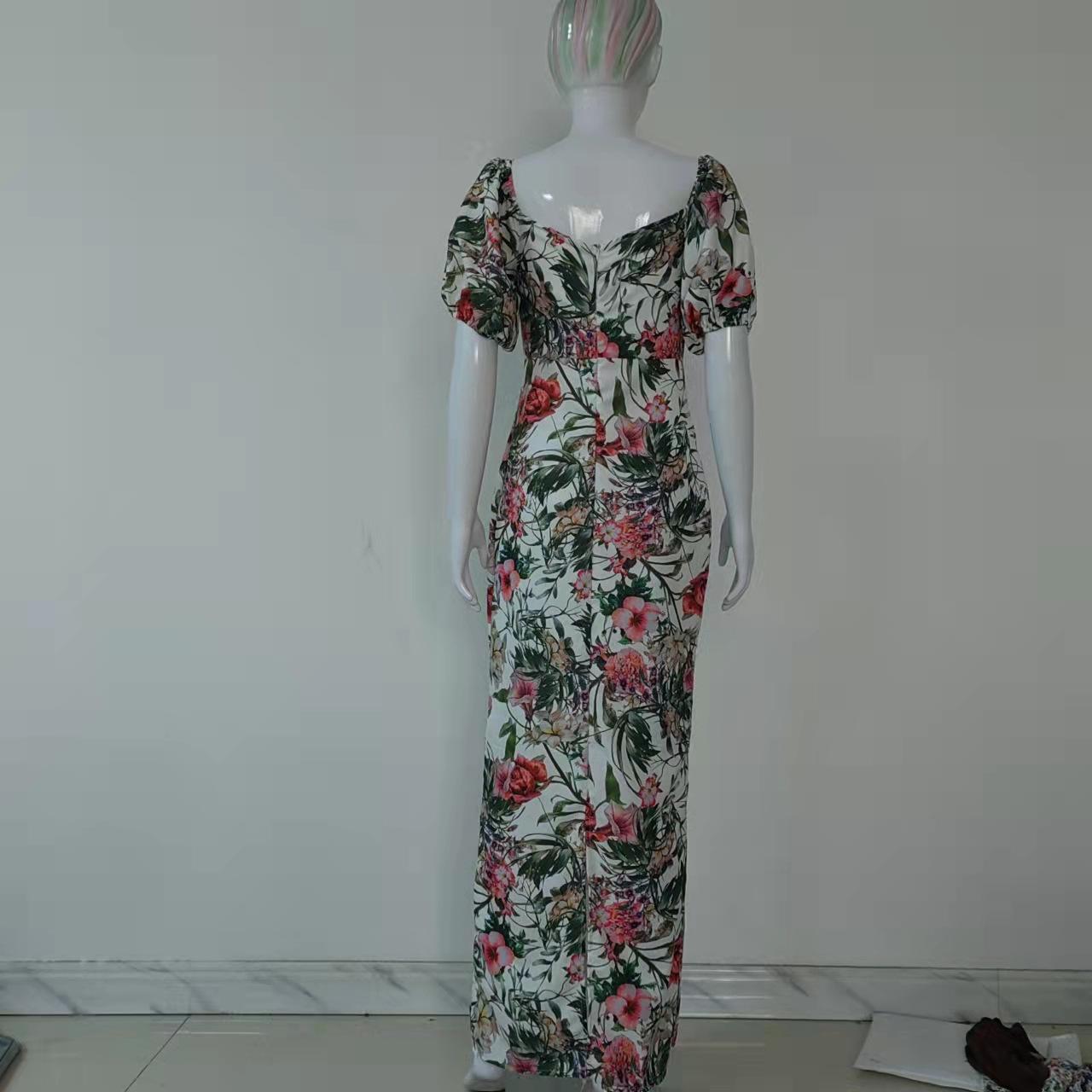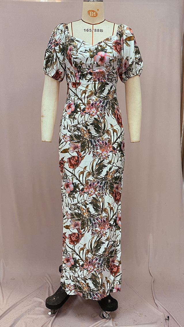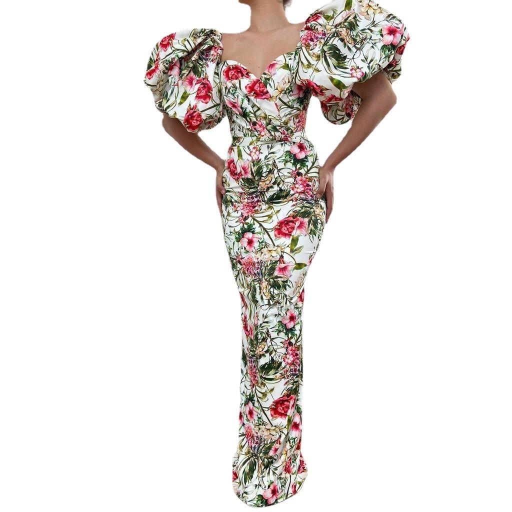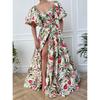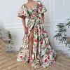 2025 Nuevo Vestido Europeo y Americano para Mujer Transfronterizo con Cuello en V de Gasa Estampada de Cintura Alta y Corte Slim Vestido de Manga Corta para Socialité